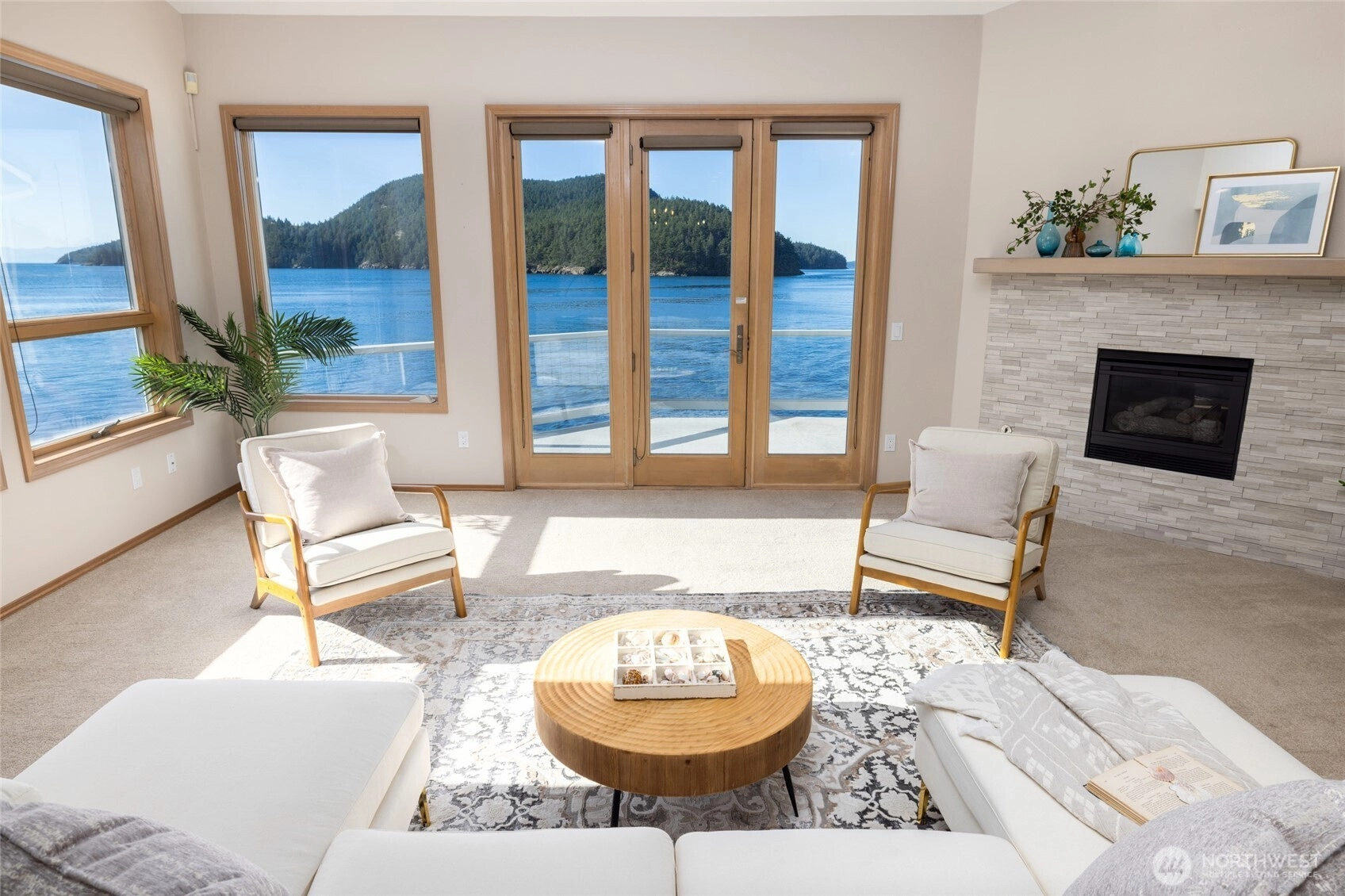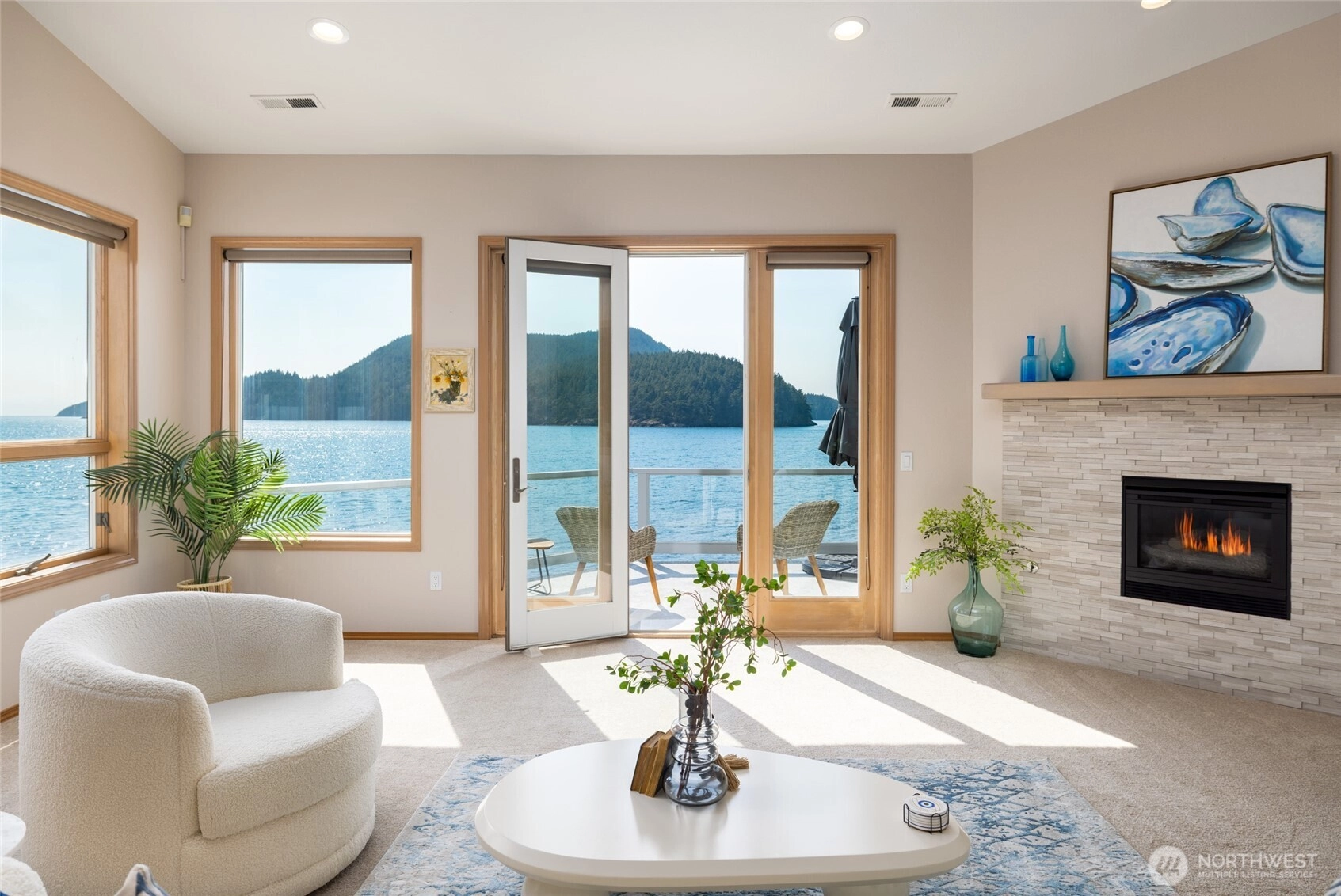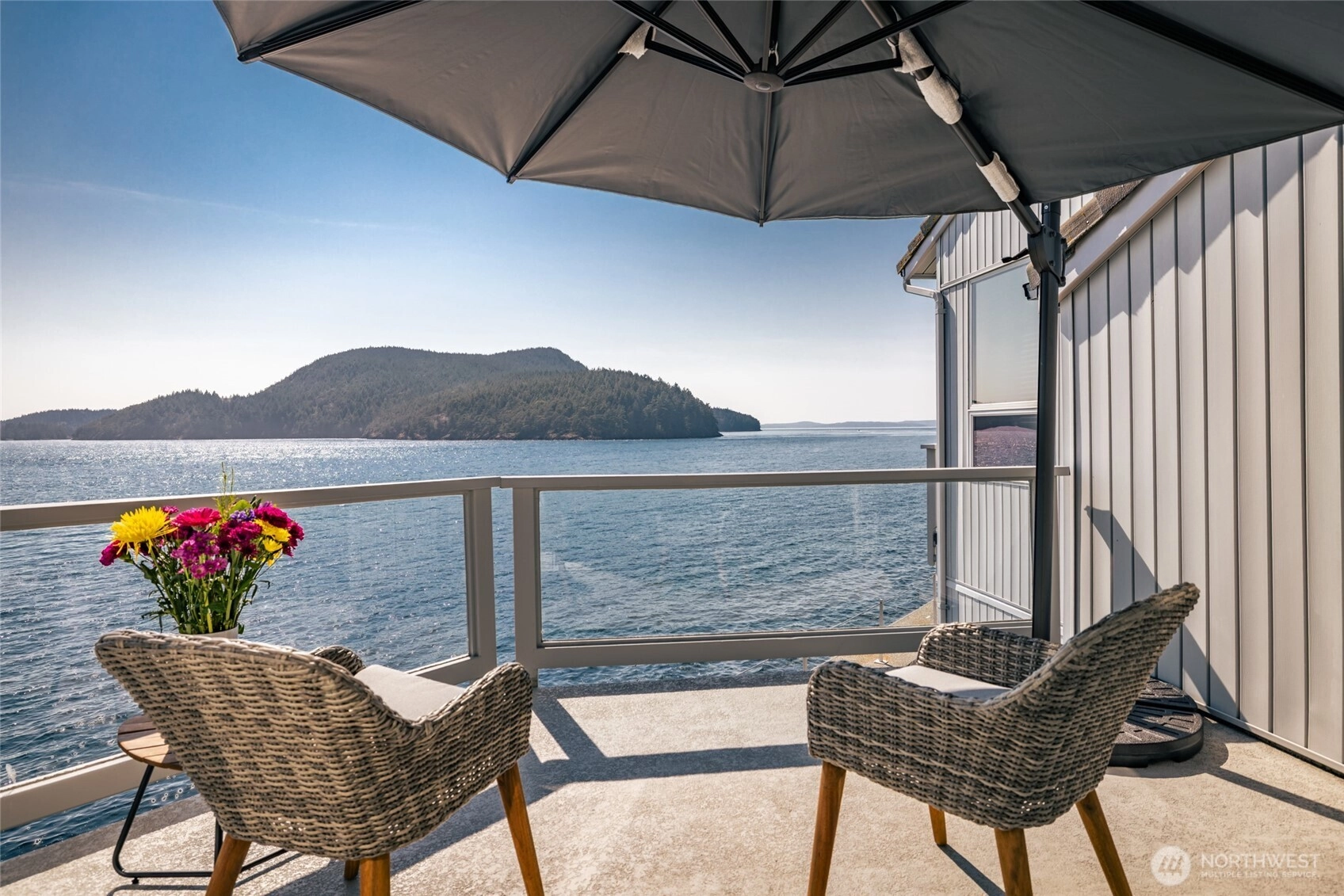 Waterfront Living large! Remodeled in 2019, this exquisite 2-bedroom condo by Burrows Bay offers unending views, sunsets, wildlife and many special features. Quartz countertops, LED lighting, skylights, new flooring and a lot of extra storage. With nine-foot ceilings, a private deck with storage, enclosed garage (with locked storage unit) and an additional outside parking space. Skyline amenities include tennis and pickle ball courts, waterfront parks, and clubhouse. The best Anacortes has to offer! These units don't come on the market often, don't miss this opportunity!