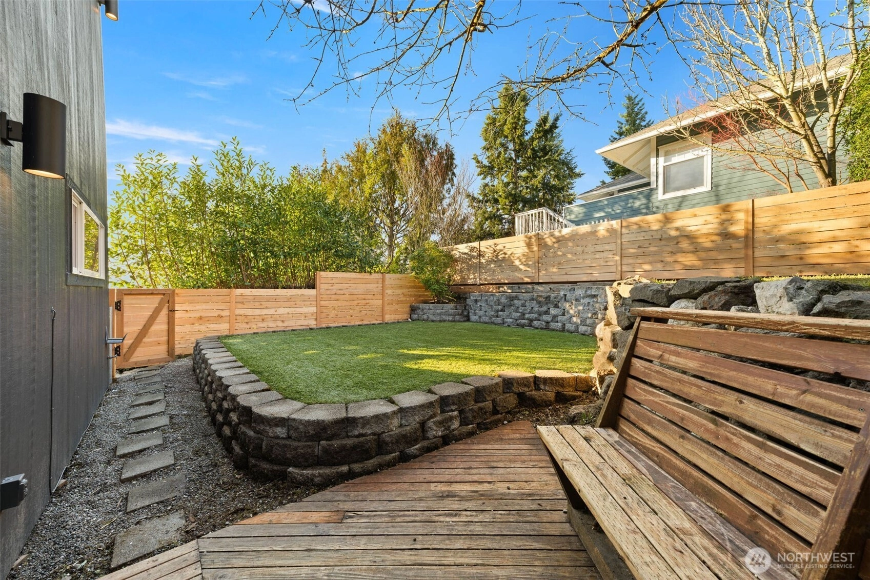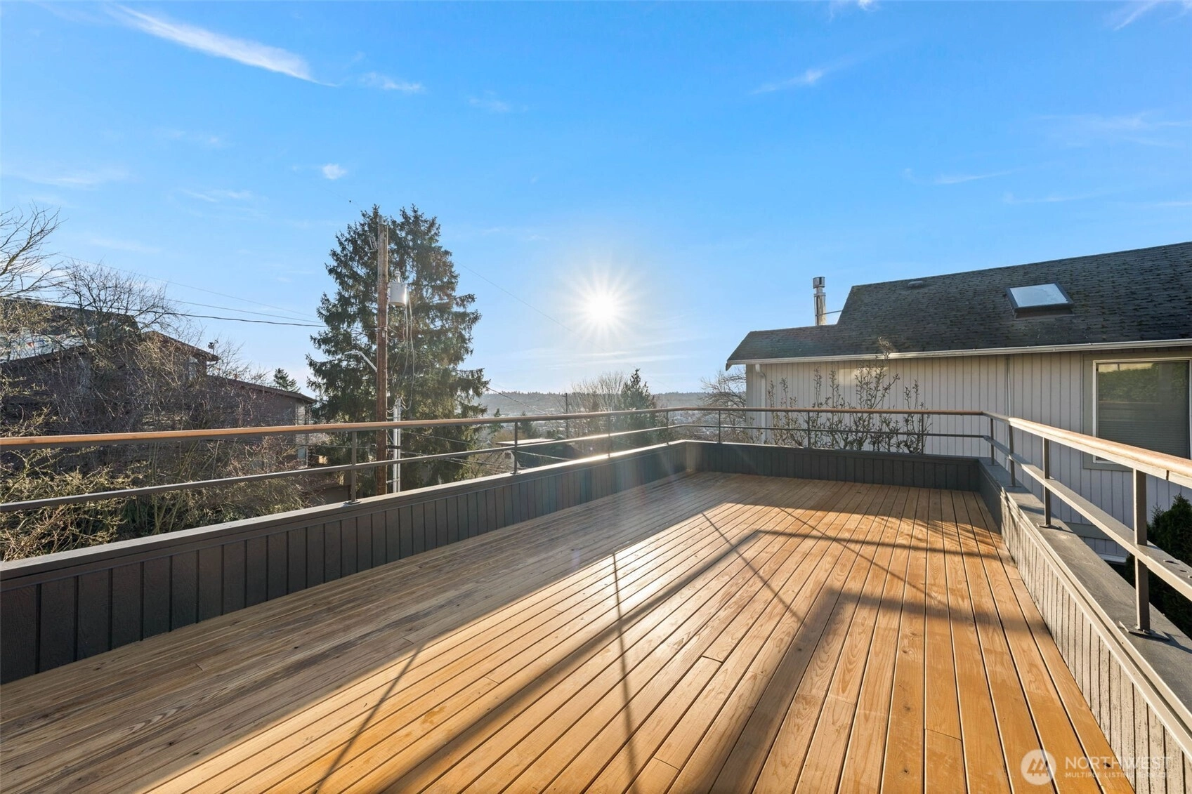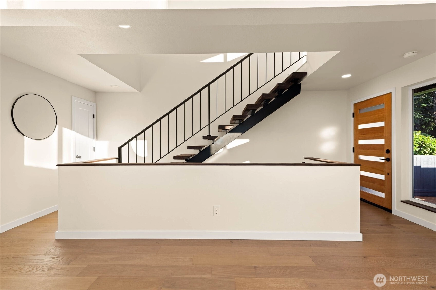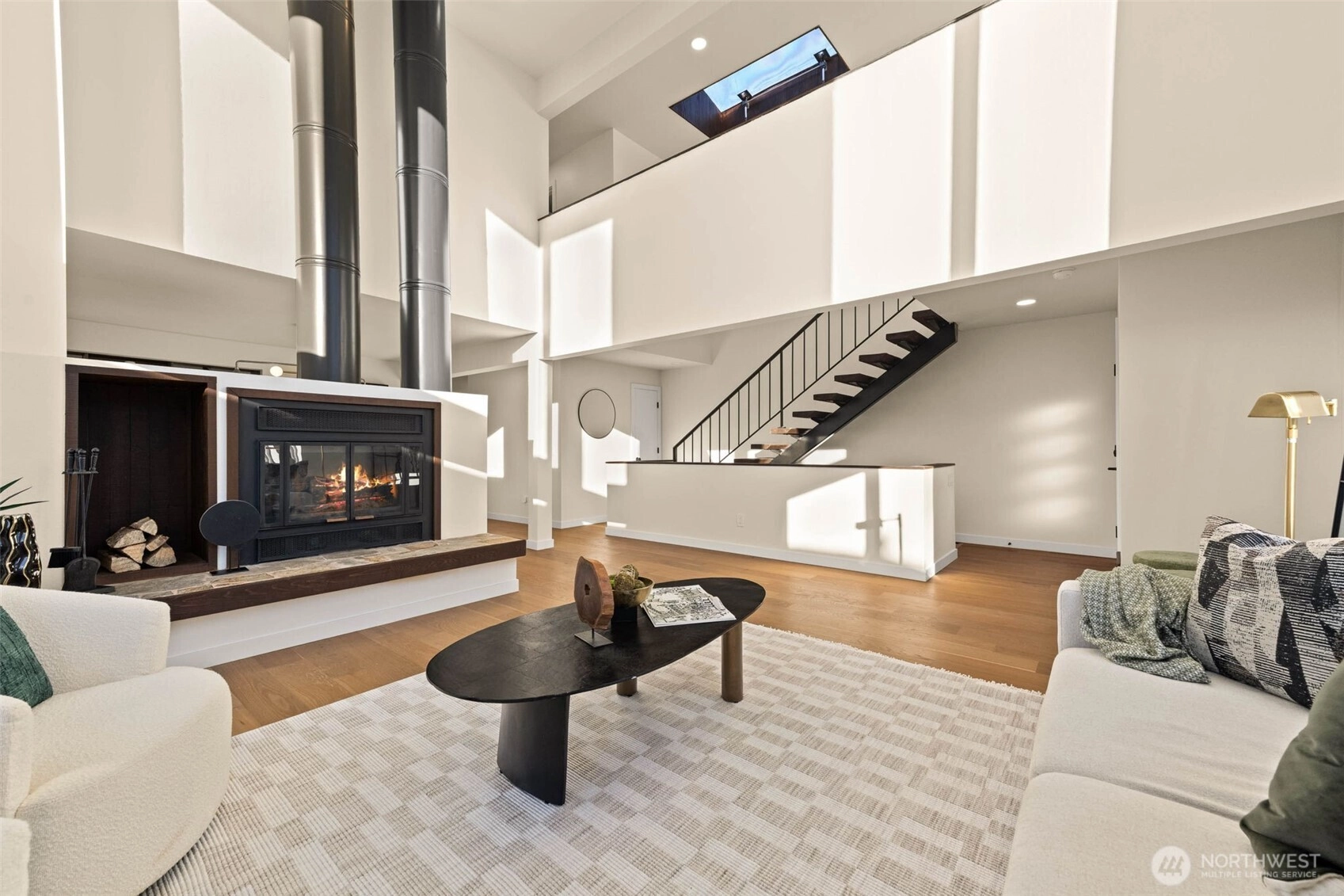 Perched above the city with sweeping views of the skyline, Puget Sound, and the Olympic Mountains, this custom Northwest Contemporary is a true architectural work of art. Designed around light, volume, and material, soaring vaulted ceilings and expansive picture windows flood the home with natural light, while natural wood-trimmed skylights draw the sky inward. Wide-plank engineered hardwood floors run throughout, grounding the dramatic architecture in warmth and cohesion, beautifully complementing the rich walnut detailing carried through the home. At the heart of the living space, a double-flue fireplace rises as the centerpiece — anchored by a stone hearth and wrapped in walnut trim beneath towering ceilings. The floating staircase with exposed wood treads and steel supports add architectural dimension, a true work of art. The primary suite offers breathtaking mountain views through oversized windows. Outdoors, enjoy a newly fenced, ultra-private backyard complete with a built-in seating area designed for entertaining and quiet evenings alike. A welcoming front courtyard creates an intimate entry experience, complemented by a detached two-car garage for added flexibility. Authentic Northwest Contemporary design. Iconic views. A home that is both timeless and unforgettable.