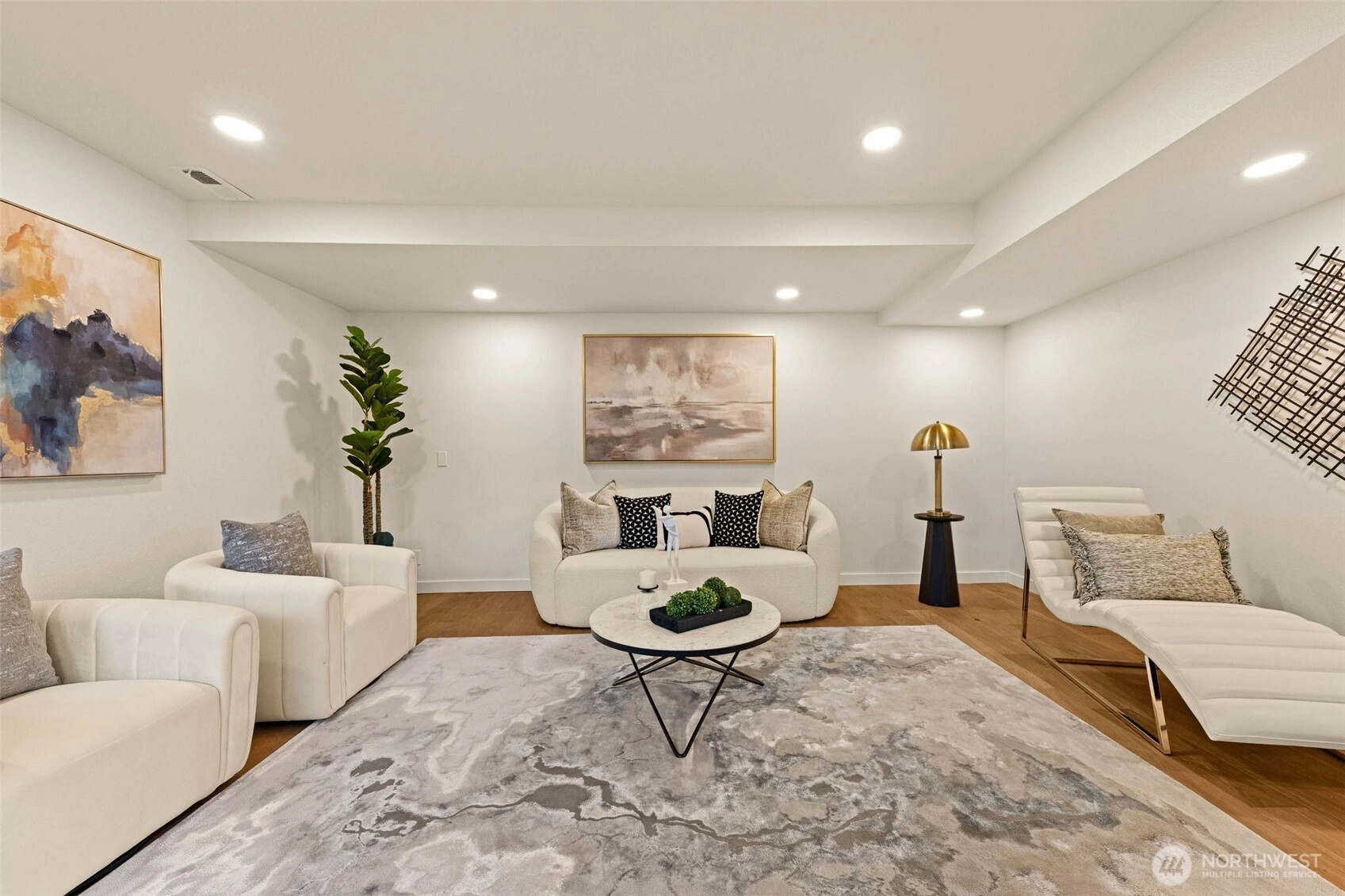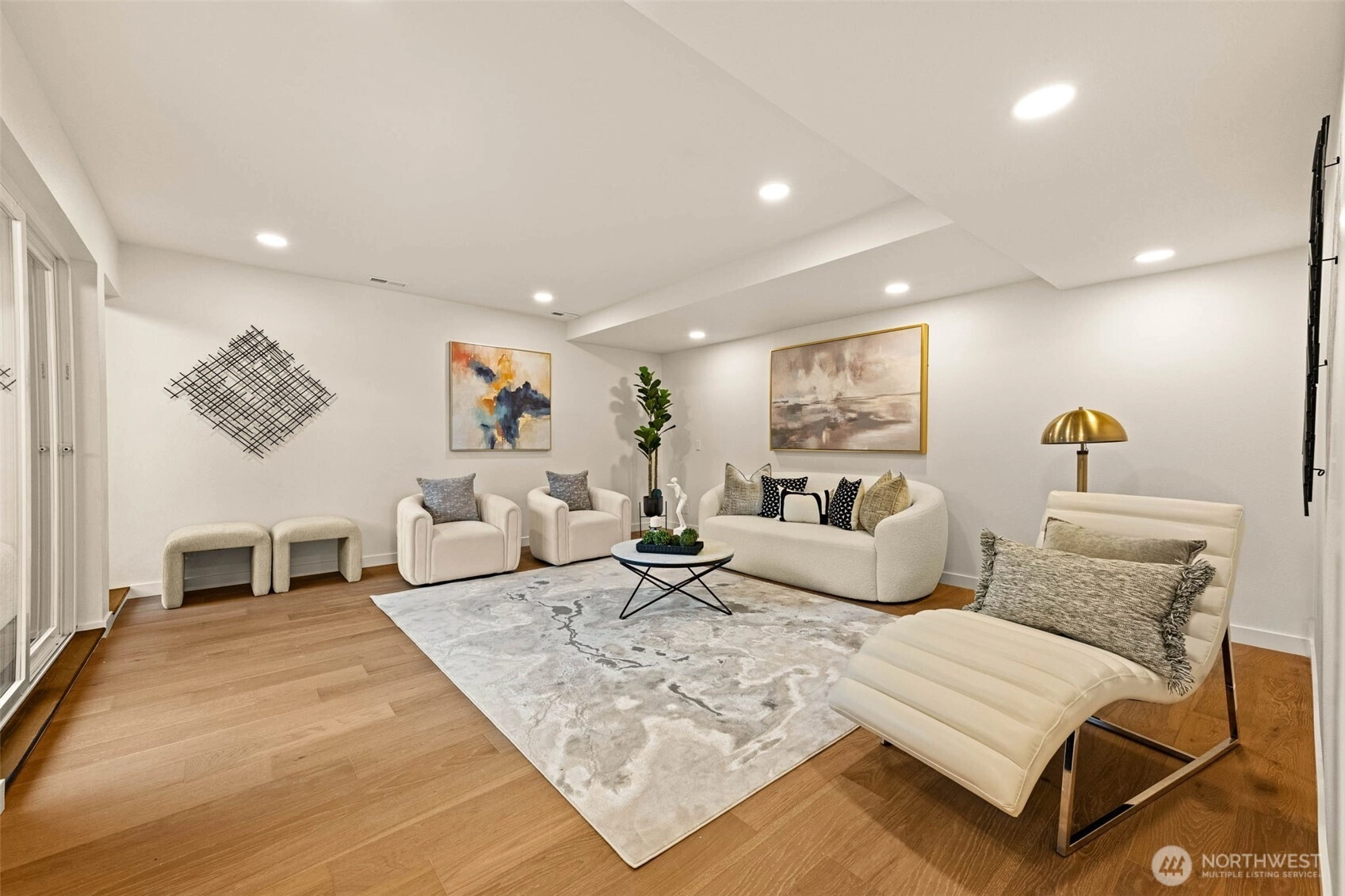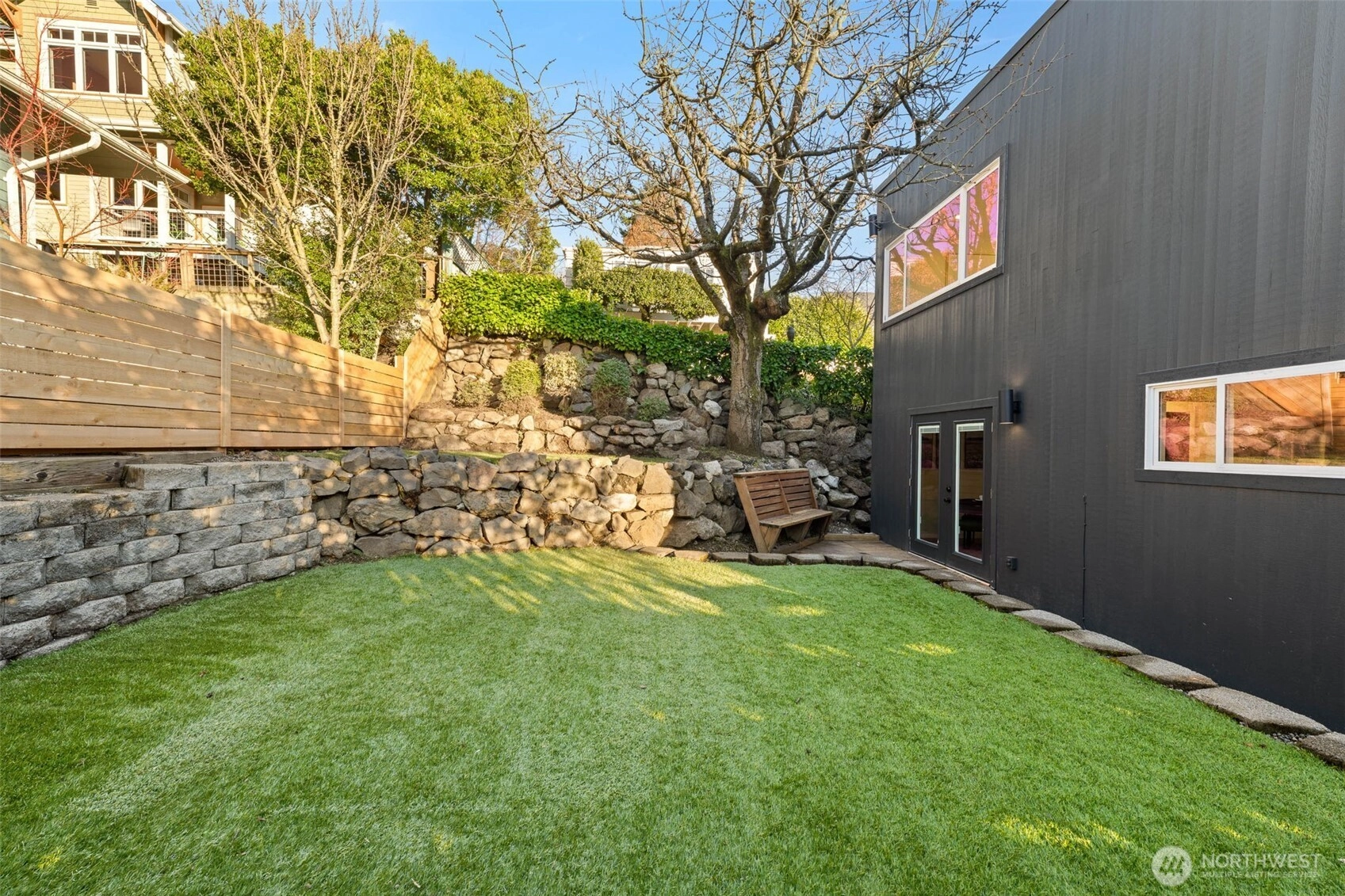 Perched above the city with sweeping views of the skyline, Puget Sound, and the Olympic Mountains, this custom Northwest Contemporary is a true architectural work of art. Designed around light, volume, and material, soaring vaulted ceilings and expansive picture windows flood the home with natural light, while natural wood-trimmed skylights draw the sky inward. Wide-plank engineered hardwood floors run throughout, grounding the dramatic architecture in warmth and cohesion, beautifully complementing the rich walnut detailing carried through the home. At the heart of the living space, a double-flue fireplace rises as the centerpiece — anchored by a stone hearth and wrapped in walnut trim beneath towering ceilings. The floating staircase with exposed wood treads and steel supports add architectural dimension, a true work of art. The primary suite offers breathtaking mountain views through oversized windows. Outdoors, enjoy a newly fenced, ultra-private backyard complete with a built-in seating area designed for entertaining and quiet evenings alike. A welcoming front courtyard creates an intimate entry experience, complemented by a detached two-car garage for added flexibility. Authentic Northwest Contemporary design. Iconic views. A home that is both timeless and unforgettable.
