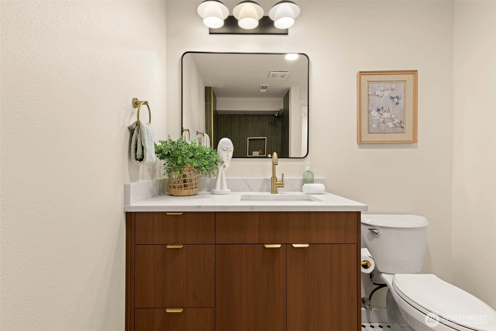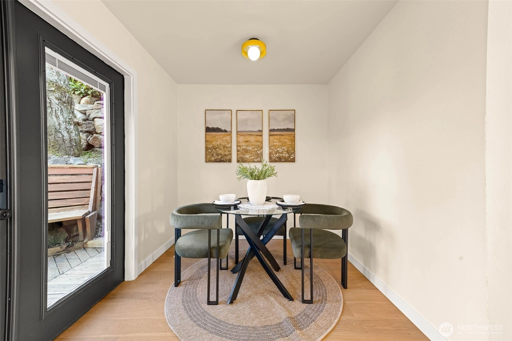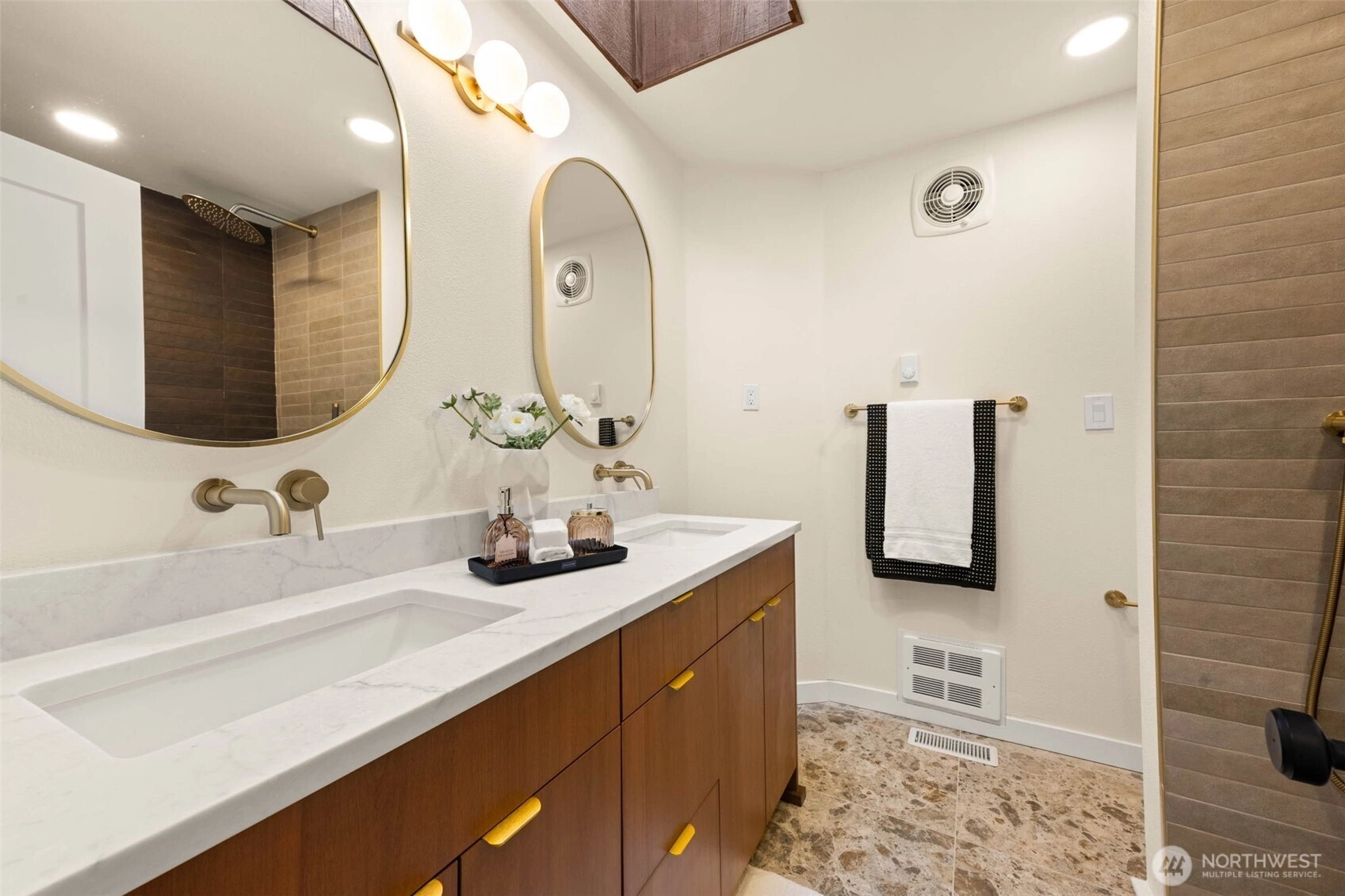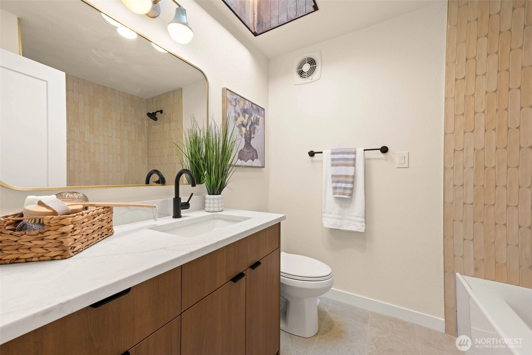 Perched above the city with sweeping views of the skyline, Puget Sound, and the Olympic Mountains, this custom Northwest Contemporary is a true architectural work of art. Designed around light, volume, and material, soaring vaulted ceilings and expansive picture windows flood the home with natural light, while natural wood-trimmed skylights draw the sky inward. Wide-plank engineered hardwood floors run throughout, grounding the dramatic architecture in warmth and cohesion, beautifully complementing the rich walnut detailing carried through the home. At the heart of the living space, a double-flue fireplace rises as the centerpiece — anchored by a stone hearth and wrapped in walnut trim beneath towering ceilings. The floating staircase with exposed wood treads and steel supports add architectural dimension, a true work of art. The primary suite offers breathtaking mountain views through oversized windows. Outdoors, enjoy a newly fenced, ultra-private backyard complete with a built-in seating area designed for entertaining and quiet evenings alike. A welcoming front courtyard creates an intimate entry experience, complemented by a detached two-car garage for added flexibility. Authentic Northwest Contemporary design. Iconic views. A home that is both timeless and unforgettable.