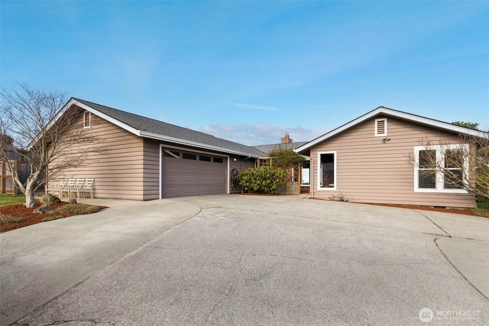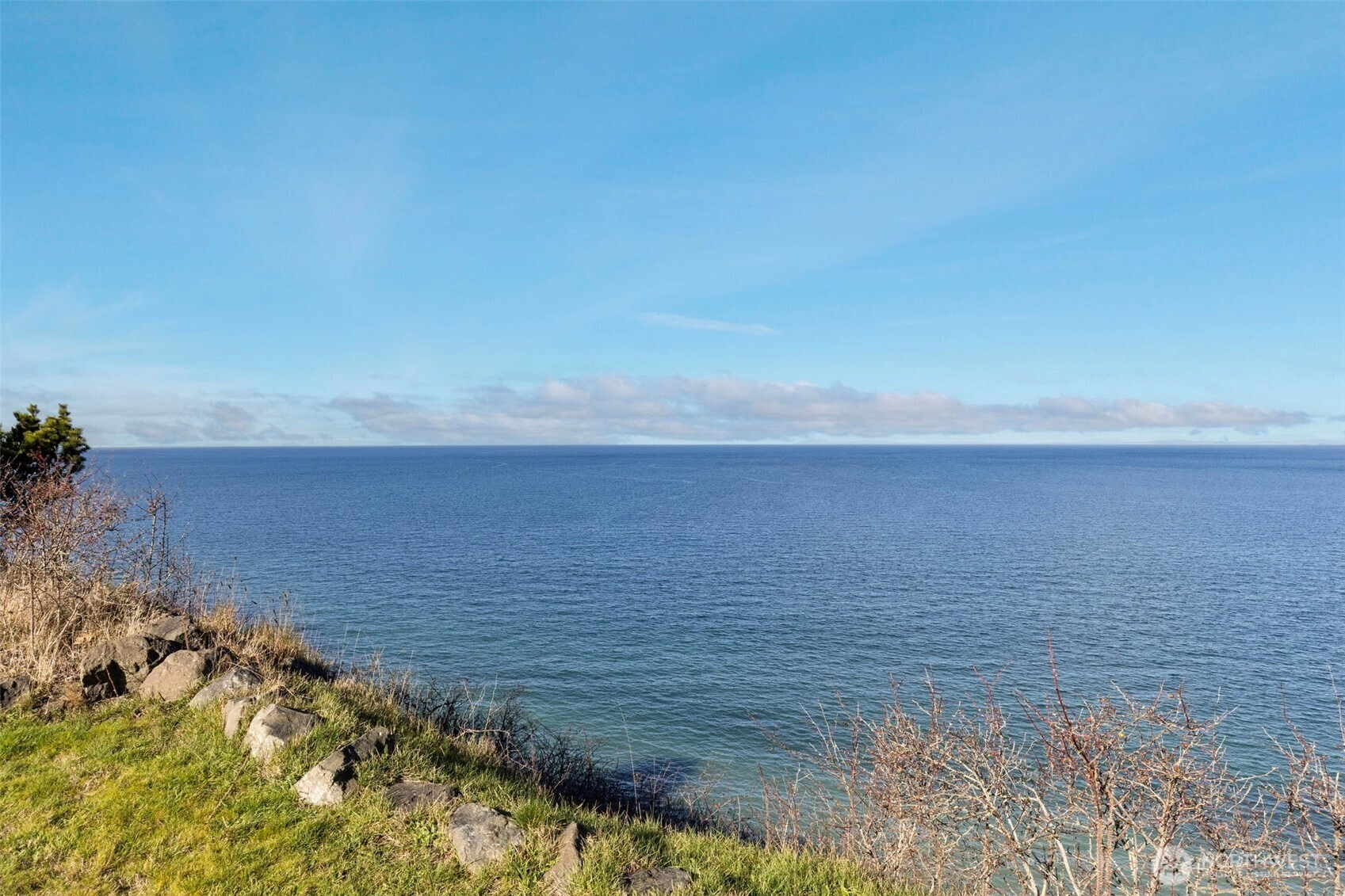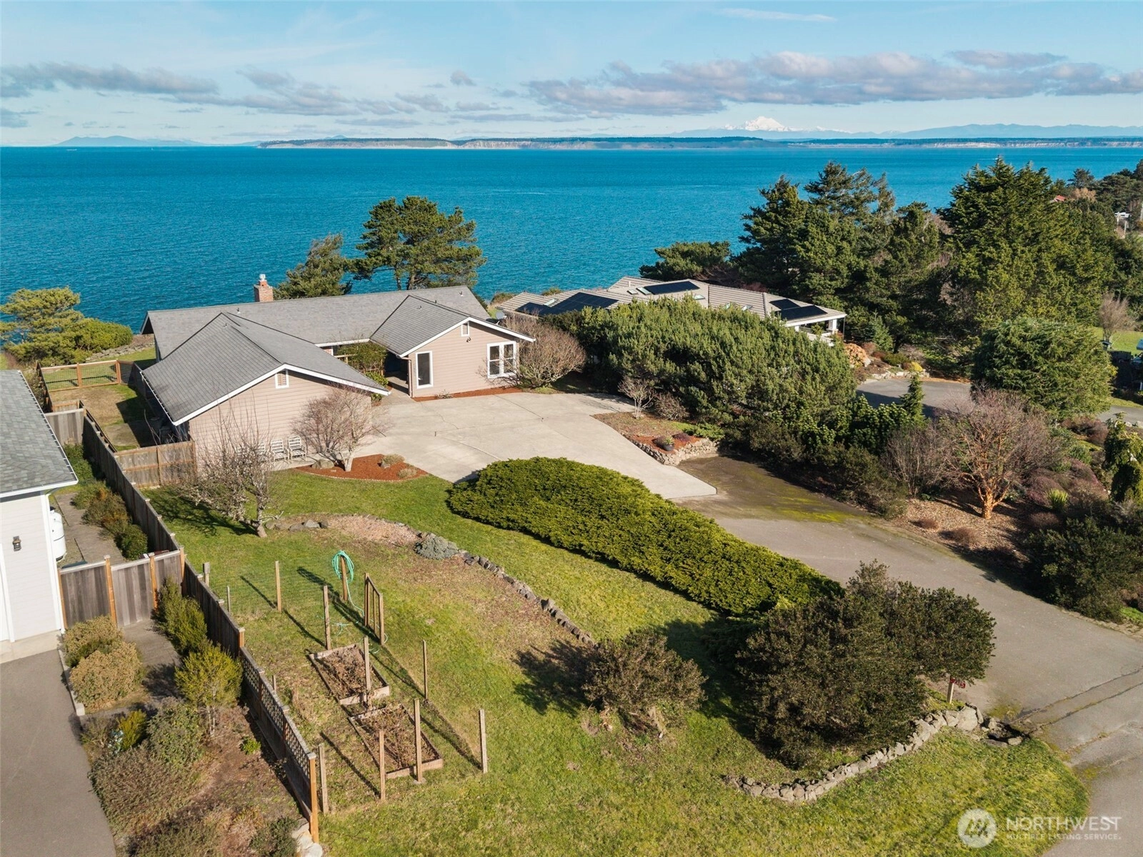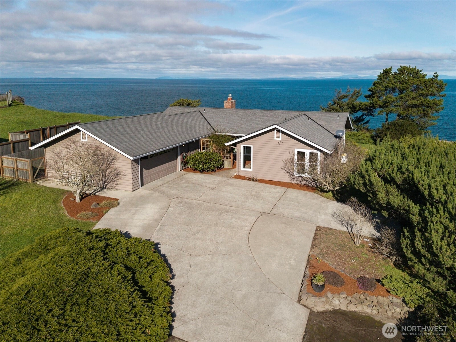 Expansive, panoramic views of the Strait of Juan de Fuca, the San Juan Islands, the Cascade Mountains, and Whidbey Island set the tone for this exceptional Port Townsend home. Perched on four lots in a quiet, off-the-beaten-path setting, the property offers rare privacy while remaining in the heart of town. Designed for comfortable main-level living, the home features zero-threshold entry from the attached two-car garage, creating seamless accessibility. The primary bedroom with ensuite bath opens directly onto the deck—an extraordinary vantage point for soaking in the ever-changing water and mountain views. Nearly every room in the home captures a breathtaking outlook. The user-friendly kitchen is both warm and functional, highlighted by a handmade wooden countertop crafted by the seller’s son—an artisan detail that adds character and heart. Two fireplaces—one wood-burning and one propane—offer cozy gathering spaces year-round. Downstairs, a spacious recreation room and third bedroom with a ¾ bath provide ideal flexibility for guests, hobbies, or multi-generational living. A rare opportunity to enjoy sweeping views, generous space, and peaceful privacy—all just moments from everything Port Townsend has to offer.