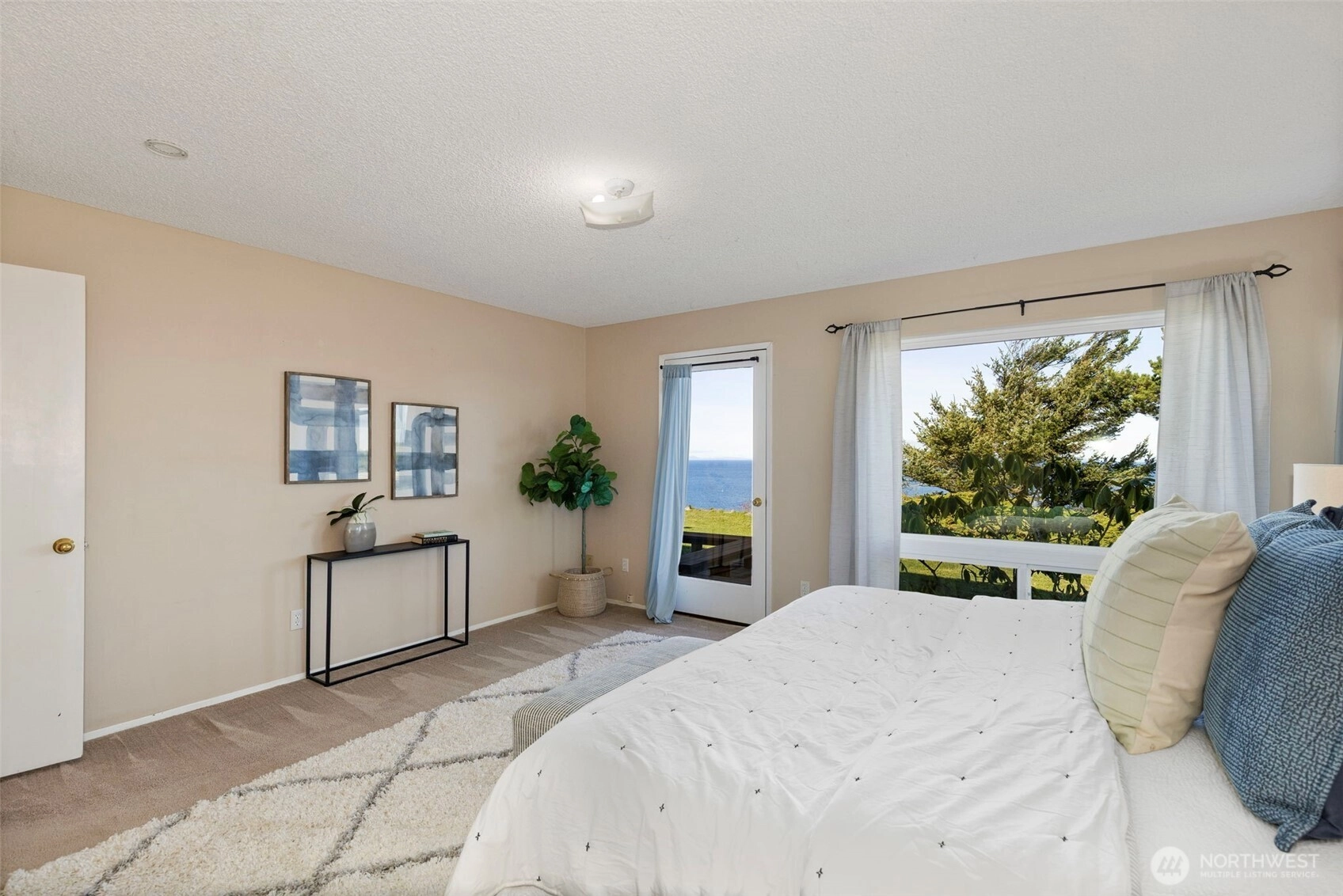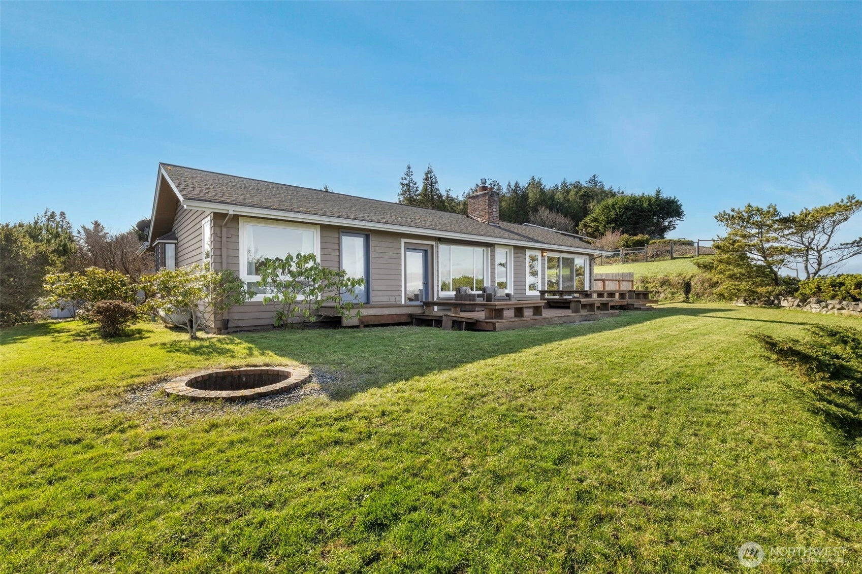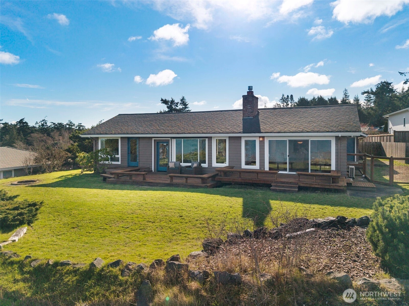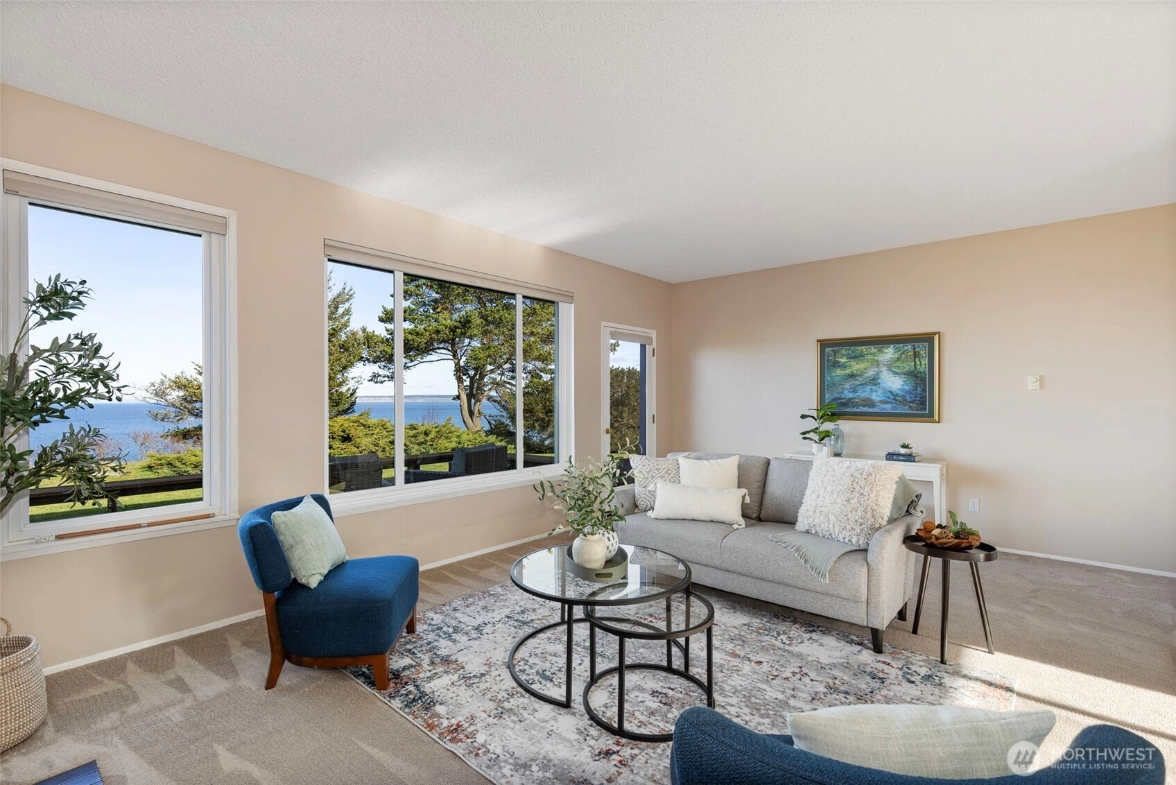 Expansive, panoramic views of the Strait of Juan de Fuca, the San Juan Islands, the Cascade Mountains, and Whidbey Island set the tone for this exceptional Port Townsend home. Perched on four lots in a quiet, off-the-beaten-path setting, the property offers rare privacy while remaining in the heart of town. Designed for comfortable main-level living, the home features zero-threshold entry from the attached two-car garage, creating seamless accessibility. The primary bedroom with ensuite bath opens directly onto the deck—an extraordinary vantage point for soaking in the ever-changing water and mountain views. Nearly every room in the home captures a breathtaking outlook. The user-friendly kitchen is both warm and functional, highlighted by a handmade wooden countertop crafted by the seller’s son—an artisan detail that adds character and heart. Two fireplaces—one wood-burning and one propane—offer cozy gathering spaces year-round. Downstairs, a spacious recreation room and third bedroom with a ¾ bath provide ideal flexibility for guests, hobbies, or multi-generational living. A rare opportunity to enjoy sweeping views, generous space, and peaceful privacy—all just moments from everything Port Townsend has to offer.
