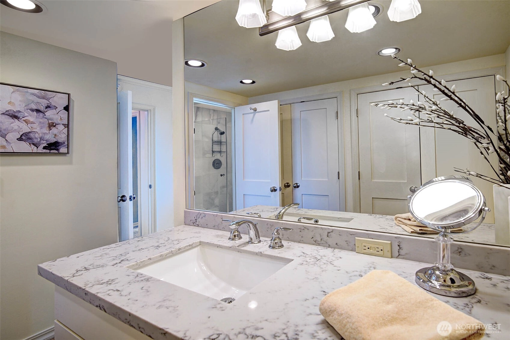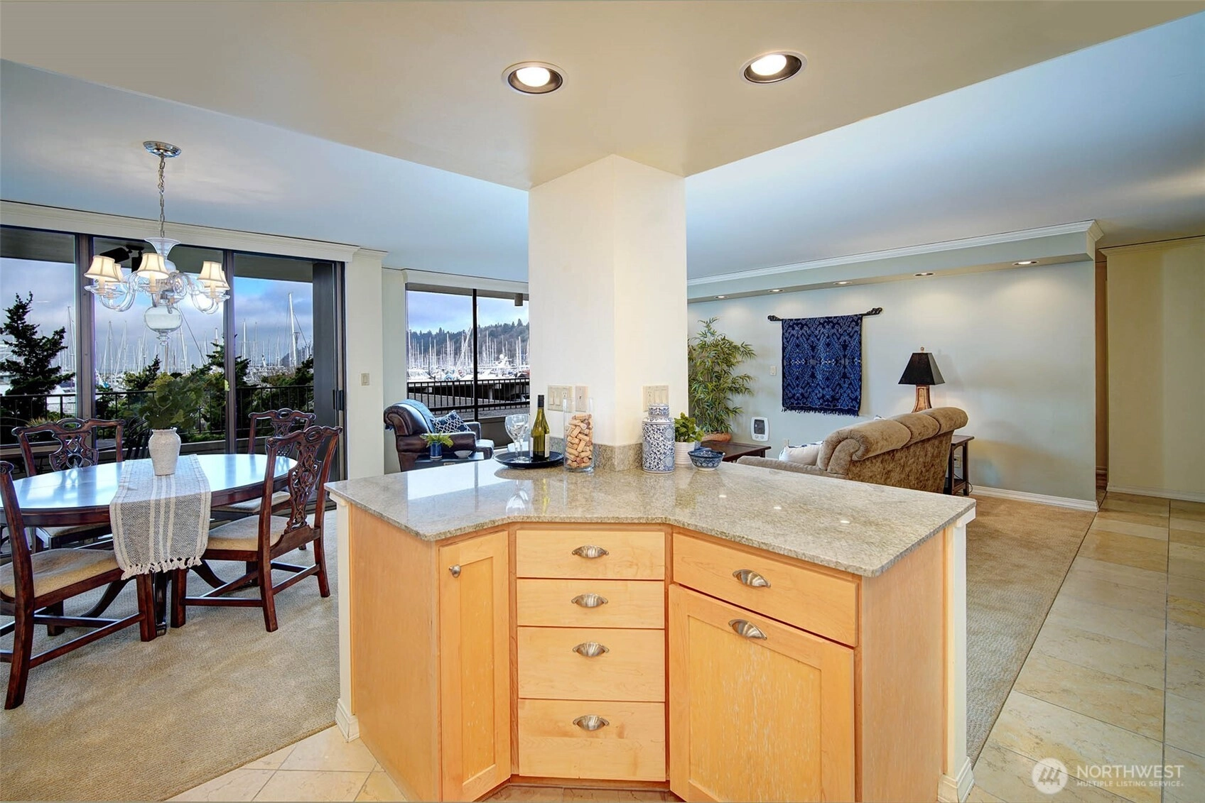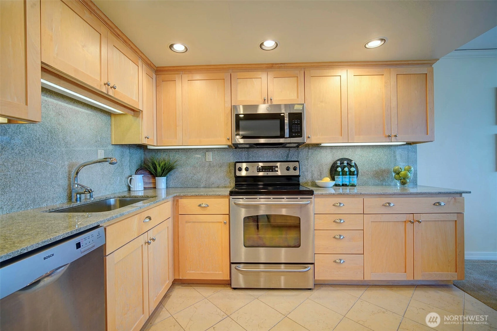Sit back and bask in this handsome, thoughtfully renovated residence at water's edge and marvel at the moving panoramas of Shilshole Marina and the Sound with its myriad of sailboats, yachts and marine life parading before you. Succumb to the beauty of tangerine sunsets silhouetting the snow-capped Olympics..... vistas all framed by floor-to-ceiling picture windows. Spacious chef's kitchen with its sleek granite countertops and custom cabinetry opens onto dining room and king-size deck beyond.....a perfect spot for summertime BBQs, dining al fresco, or container gardening. Step outside and explore Sunset West's many amenities including 24 hour security, outdoor pool & spa, game room, fully equipped hobby shop, exercise and party rooms, RV/boat parking, sauna, and electric car charging stations. Embraced by 11 acres of manicured grounds, a stone's throw to Ray's Boathouse, Golden Gardens Park, the Burke Gilman Trail and minutes to downtown Ballard with its array of restaurants, shops and entertainment...... It's Resort Living - In City!