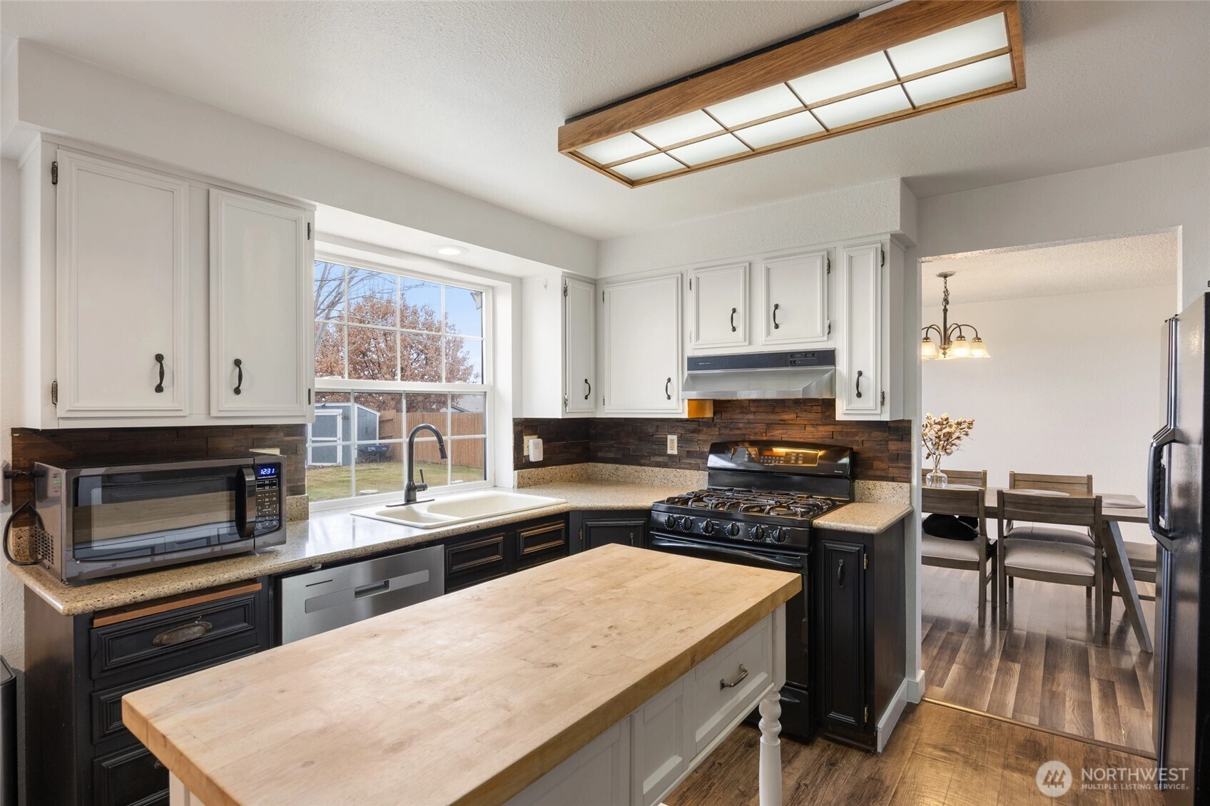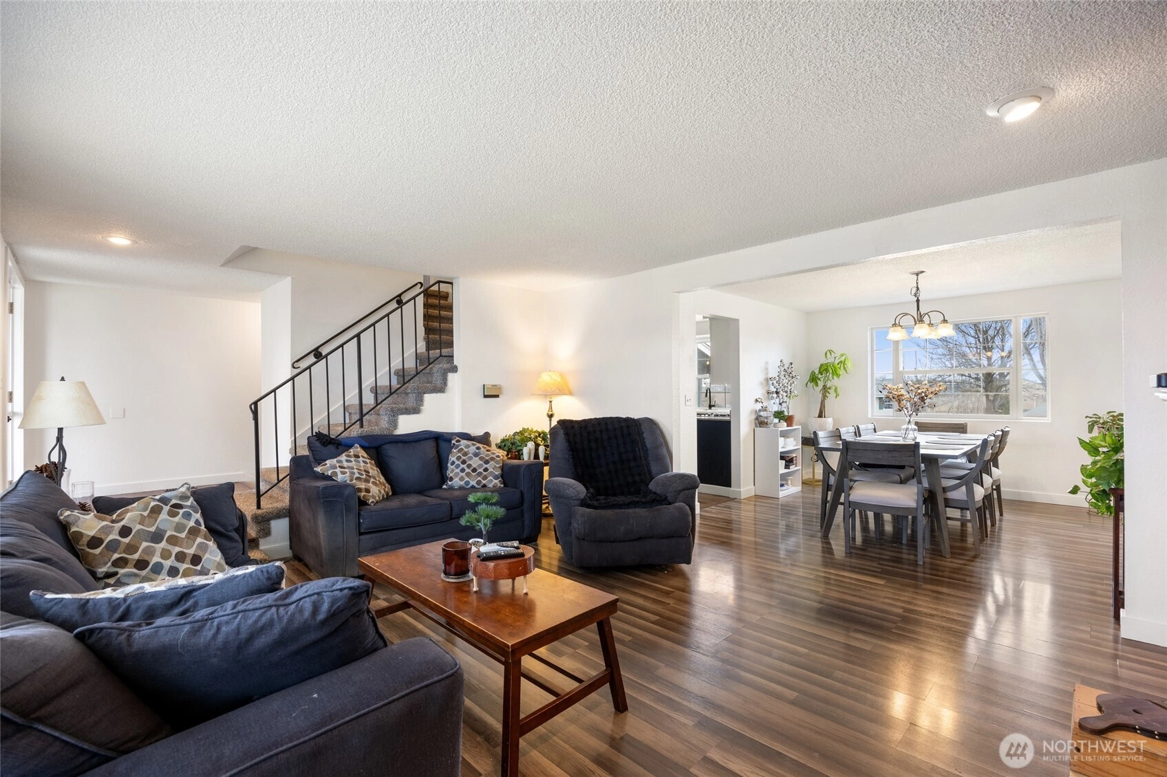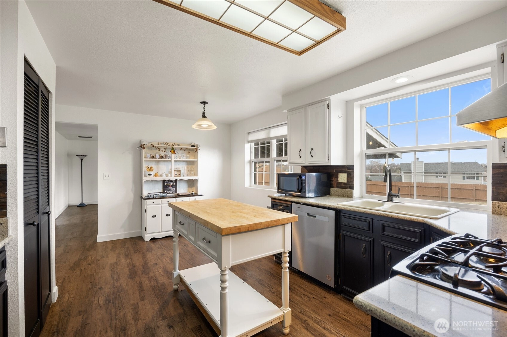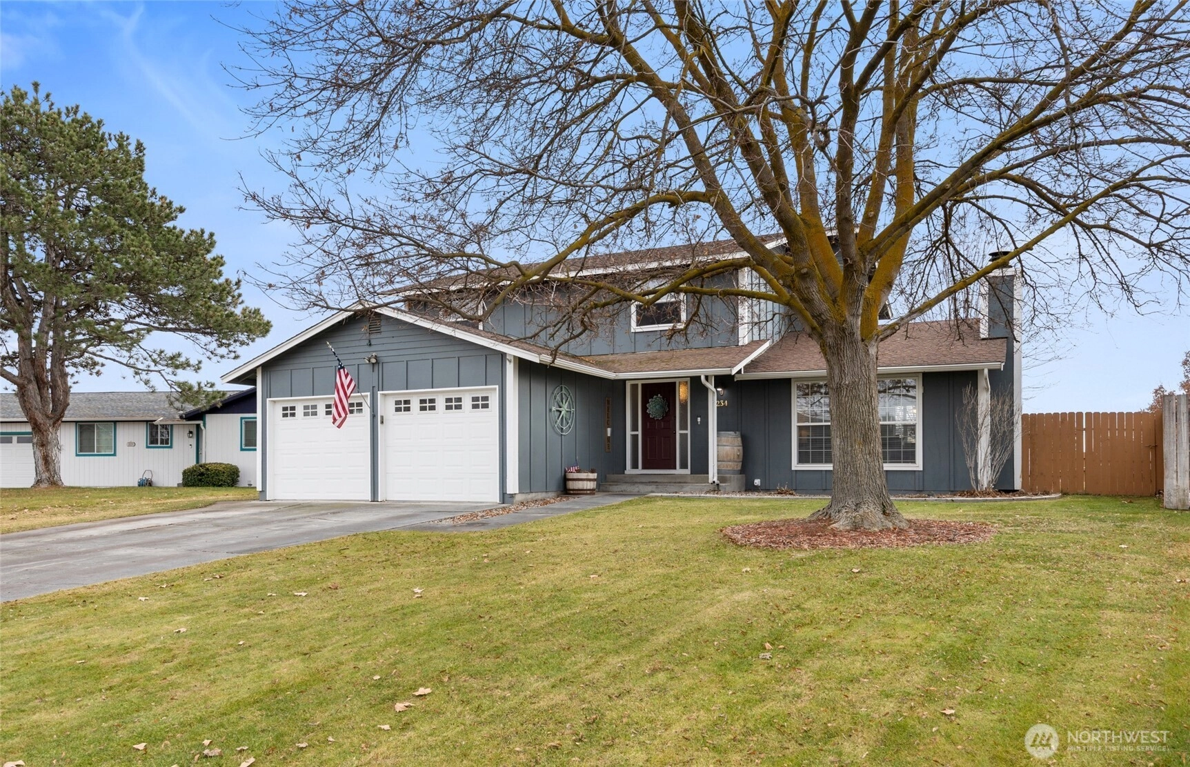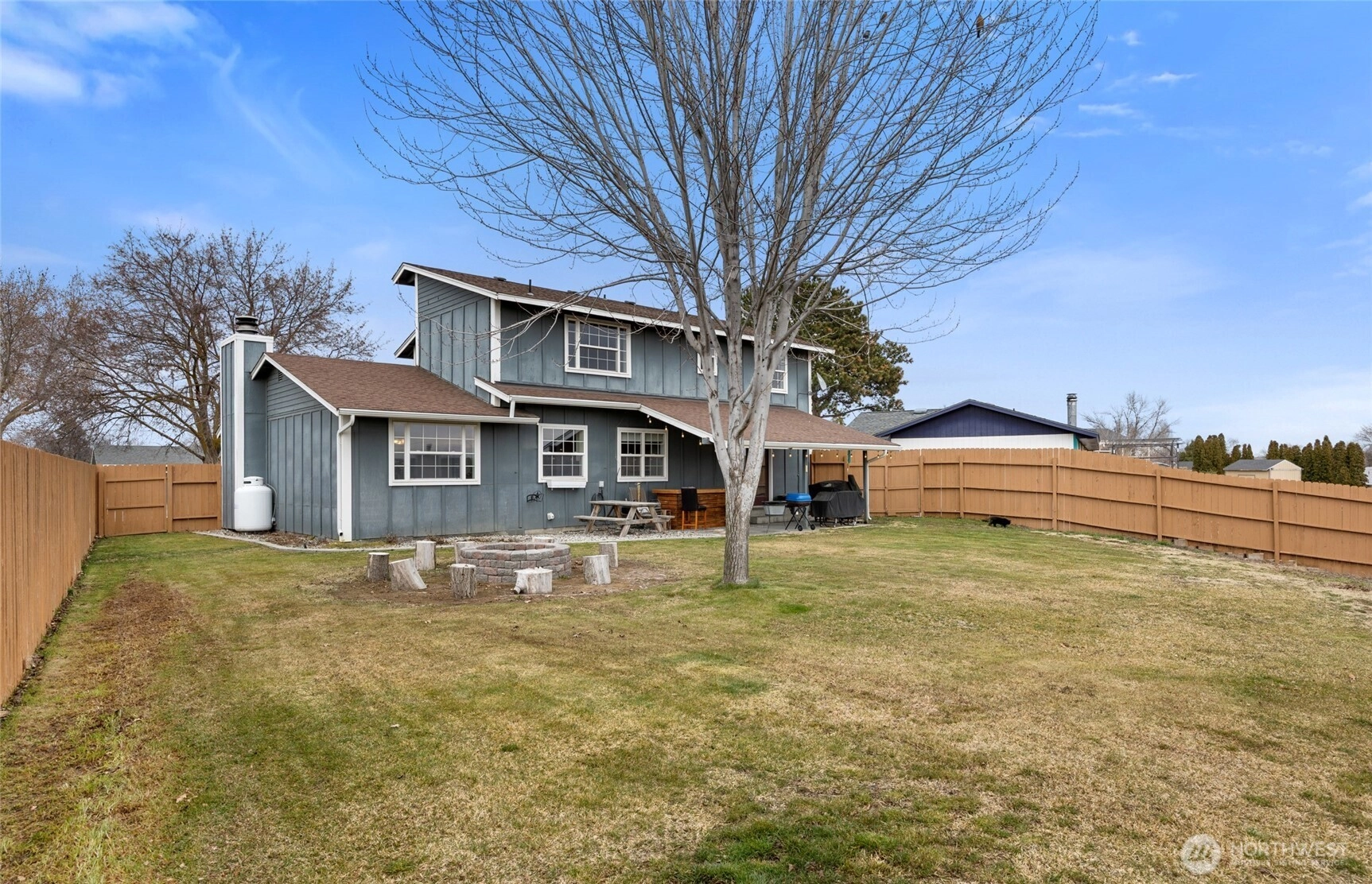 This 4-bedroom, 2.25-bath home is centrally located in Moses Lake and offers both comfort and functionality. Exterior features include attractive board-and-batten siding, a covered back patio, landscaping/storage shed, an outdoor firepit for relaxing evenings, cedar fencing for added backyard privacy, and a spacious 10,219 sq. ft. lot. The property also features mature trees and an underground sprinkler system for easy maintenance. Interior highlights include new carpet on the stairs and in the bedrooms, laminate flooring throughout the main living areas, and two separate living spaces on the main floor. The kitchen comes fully equipped with all appliances included in the sale. The remodeled half bath is conveniently located on the main level. The primary suite features an attached bathroom with a tiled shower and dual shower heads. Additional upgrades include fresh interior paint throughout and a laundry area located just off the garage, complete with washer and dryer included.