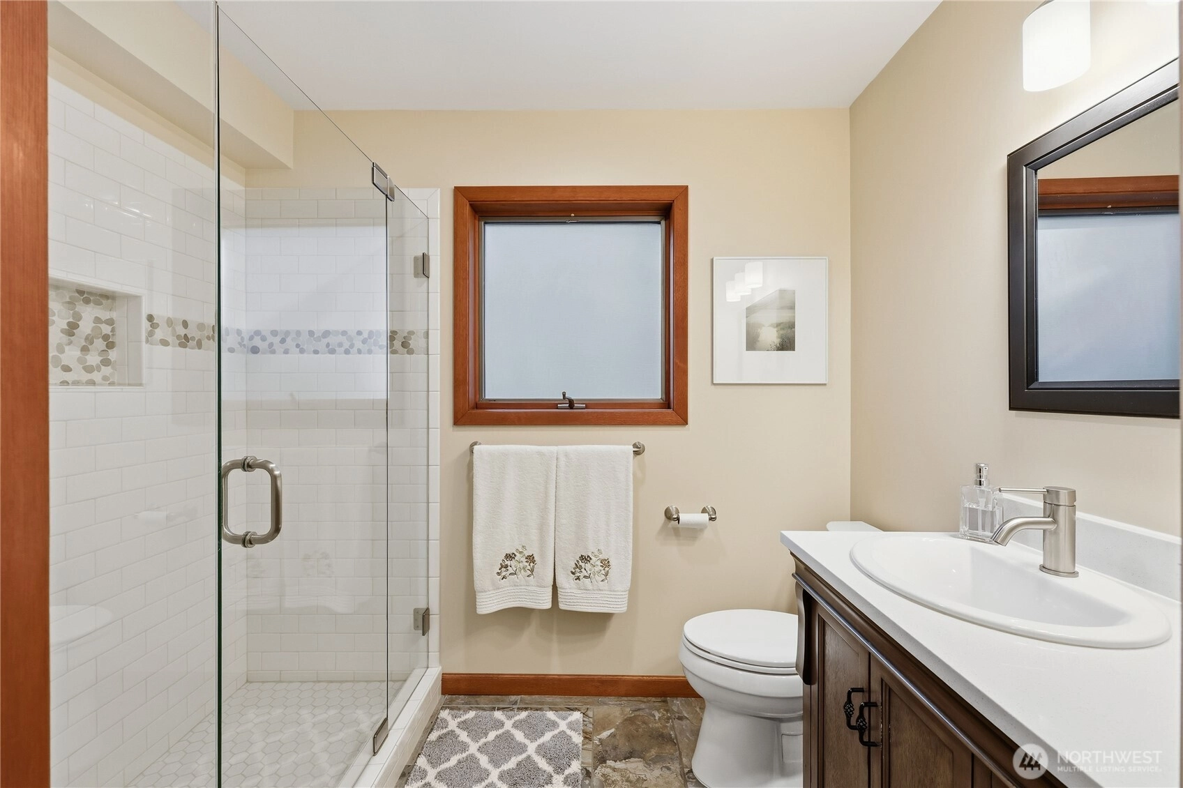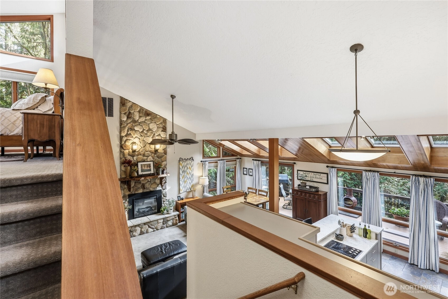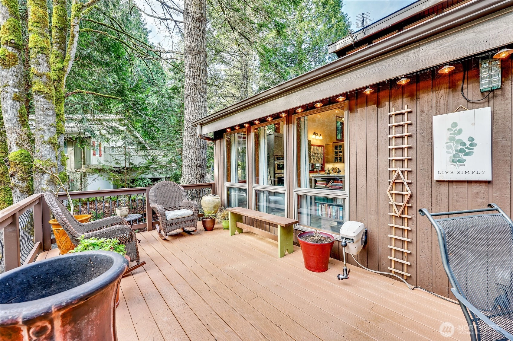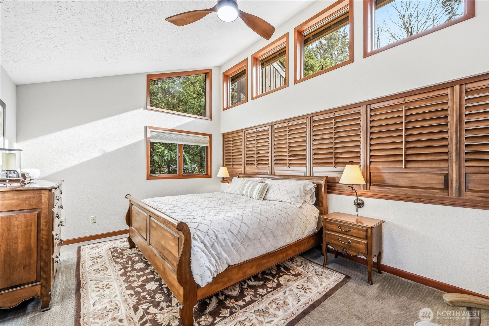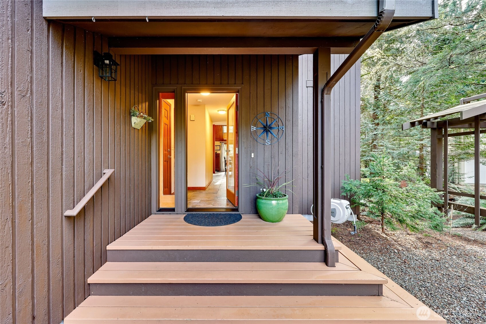 Welcome to this light-filled NW Contemporary gem nestled in a serene & peaceful wooded setting in desirable Port Ludlow! Open-concept living w/vaulted ceilings plus extensive wood-wrapped windows & skylights bring the outdoors in, enfolding you in a cozy environment you will want to call home. The living room features a stone-surround electric fireplace for those cold winter nights. The completely renovated kitchen w/new tile flooring features high-end stainless appliances, quartz countertops & a thoughtful layout that includes bar space for dining w/additional dining space adjacent. The main floor also features a large deck perfect for al fresco dining & entertaining. In addition, there is a good-size bedroom plus a renovated ¾ bath w/walk-in shower & washer/dryer on the main floor. The light-filled primary suite upstairs is expansive in size, features a renovated full bath & includes a walk-in closet. The lower level includes a bedroom, ¾ bath, a family/media room plus craft or office space. There are also new interior/exterior hardwood doors. Access to the lower level deck, terraces, & the beautiful wooded site beyond is from the lower level or via outside stairs. The green belt space between neighbors adds a lovely feeling of privacy for this home. The site also features a darling playhouse/garden shed & the single-car garage has plenty of room for storage. Port Ludlow amenities include golf course, clubhouse, swimming pools, athletic courts & more. Welcome home!