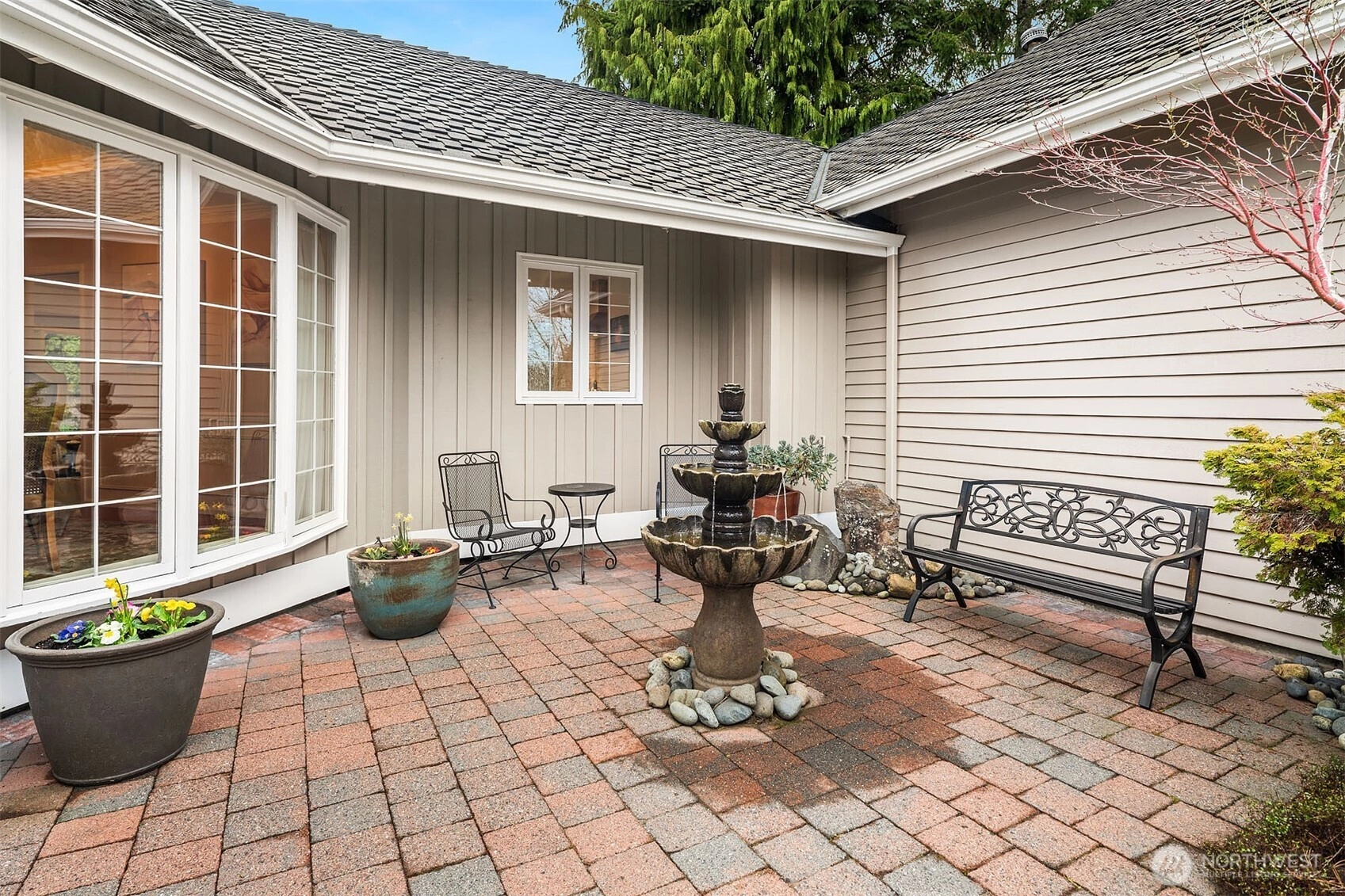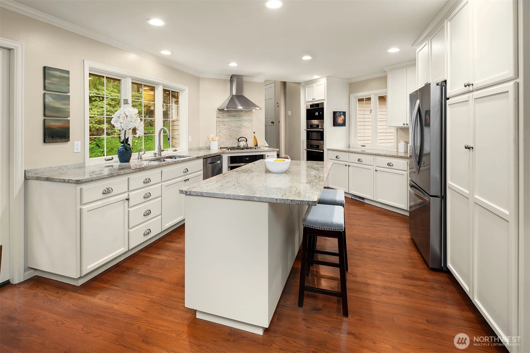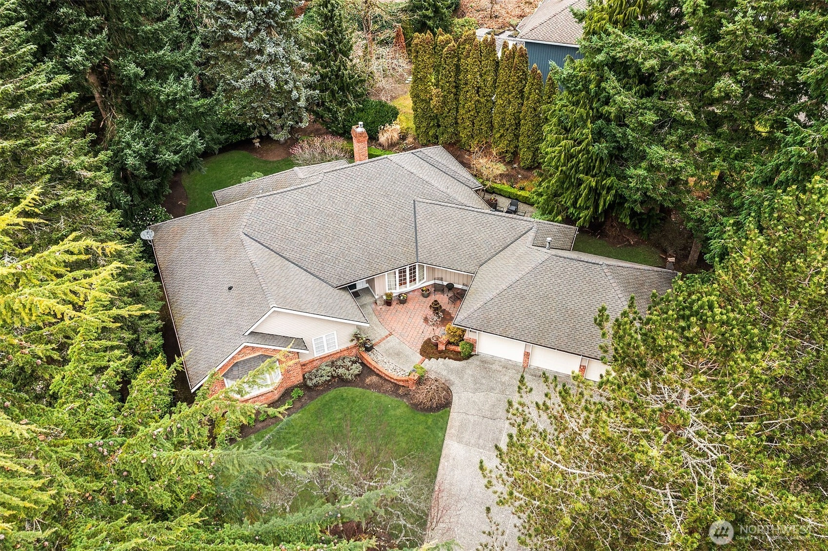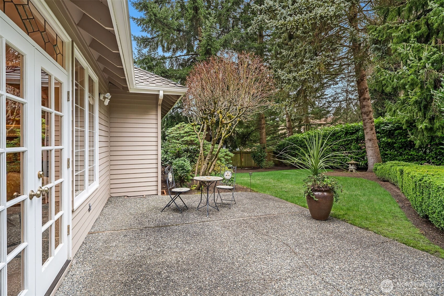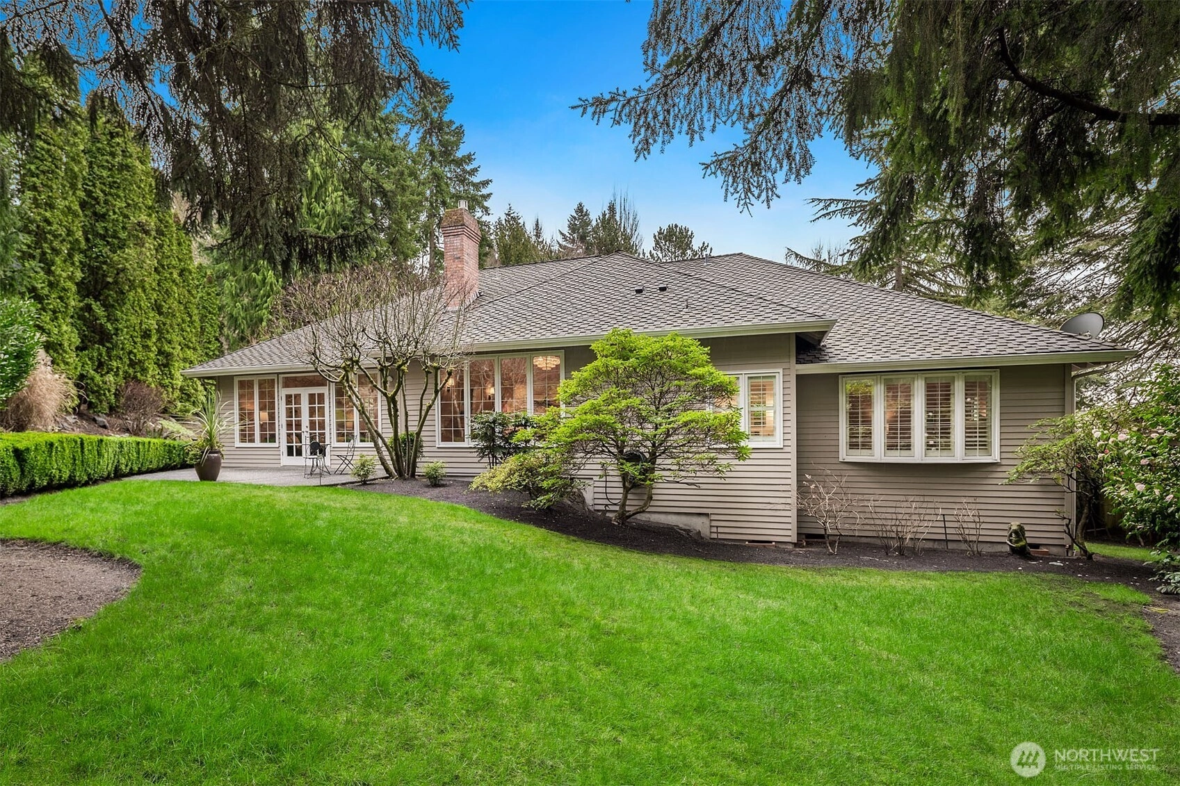 A classic John Buchan home, this beautifully maintained rambler showcases quality craftsmanship and convenient one-level living. An inviting entry opens to the formal living spaces including the living room with a soaring coved ceiling, gas fireplace, and expansive window overlooking the backyard, and the dining room with coffered ceiling and a bay window to the charming front courtyard. The updated kitchen is thoughtfully designed with slab granite countertops, a center island with breakfast bar, stainless steel appliances including a built-in espresso machine and steam oven, and a casual dining area with French doors to a private patio. The adjacent family room creates a warm gathering space with a striking brick fireplace and French doors leading to a 2nd patio for seamless indoor-outdoor living. A private bedroom wing offers a spacious primary suite with large walk-in closet, picture window, and beautifully remodeled 5-piece bath featuring heated floors, dual vanities, soaking tub, and a walk-in shower. 3 additional bedrooms and a full bath provide flexibility for guests, work, or hobbies. Professionally landscaped grounds surround the home, highlighted by a welcoming front courtyard with water feature, 2 patios, and a level lawn. Nestled in the quaint Sablewood community backing to Bridle Trails State Park, residents enjoy over 480 acres and 28 miles of scenic recreational trails, while remaining close to top employers, shopping, and freeways for an easy commute.