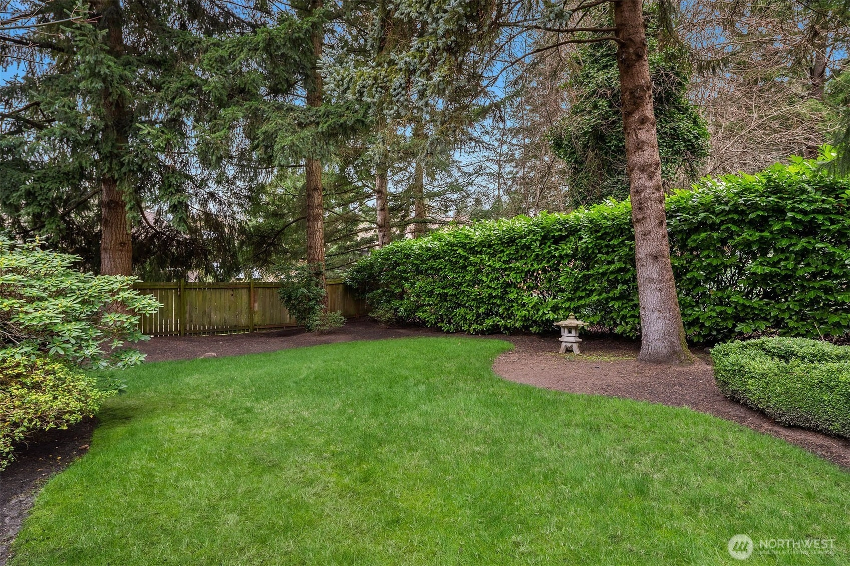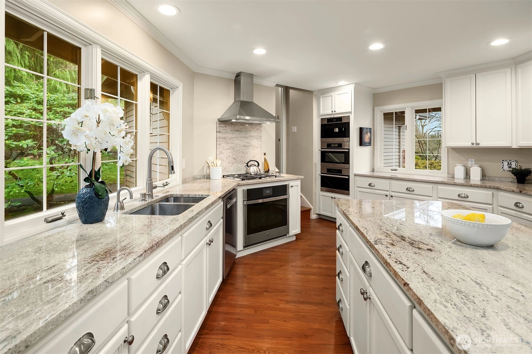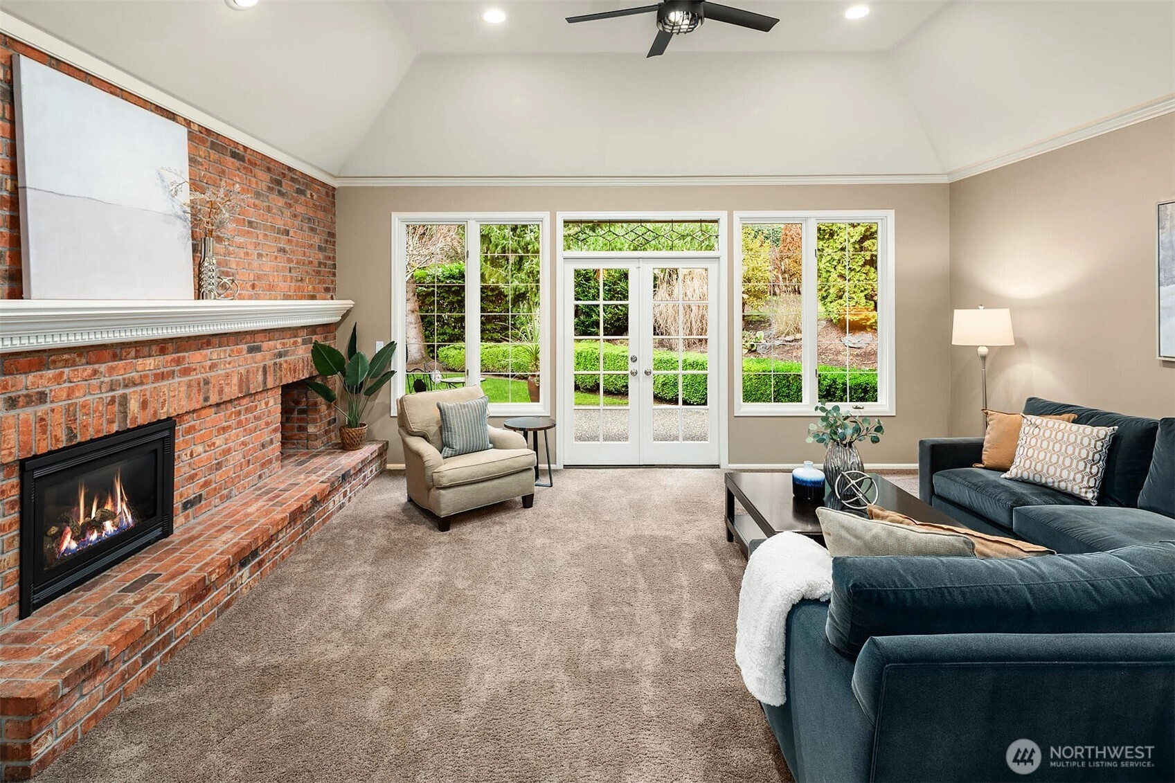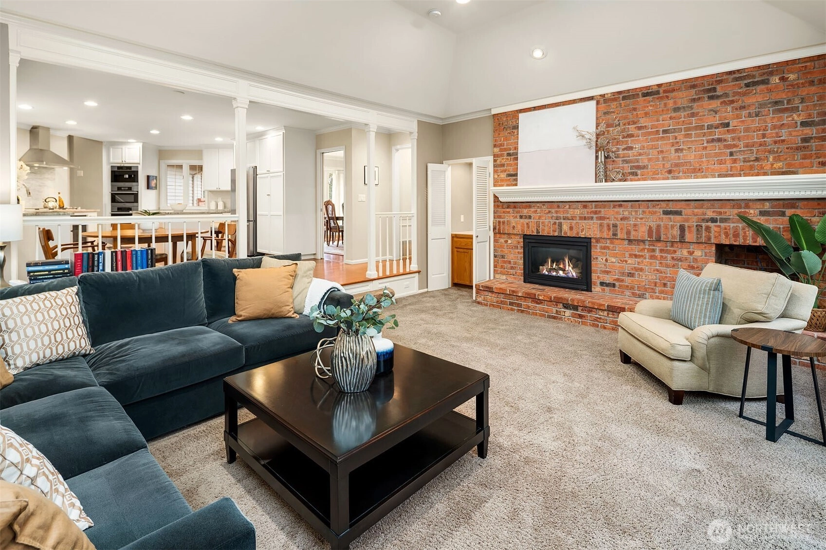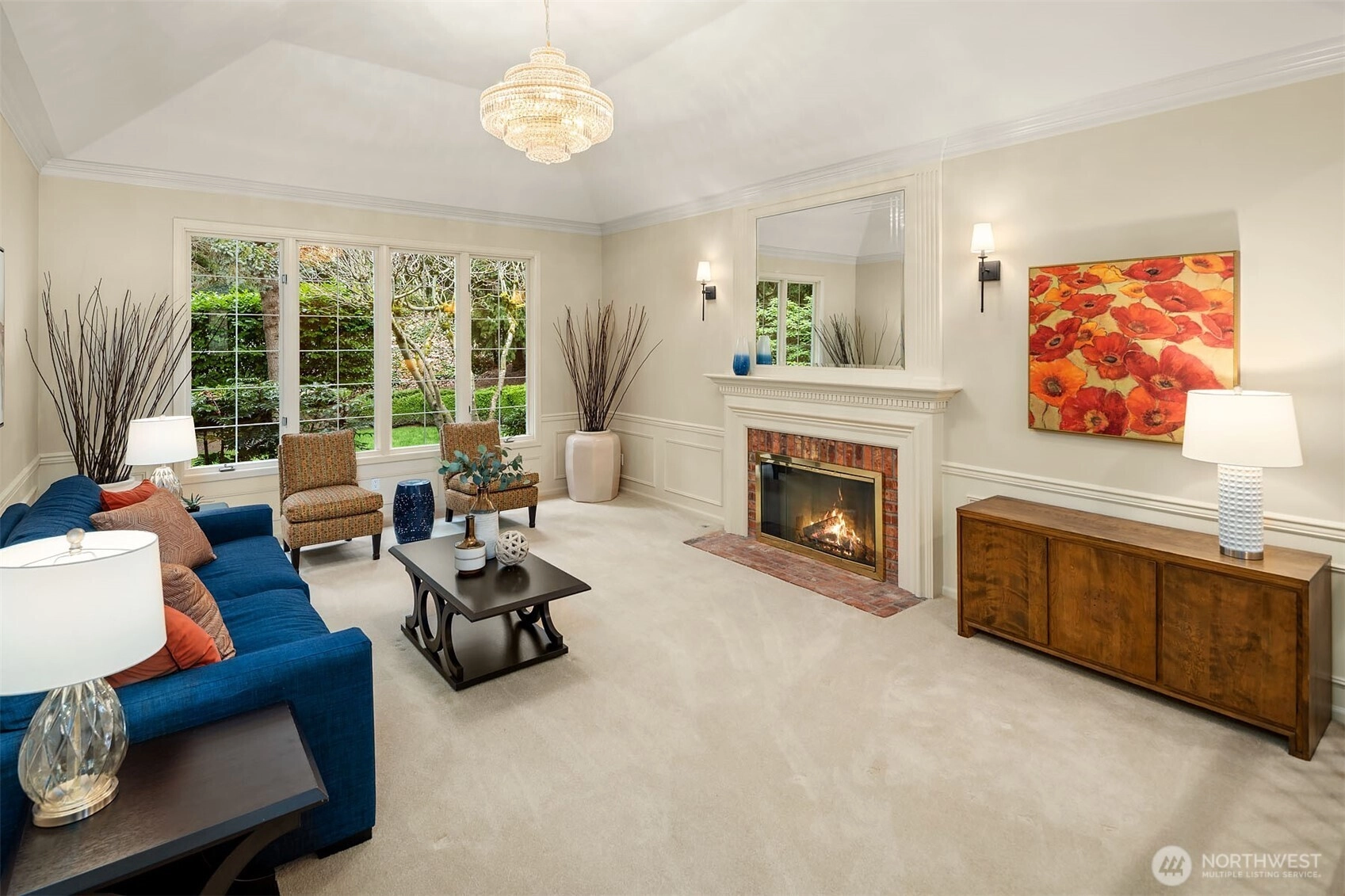 A classic John Buchan home, this beautifully maintained rambler showcases quality craftsmanship and convenient one-level living. An inviting entry opens to the formal living spaces including the living room with a soaring coved ceiling, gas fireplace, and expansive window overlooking the backyard, and the dining room with coffered ceiling and a bay window to the charming front courtyard. The updated kitchen is thoughtfully designed with slab granite countertops, a center island with breakfast bar, stainless steel appliances including a built-in espresso machine and steam oven, and a casual dining area with French doors to a private patio. The adjacent family room creates a warm gathering space with a striking brick fireplace and French doors leading to a 2nd patio for seamless indoor-outdoor living. A private bedroom wing offers a spacious primary suite with large walk-in closet, picture window, and beautifully remodeled 5-piece bath featuring heated floors, dual vanities, soaking tub, and a walk-in shower. 3 additional bedrooms and a full bath provide flexibility for guests, work, or hobbies. Professionally landscaped grounds surround the home, highlighted by a welcoming front courtyard with water feature, 2 patios, and a level lawn. Nestled in the quaint Sablewood community backing to Bridle Trails State Park, residents enjoy over 480 acres and 28 miles of scenic recreational trails, while remaining close to top employers, shopping, and freeways for an easy commute.