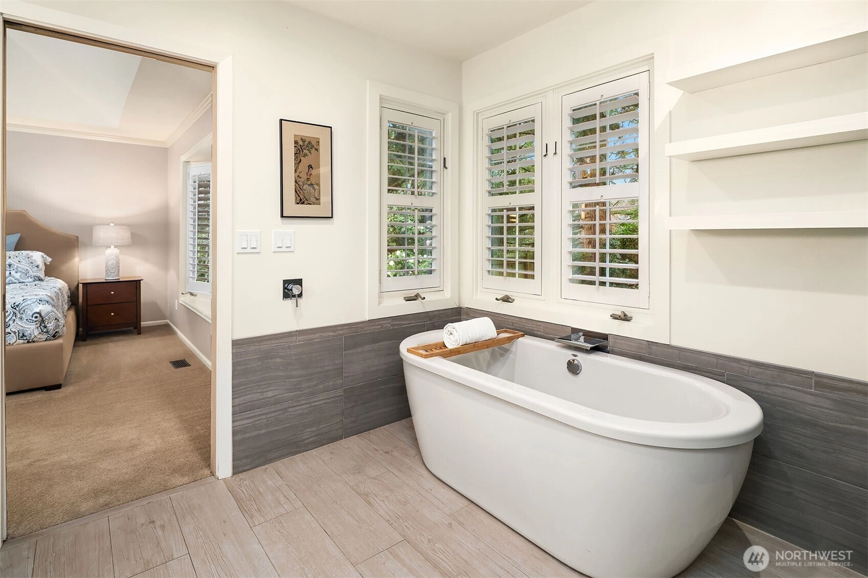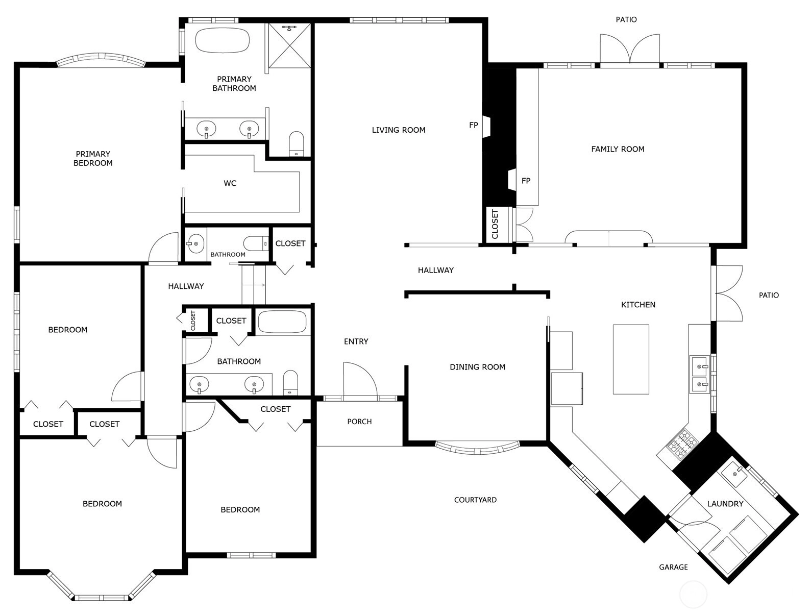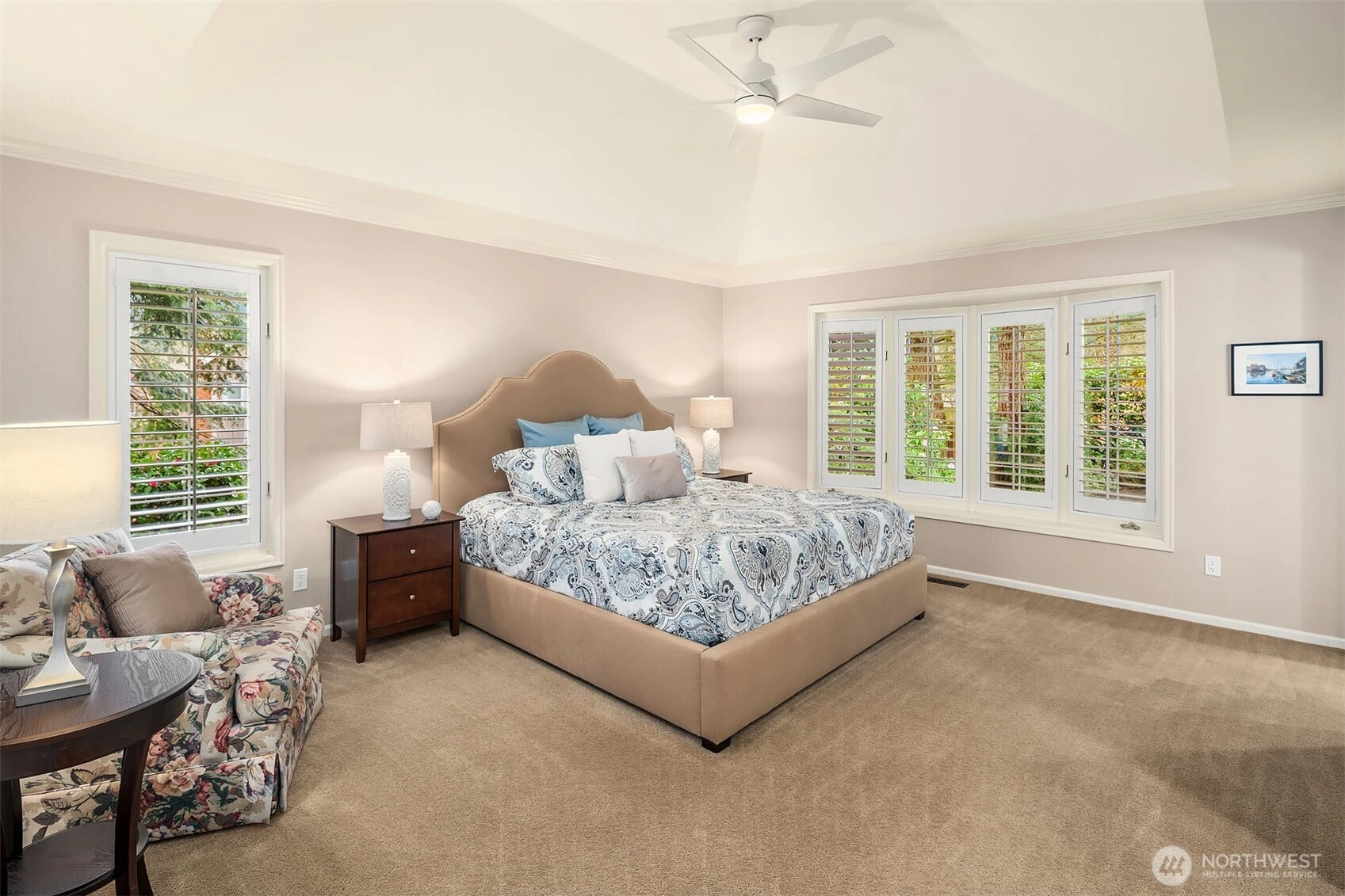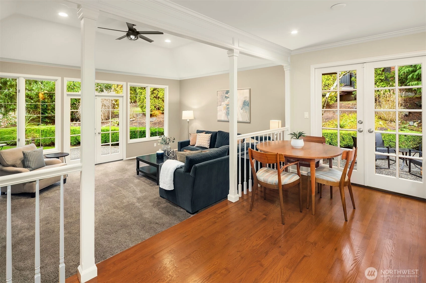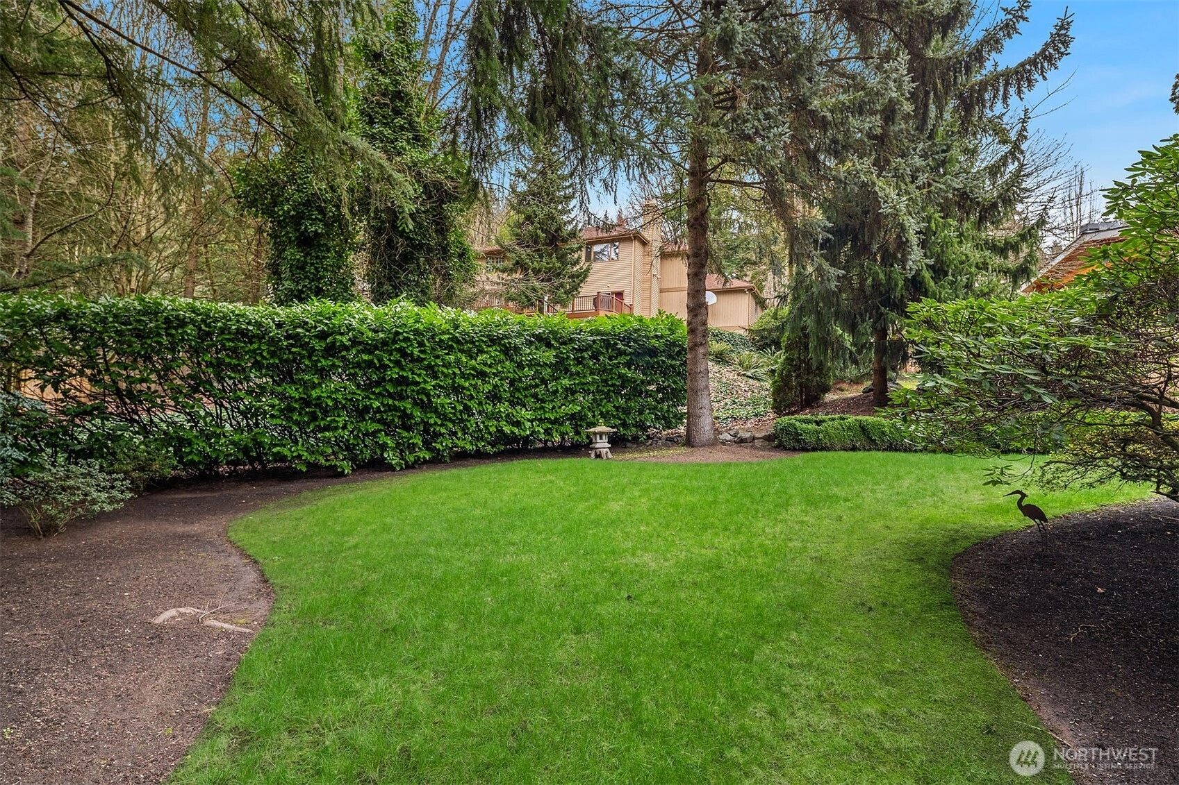 A classic John Buchan home, this beautifully maintained rambler showcases quality craftsmanship and convenient one-level living. An inviting entry opens to the formal living spaces including the living room with a soaring coved ceiling, gas fireplace, and expansive window overlooking the backyard, and the dining room with coffered ceiling and a bay window to the charming front courtyard. The updated kitchen is thoughtfully designed with slab granite countertops, a center island with breakfast bar, stainless steel appliances including a built-in espresso machine and steam oven, and a casual dining area with French doors to a private patio. The adjacent family room creates a warm gathering space with a striking brick fireplace and French doors leading to a 2nd patio for seamless indoor-outdoor living. A private bedroom wing offers a spacious primary suite with large walk-in closet, picture window, and beautifully remodeled 5-piece bath featuring heated floors, dual vanities, soaking tub, and a walk-in shower. 3 additional bedrooms and a full bath provide flexibility for guests, work, or hobbies. Professionally landscaped grounds surround the home, highlighted by a welcoming front courtyard with water feature, 2 patios, and a level lawn. Nestled in the quaint Sablewood community backing to Bridle Trails State Park, residents enjoy over 480 acres and 28 miles of scenic recreational trails, while remaining close to top employers, shopping, and freeways for an easy commute.
