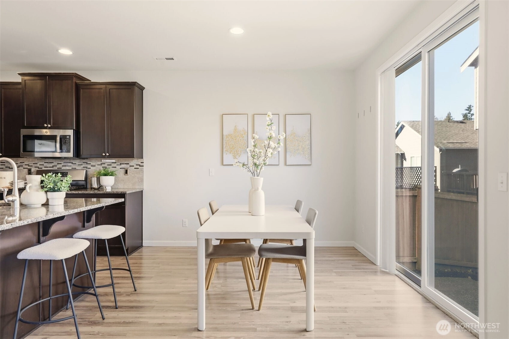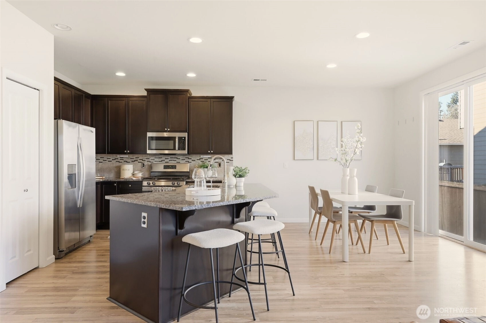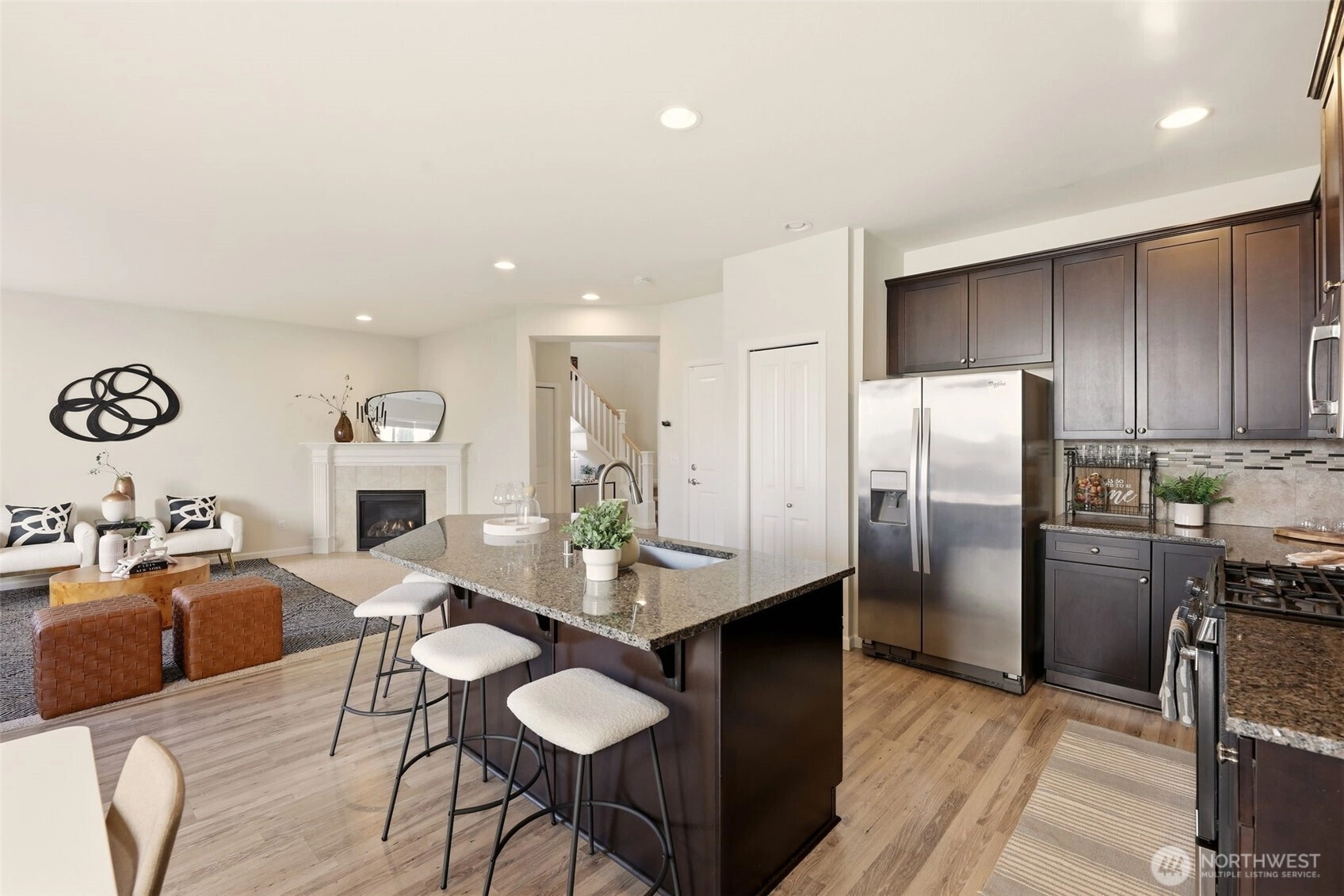 Exceptional living in highly desirable Stone Briar! Built in 2017, this D.R. Horton resale offers 2,038 sq ft with 3 bedrooms + office and 2.5 baths, featuring a bright, open-concept layout designed for comfortable modern living. Extended laminate flooring, crisp white millwork, and crown molding enhance the granite kitchen with island, gas range, stainless appliances, and walk-in pantry. Energy-efficient upgrades include tankless hot water and a natural gas furnace. Move-in ready with all appliances included. The spacious primary suite features a private bath and walk-in closet. Enjoy the fully fenced backyard with patio —ideal for entertaining or relaxing. Two-car garage with added storage. Situated on a corner lot with ample parking, conveniently close to Lake Stevens schools, parks, and commuter routes and Costco.