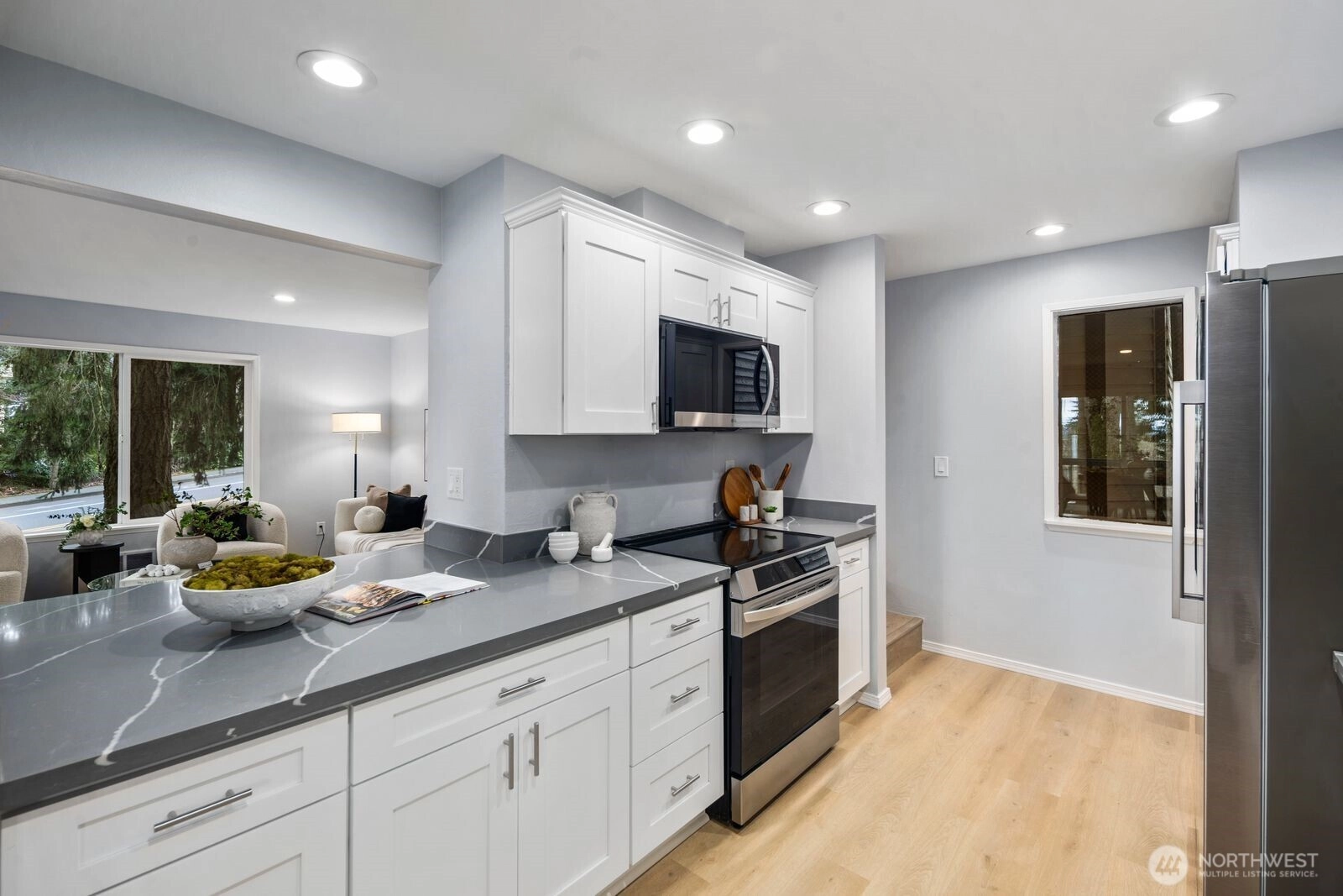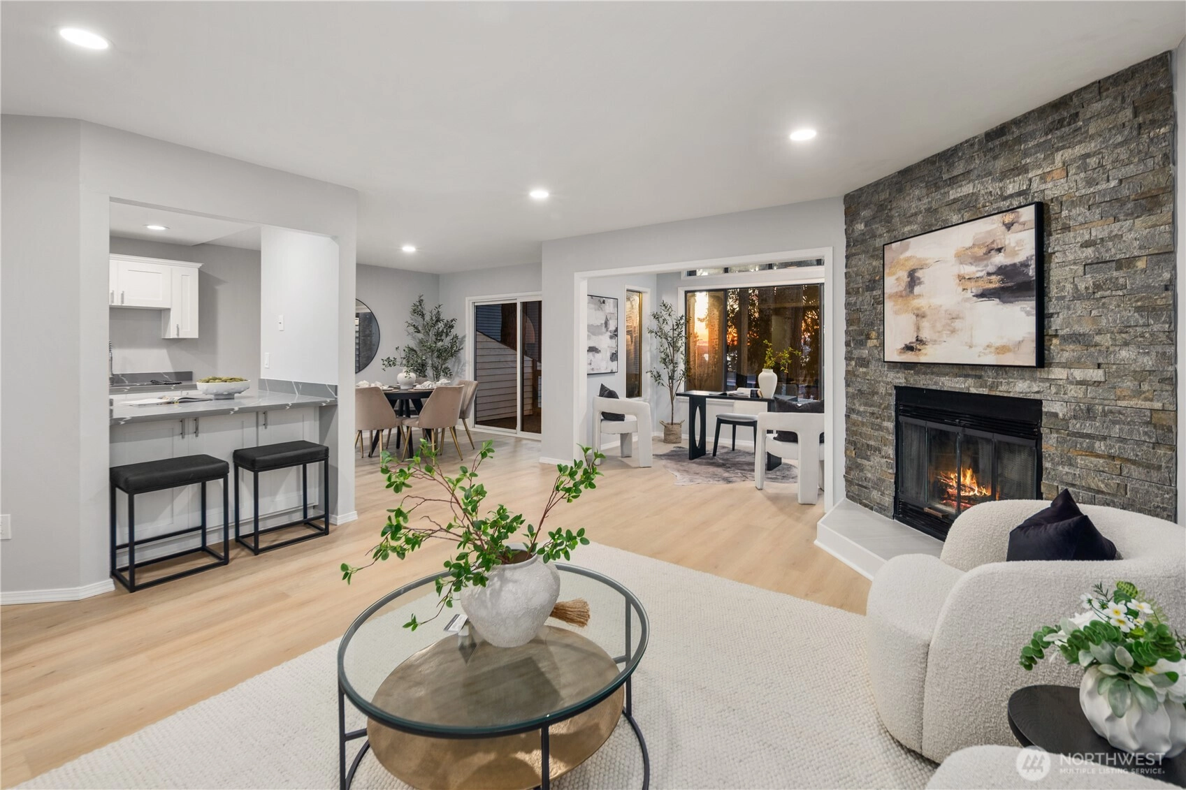 Be at the center of it all in the captivating Rose Hill neighborhood of Kirkland. Revel in the beauty of Lake Washington and Olympic Mountain views right from the comfort of your living room or private patio, perfect for enjoying sunsets and indulging in your morning coffee. No surface untouched in the recent remodel including a sleek new kitchen, updated bathrooms, new flooring, and more. The spacious primary suite features an ensuite bath and two generous walk-in closets. A well-sized second bedroom offers flexibility for guests or home office needs. Live the best of the Kirkland lifestyle with this location! Just two blocks from Costco and quick access to Downtown’s waterfront and abundant restaurants. Love being active? Cross the pedestrian bridge outside your door and be on the Kirkland Corridor trail in minutes, or work on your backhand at the nearby tennis & pickleball courts. Never run out of space thanks to your one-car garage with lofted storage plus one additional parking space. Pet friendly community, Lake WA school district, and a commuter’s dream with multiple 405 entrances nearby - what more could you want.