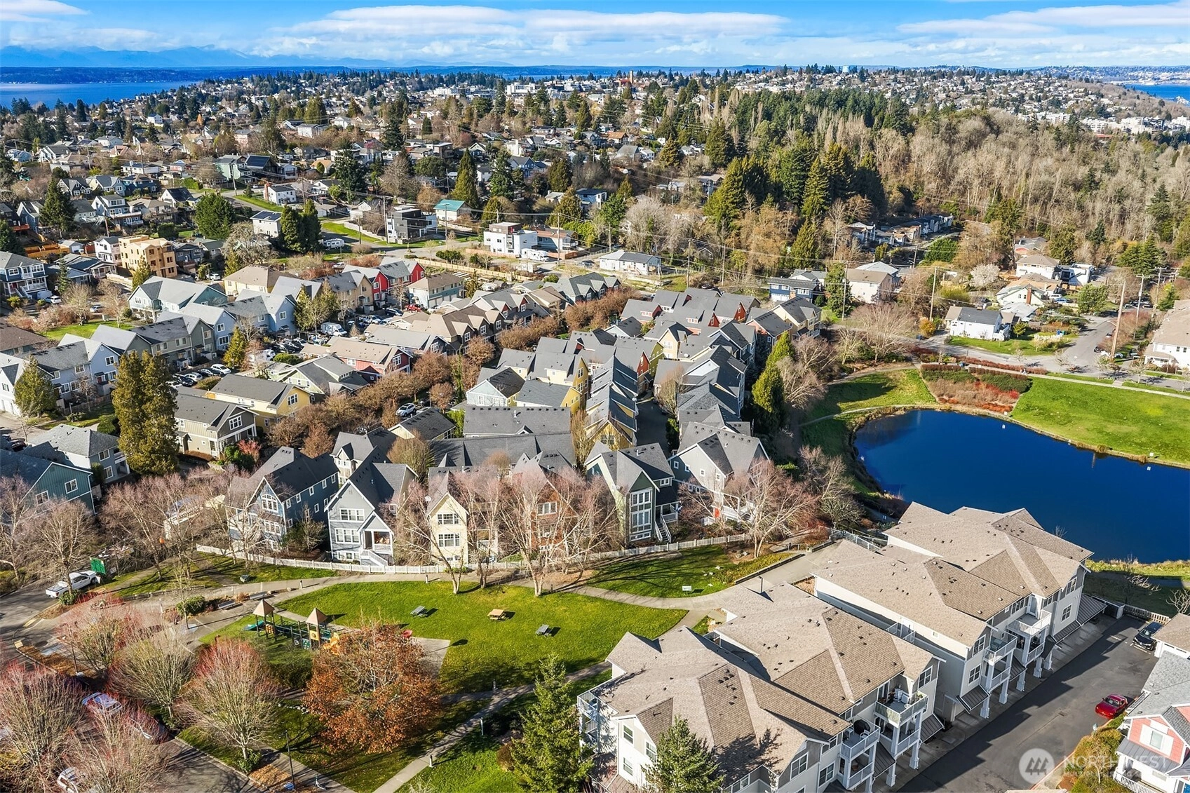 Welcome home to this special house in the heart of West Seattle. This wonderful abode is perfectly situated in the desirable High Point neighborhood where it boasts a prime perch above the reservoir with a sweeping territorial, Sound and mountain view. Enjoy a welcoming front porch where you can relax while gazing out at a verdant green space. Upon entry, the home invites you in warmly with an open living area and kitchen. Entertaining is easy here. Other main floor highlights include ample kitchen storage and an enviable pantry space. The upper level has 3 spacious bedrooms. The primary bedroom is cheery and light-filled with a well appointed en-suite bathroom. Don't miss the eastern views from there! There's a fourth bedroom on the lower level that serves beautifully as a spare bedroom. The additional room on the lower level flexes as an office, workout space or media area. Enjoy the rare 2 car garage with additional storage. Air-conditioning to boot! This spacious serene home is not to be missed. You'll appreciate the superb location just minutes to the West Seattle Junction, Lincoln Park, Alki Beach, countless shops and restaurants. This locale further offers a swift commute downtown by car, bike or express buses.