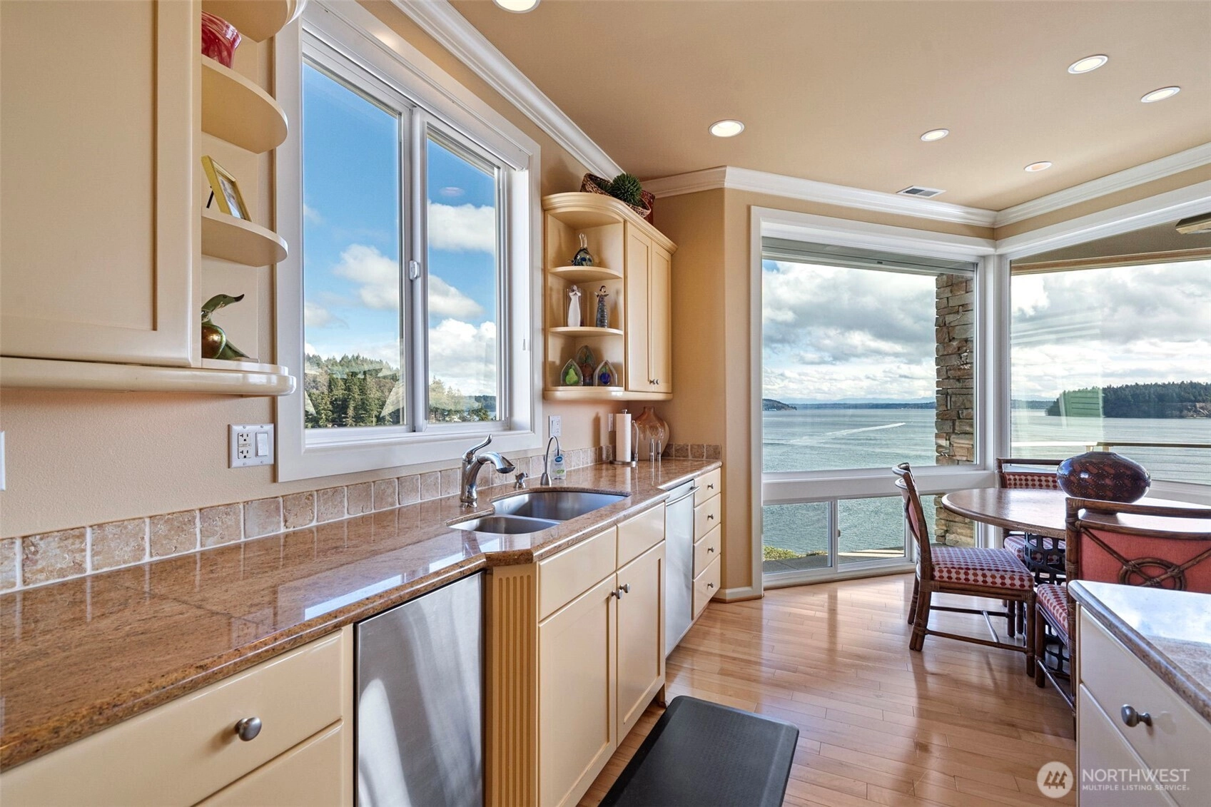 Perched above the shoreline near downtown Gig Harbor, this exceptional single-level condo offers refined waterfront living with sweeping views of the Harbor, Puget Sound, and iconic Mount Rainier. Spanning approximately 3,200 square feet, the thoughtfully designed layout blends sophistication with comfort—ideal for downsizers seeking space without compromise. Expansive sliding doors that frame ever-changing vistas of boats, eagles, and occasional orcas, while a fireplace anchors the elegant great room. The chef’s kitchen is beautifully appointed with high-end appliances, a walk-in pantry, a wet bar that includes an icemaker and wine fridge, all flowing seamlessly into the main living areas for effortless entertaining. A generous covered patio extends the living space outdoors, creating a private retreat to relax and take in the beauty of the Harbor.Luxury, convenience, and breathtaking views—this is waterfront living at its finest.