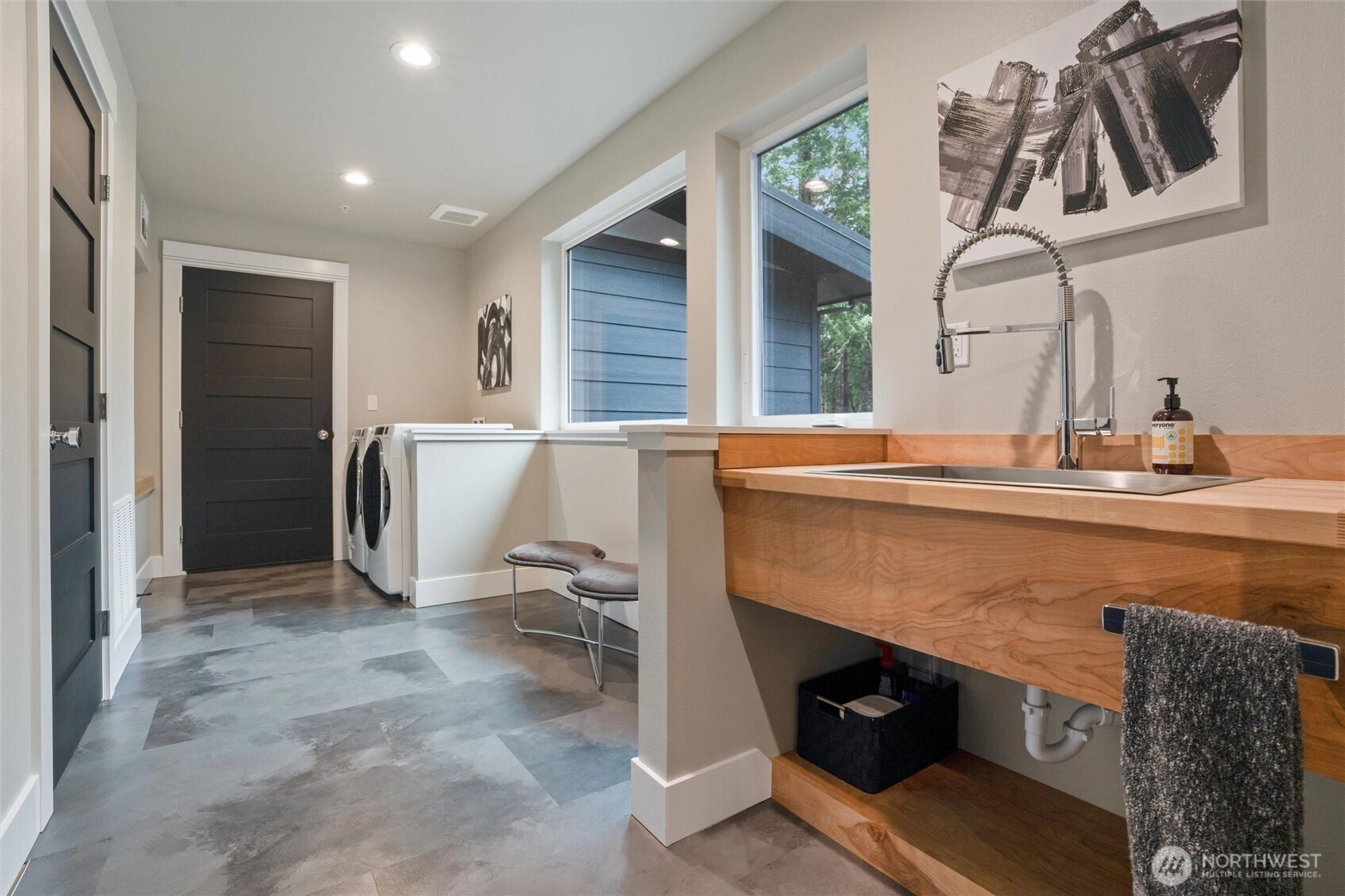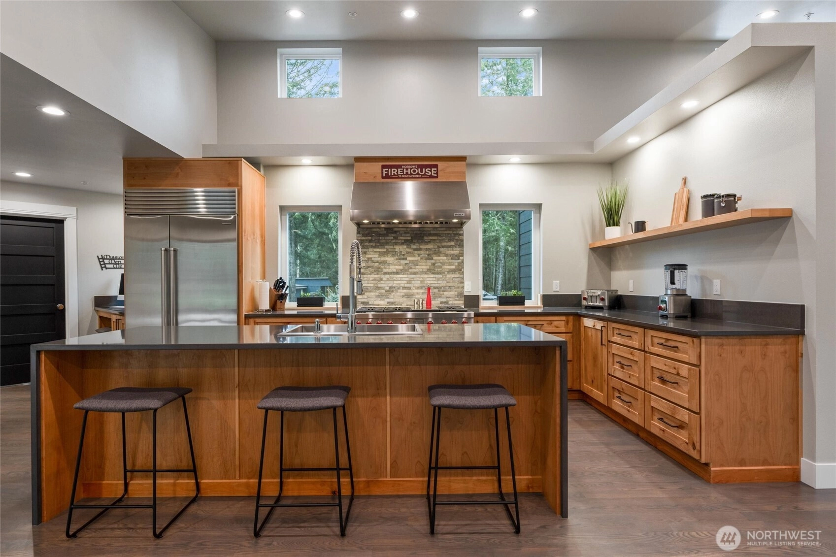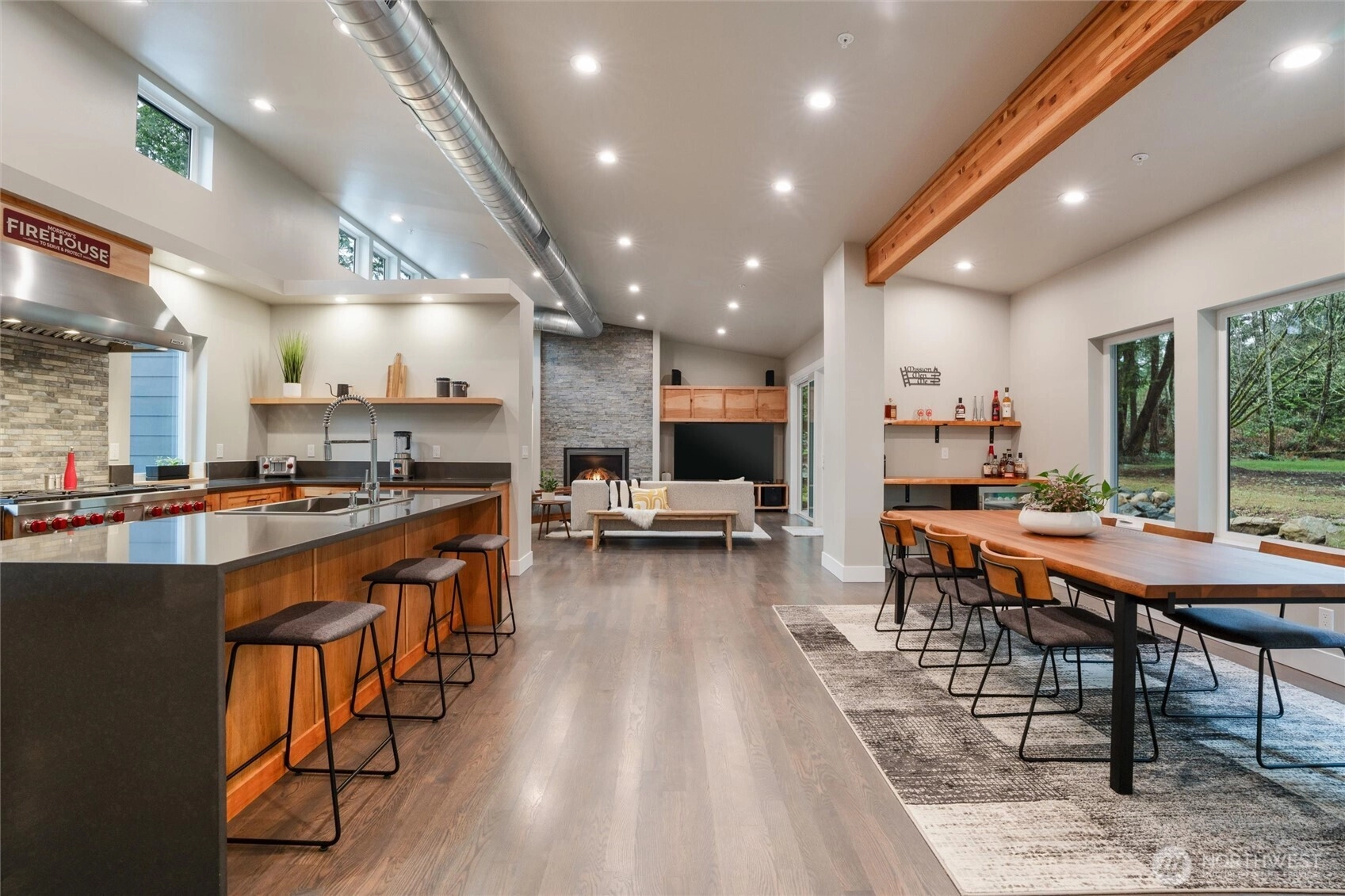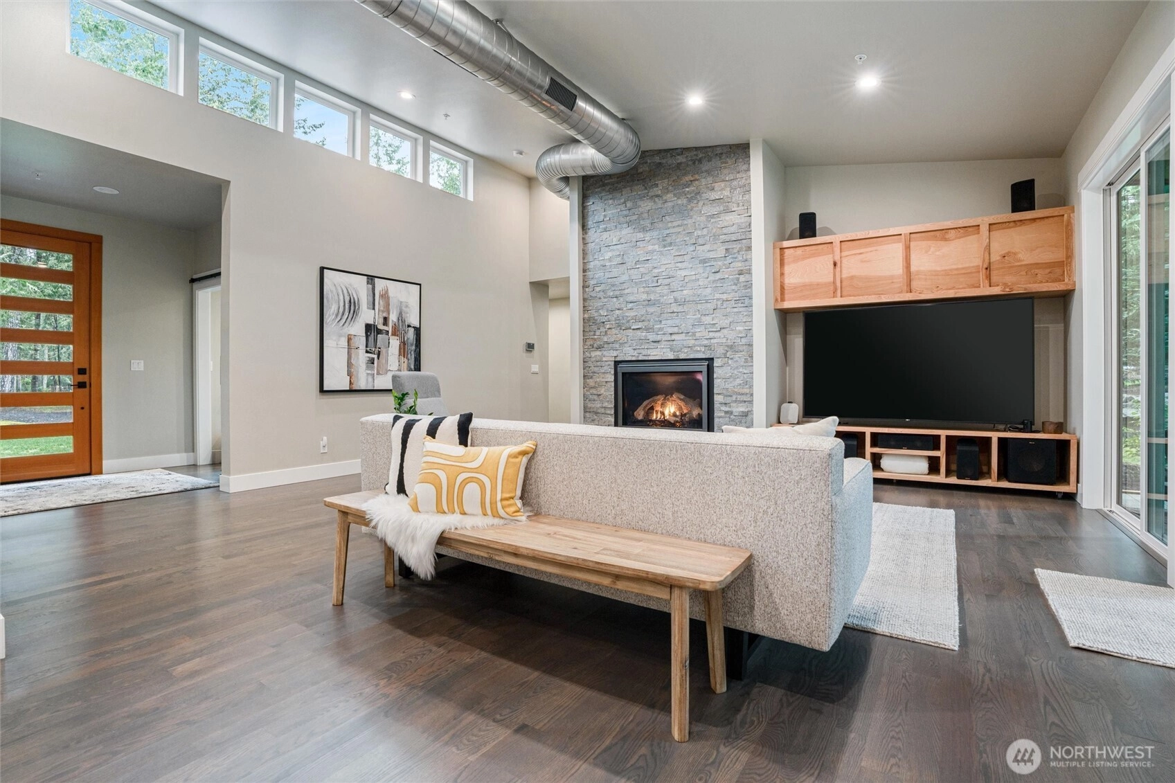 Custom architect-designed modern retreat on gated acreage in Longbranch. Designed by Mascord Design of Portland , this home blends modern, industrial, and rustic elements with exceptional privacy and livability—ideal for anyone seeking refined space in a peaceful Pacific Northwest setting. Features 3 private ensuites, with the primary suite thoughtfully separated to create a true owner’s retreat. Interior highlights include exposed spiral HVAC ducting, true white oak floors, solid hickory cabinetry, Wolf & Sub-Zero appliances, quartz countertops, and a striking stone fireplace. The open, flowing layout delivers elevated living designed for comfort, entertaining, and working from home. Exterior architecture showcases multi-textured cement siding with cedar accents, cedar tongue-and-groove soffits, and a standing seam metal roof. An oversized 1,100 sq ft three-car garage provides exceptional flexibility for storage, workshop space, or recreation. Gated entry, circular gravel driveway, stamped concrete apron, and a serene wooded setting complete the arrival experience. The acreage includes multiple architecturally cohesive outbuildings, including a large covered storage/shop for RVs, vans, equipment, or recreational toys, plus a separate well/pump structure with its own 200-AMP electrical service. Located approximately 25 minutes from town, this property offers a rare balance of seclusion, modern luxury, and accessibility. A unique opportunity to own a luxury home on acreage.