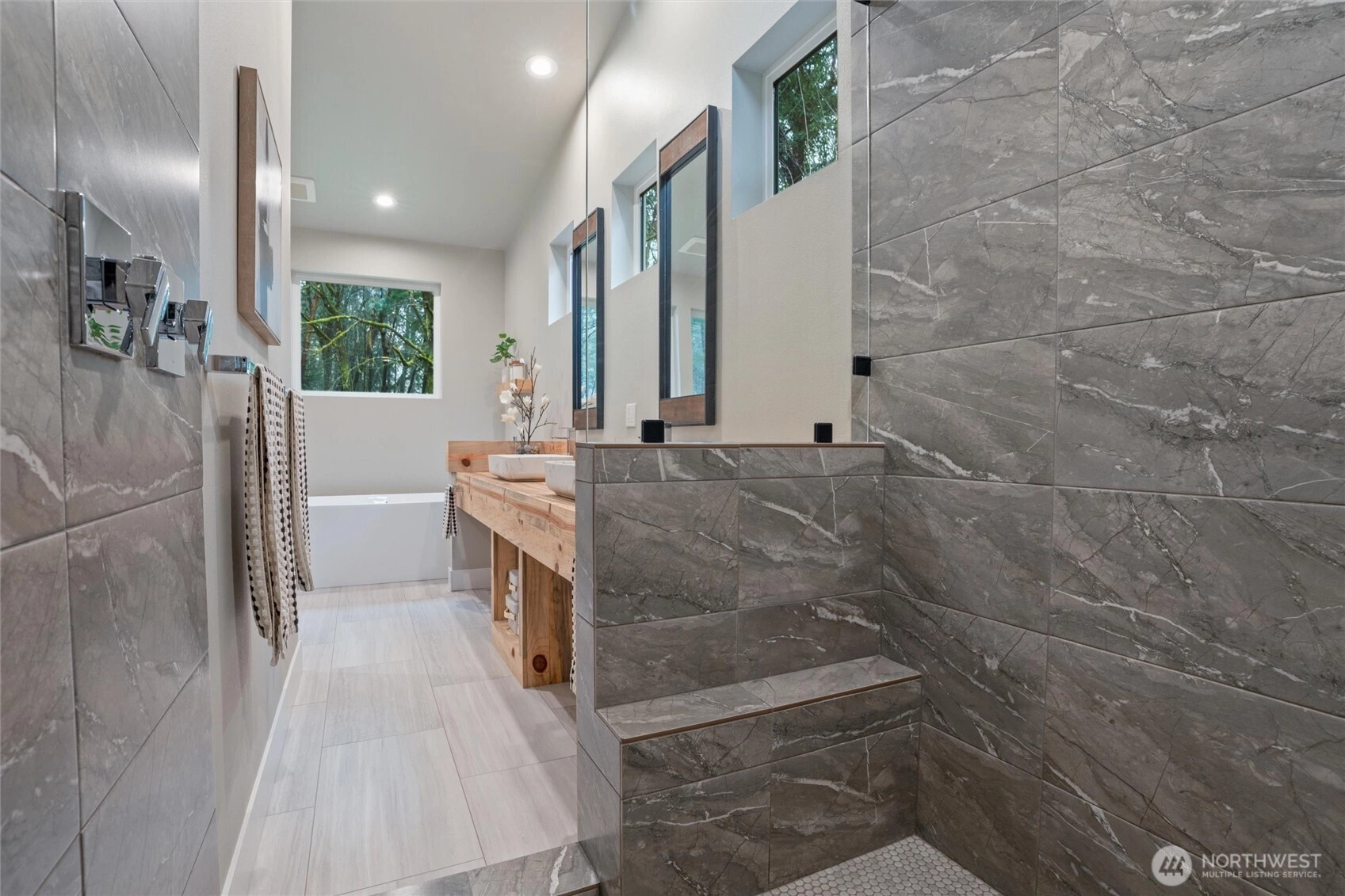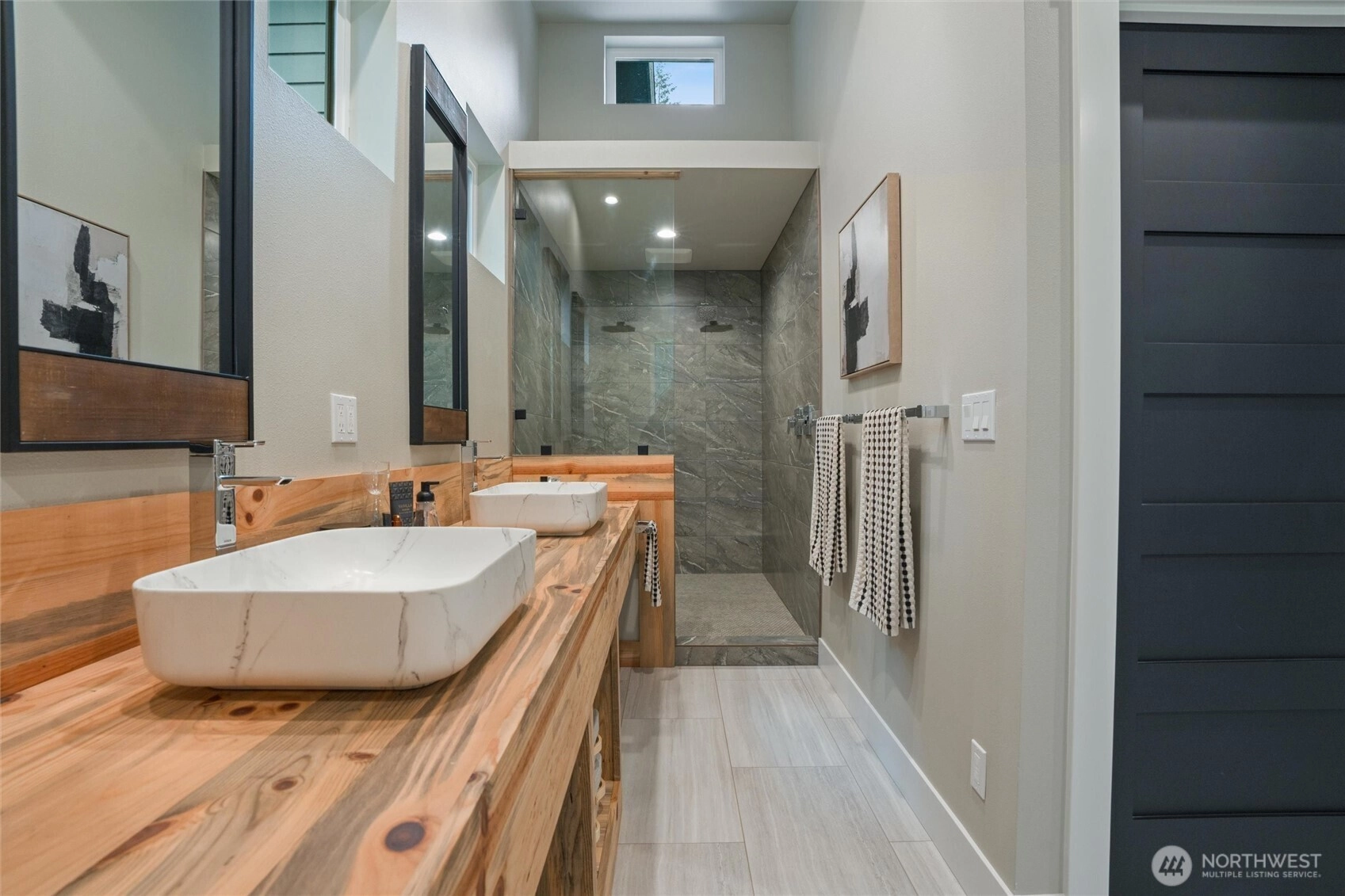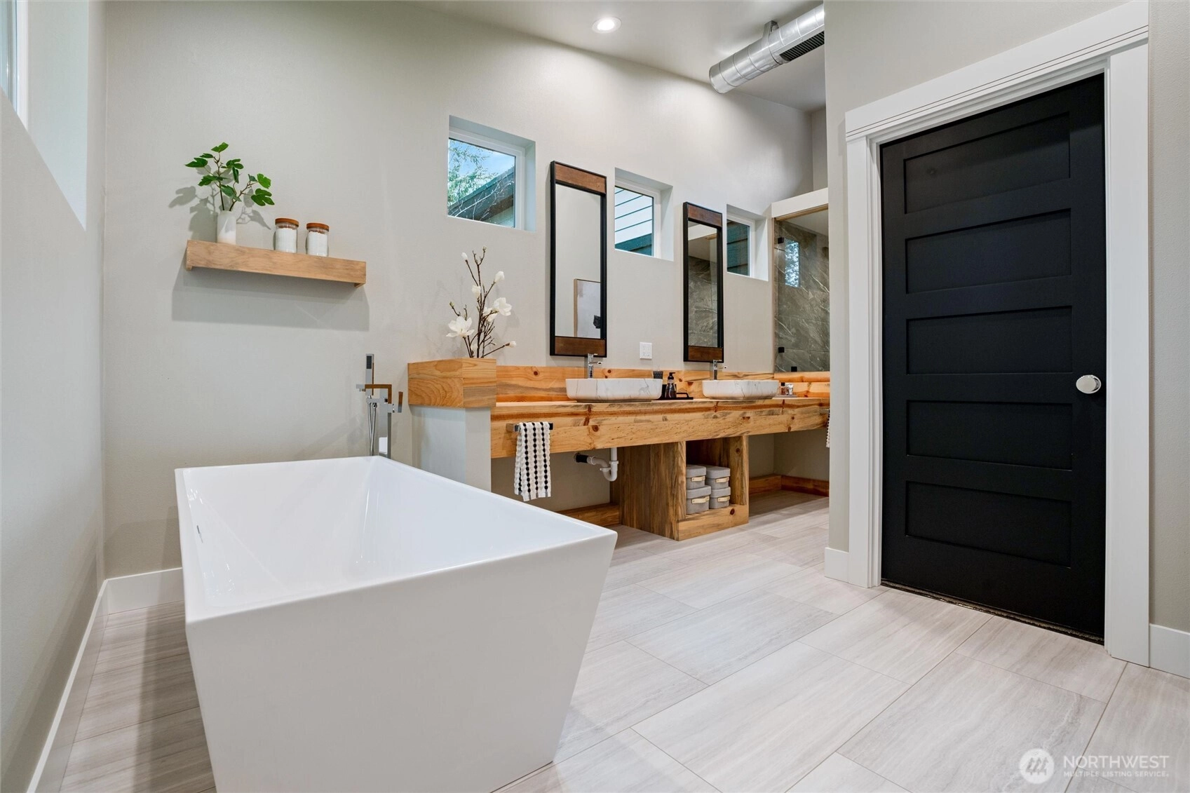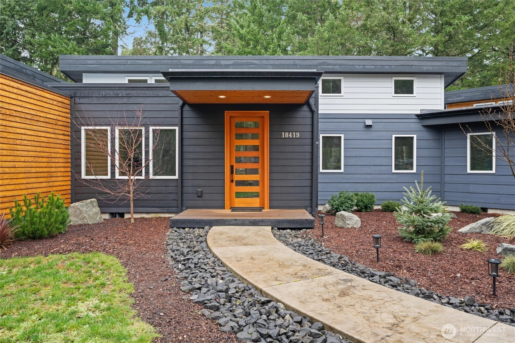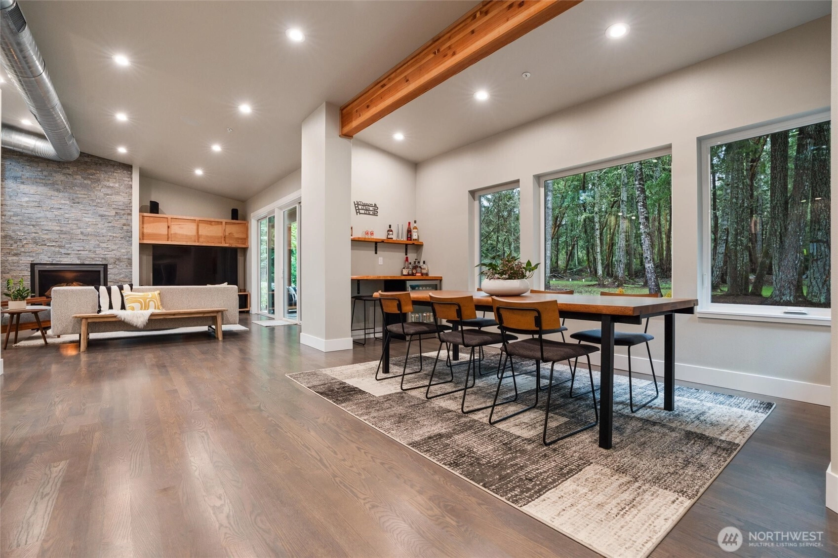 Custom architect-designed modern retreat on gated acreage in Longbranch. Designed by Mascord Design of Portland , this home blends modern, industrial, and rustic elements with exceptional privacy and livability—ideal for anyone seeking refined space in a peaceful Pacific Northwest setting. Features 3 private ensuites, with the primary suite thoughtfully separated to create a true owner’s retreat. Interior highlights include exposed spiral HVAC ducting, true white oak floors, solid hickory cabinetry, Wolf & Sub-Zero appliances, quartz countertops, and a striking stone fireplace. The open, flowing layout delivers elevated living designed for comfort, entertaining, and working from home. Exterior architecture showcases multi-textured cement siding with cedar accents, cedar tongue-and-groove soffits, and a standing seam metal roof. An oversized 1,100 sq ft three-car garage provides exceptional flexibility for storage, workshop space, or recreation. Gated entry, circular gravel driveway, stamped concrete apron, and a serene wooded setting complete the arrival experience. The acreage includes multiple architecturally cohesive outbuildings, including a large covered storage/shop for RVs, vans, equipment, or recreational toys, plus a separate well/pump structure with its own 200-AMP electrical service. Located approximately 25 minutes from town, this property offers a rare balance of seclusion, modern luxury, and accessibility. A unique opportunity to own a luxury home on acreage.
