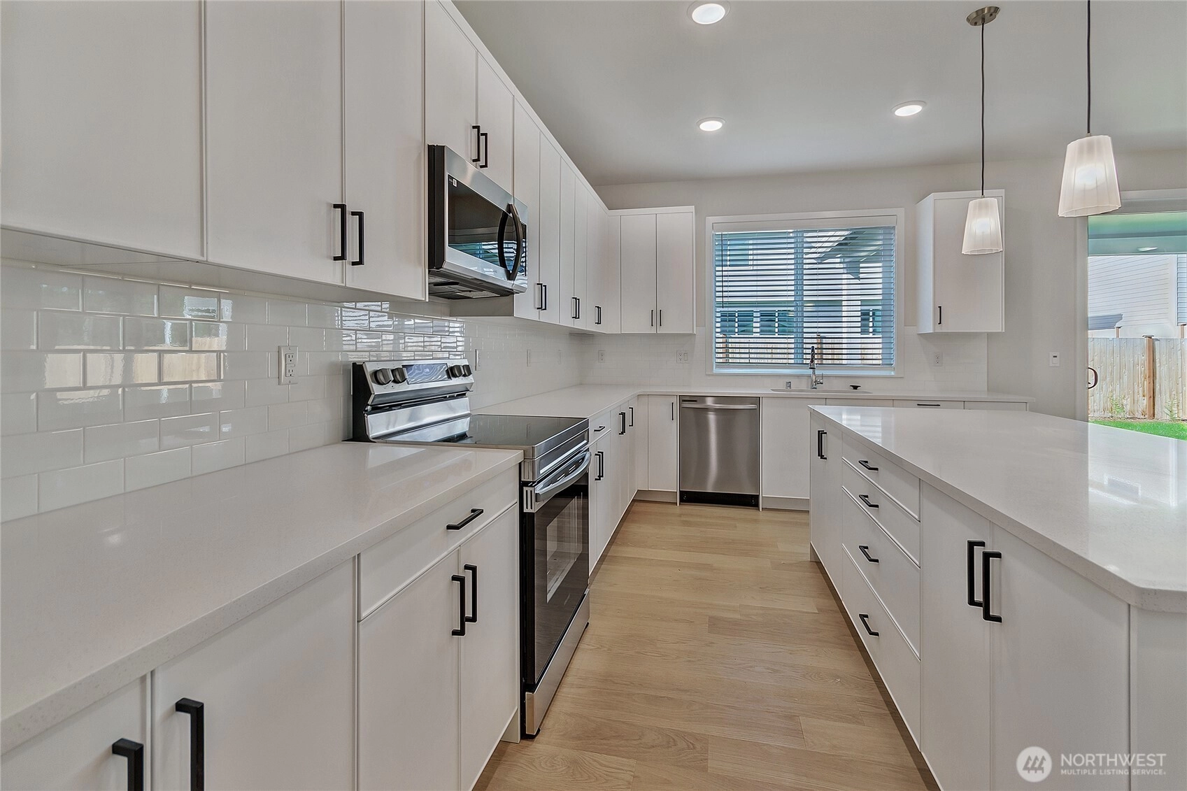The Preserve in Tacoma’s Fredrickson area by Rush Residential offers affordable homes with upscale finishes in a prime location, and Lot 34 stands out with its large corner lot and thoughtful Magnolia plan. This home features 5 bedrooms and 2.75 baths, including a highly desirable main-floor bedroom with a nearby ¾ bath, perfect for guests or multi-generational living. The gourmet kitchen showcases quartz counters, full-height subway tile backsplash, stainless steel appliances, and custom soft-close cabinetry, all complemented by engineered plank flooring throughout the entry, kitchen/nook, powder room, and great room. Additional upgrades include site-painted millwork, a luxury en-suite, blinds, washer/dryer, refrigerator, and A/C. The fully landscaped, fully fenced, and fully irrigated yard—rare for new construction—pairs beautifully with the rear covered patio, creating an ideal space for year-round outdoor entertaining. HOA maintains the front yard. Convenient access to JBLM and major freeways enhances everyday ease. Ask about our trusted lender incentive.