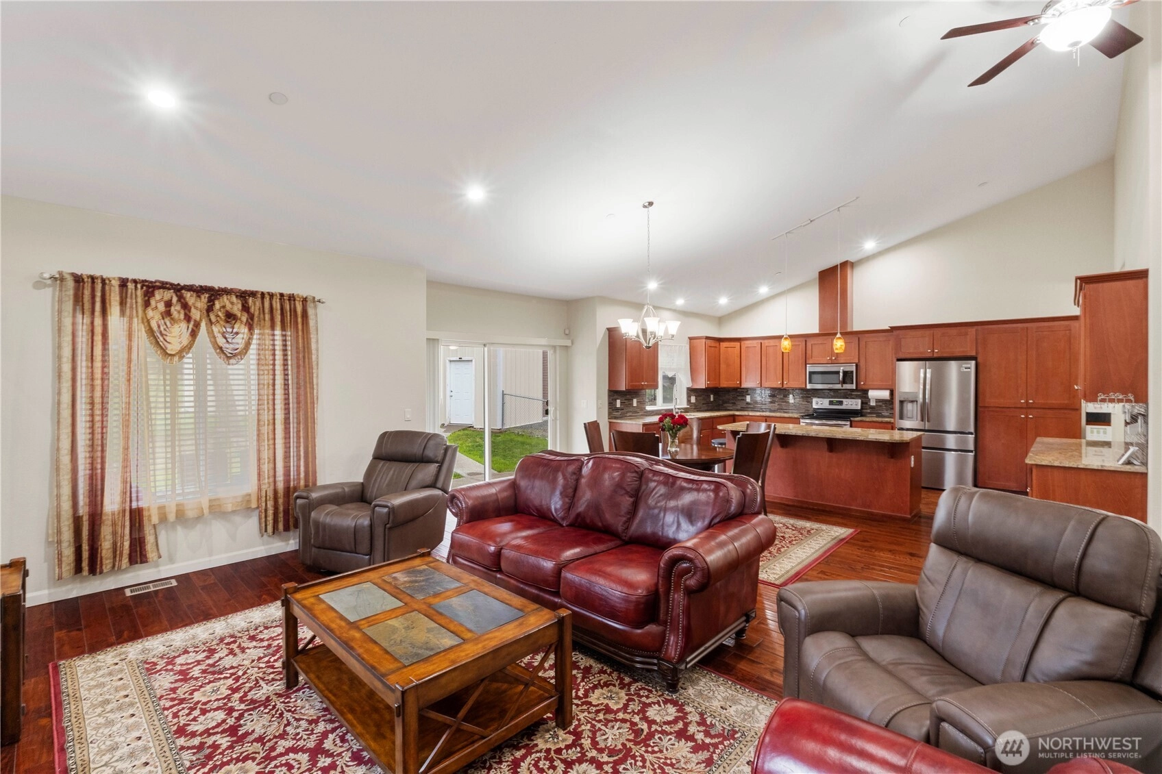 Enjoy stunning mountain views from this beautiful single-level home on sought-after Graham Hill, set on 1.33 serene acres. Designed for comfortable living and effortless flow, this thoughtfully laid-out home offers 3 bedrooms plus a dedicated office, all complemented by rich engineered hardwood floors. At the heart of the home, the spacious kitchen invites gathering, featuring a generous island with breakfast bar, hard surface countertops, and abundant storage. Soaring ceilings from the entry through the living room and kitchen enhance the open-concept design, creating a light and airy feel. A cozy propane fireplace warms winter evenings, while a heat pump keeps things cool all summer long. For added privacy, the primary suite is ideally positioned apart from the secondary bedrooms, separated by the office. This peaceful retreat includes a five-piece bath and a large walk-in closet.Outdoors, the property offers fruit trees, space to garden, and room to roam. The impressive 30x50 insulated steel shop is 16 feet tall with a 12-foot door—perfect for RV or motorhome parking—with reinforced concrete footings and a 6-inch slab. With ample parking and no HOA, this exceptional property truly has it all.