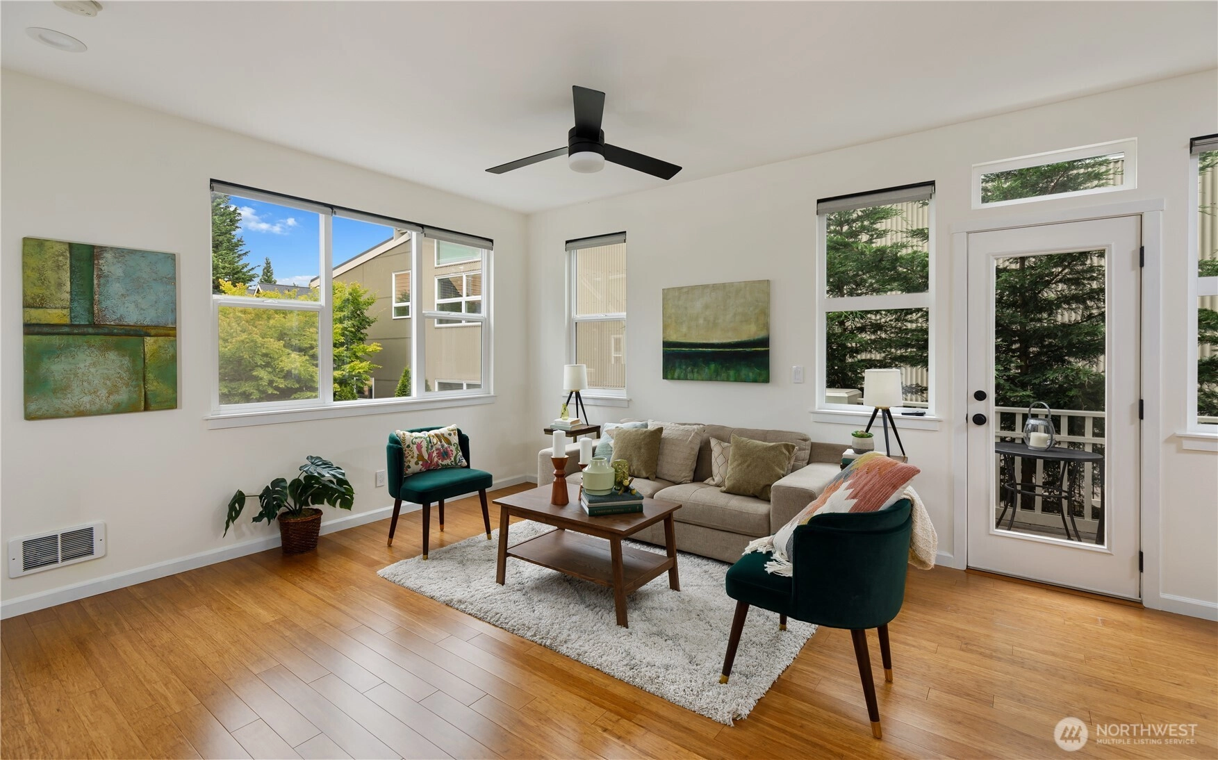 Walk to the Seattle Ferry from this ultimate commuter location in the heart of Winslow. Just blocks from the ferry terminal, this beautifully updated end-unit townhome offers low-maintenance island living with effortless Seattle access, which is perfect for today’s hybrid work lifestyle. Enjoy peaceful Bainbridge surroundings with a seamless trip into the city and unbeatable walkability right outside your front door. Located in sought-after Winslow Mews, this light-filled residence features two Bedrooms plus a Dedicated Office, creating an ideal work-from-home layout. Vaulted ceilings, skylights, and expansive windows enhance the open design, while engineered hardwood floors add warmth and style throughout. The updated kitchen showcases quartz countertops, stainless steel appliances, modern cabinetry, and generous prep space, flowing seamlessly into the living and dining areas, ideal for everyday living and entertaining. Step outside to your private balcony for morning coffee or evening relaxation, and enjoy the community park within the Mews. An attached garage with new epoxy floors supports a true lock-and-leave lifestyle and offers flexibility for parking, storage, or a home gym. Just moments from downtown Winslow’s shops, restaurants, waterfront parks, farmers market, and the ferry terminal, this home truly defines walkable convenience. An exceptional opportunity to secure turnkey comfort in one of Bainbridge Island’s most commuter-friendly locations.