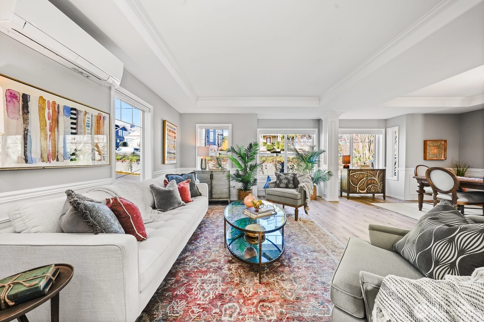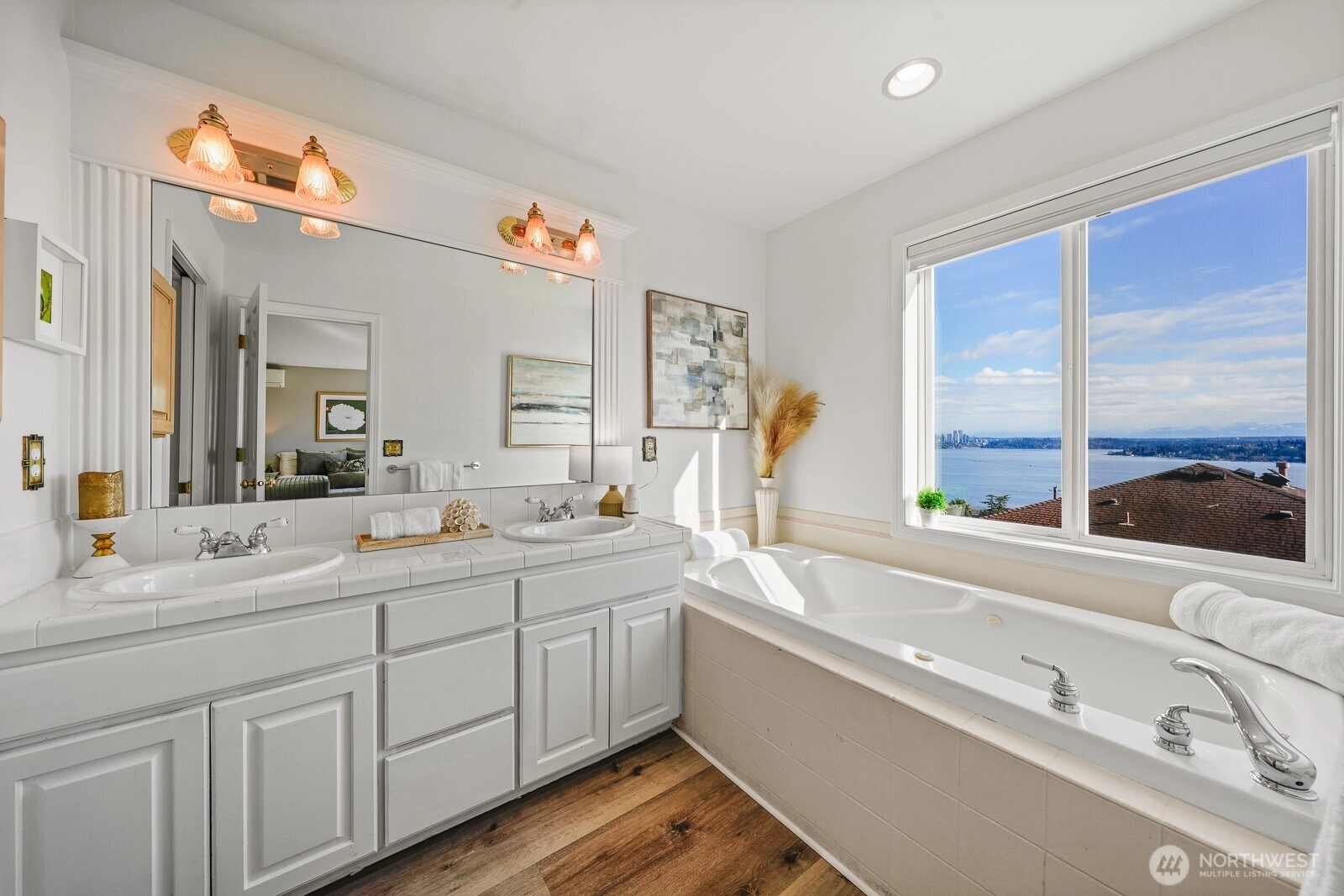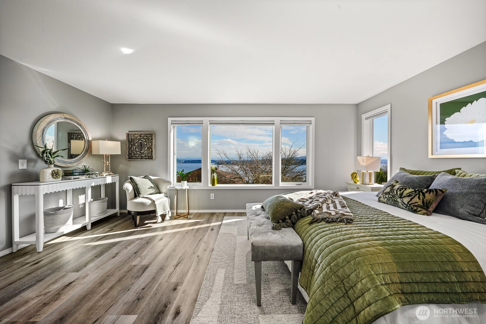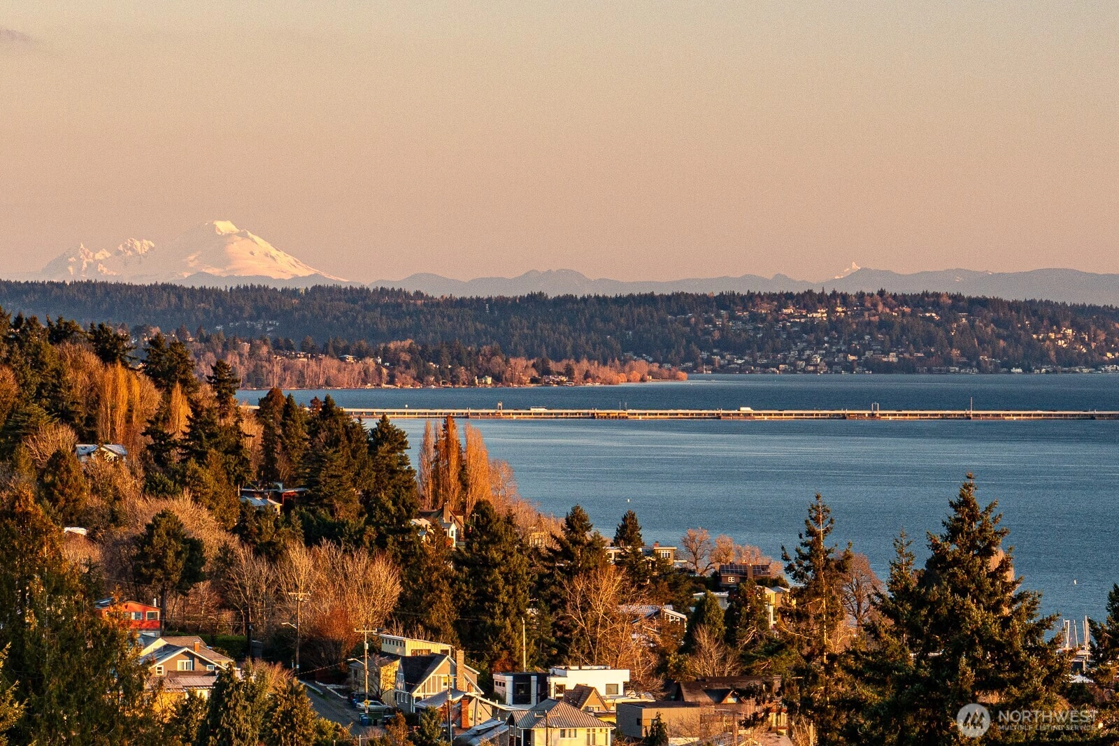 180 degree beautiful view of Lake Washington and the mountains! 4 bedrooms, 2.5 bathrooms, remodeled kitchen, new roof installed in 2025, new luxury high end laminate vinyl flooring installed 2025, newly painted interior and a heat pump with air conditioning! Roof top deck for private relaxation! Artificial turf in back yard for easy maintenance. 2 car attached garage with EV charging. Home is on a quiet street but is also a couple of blocks close to restaurants and retail stores. Live a great life here!