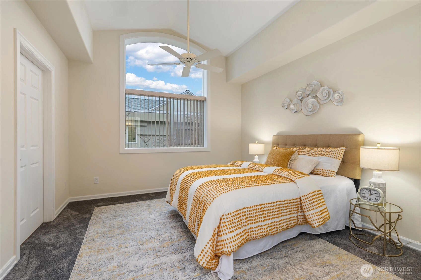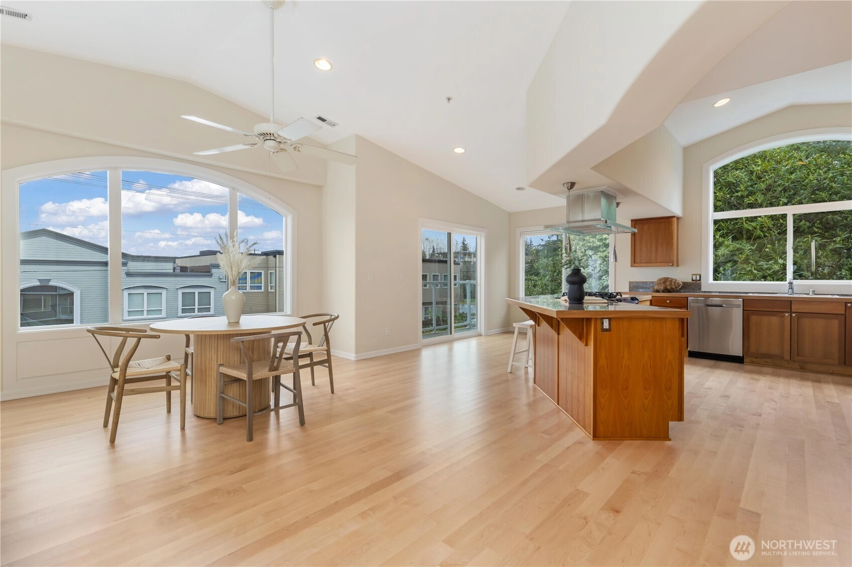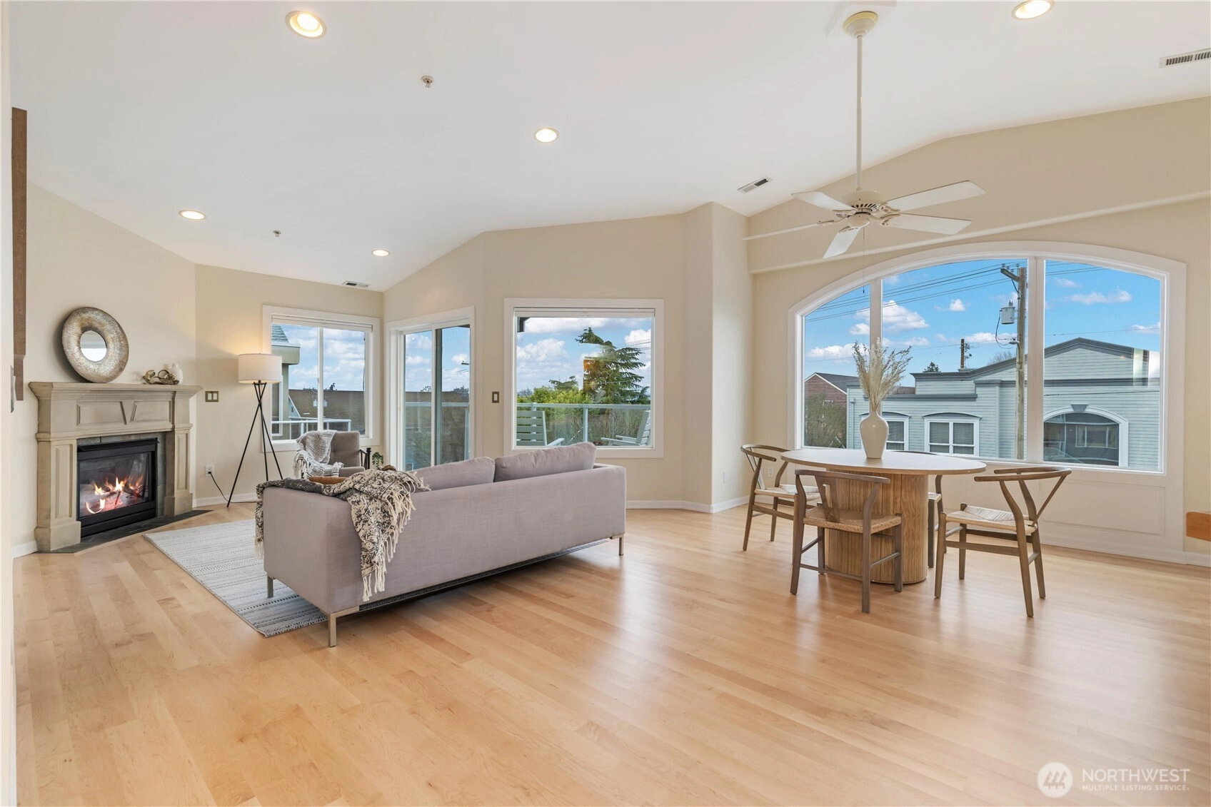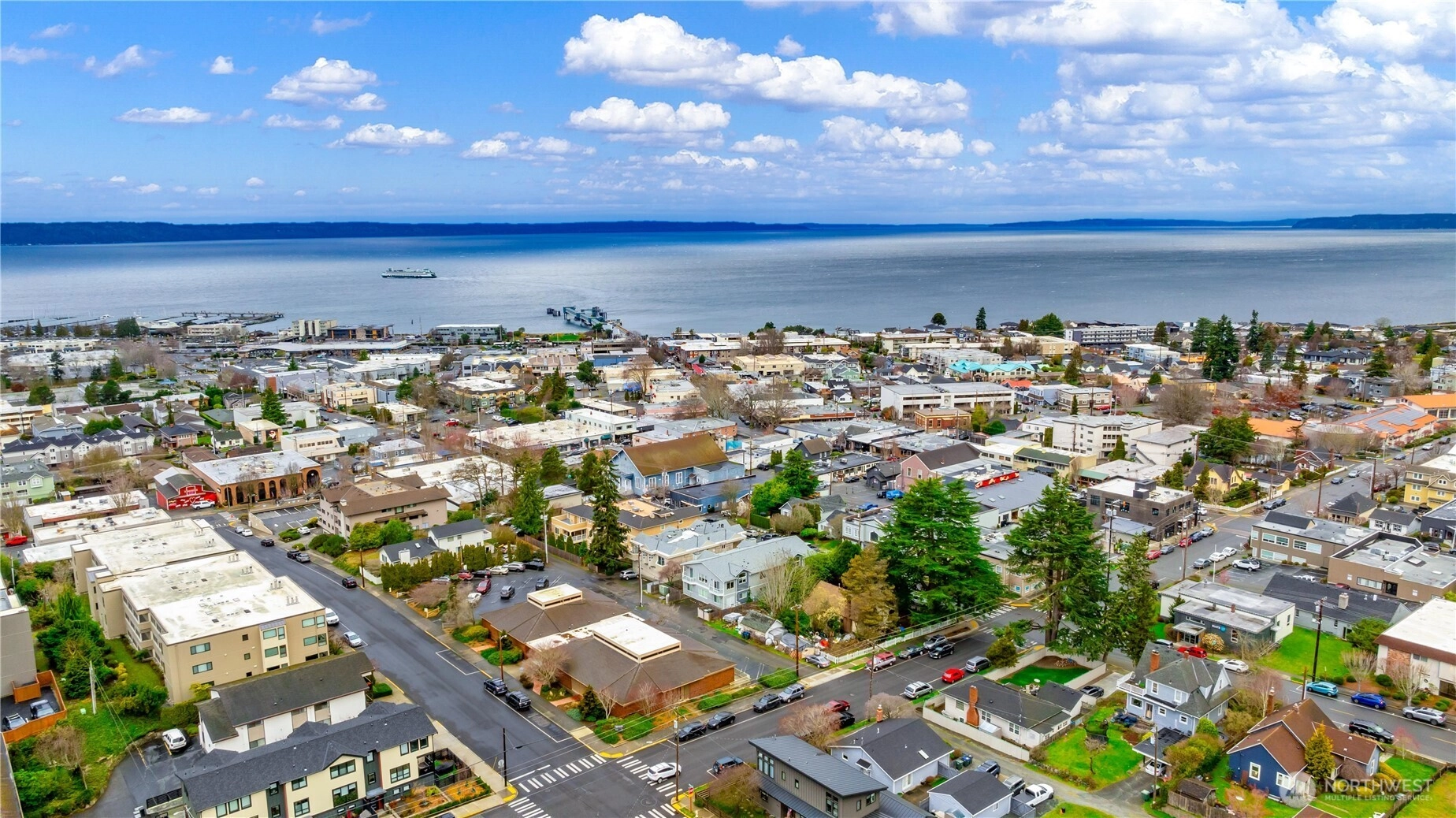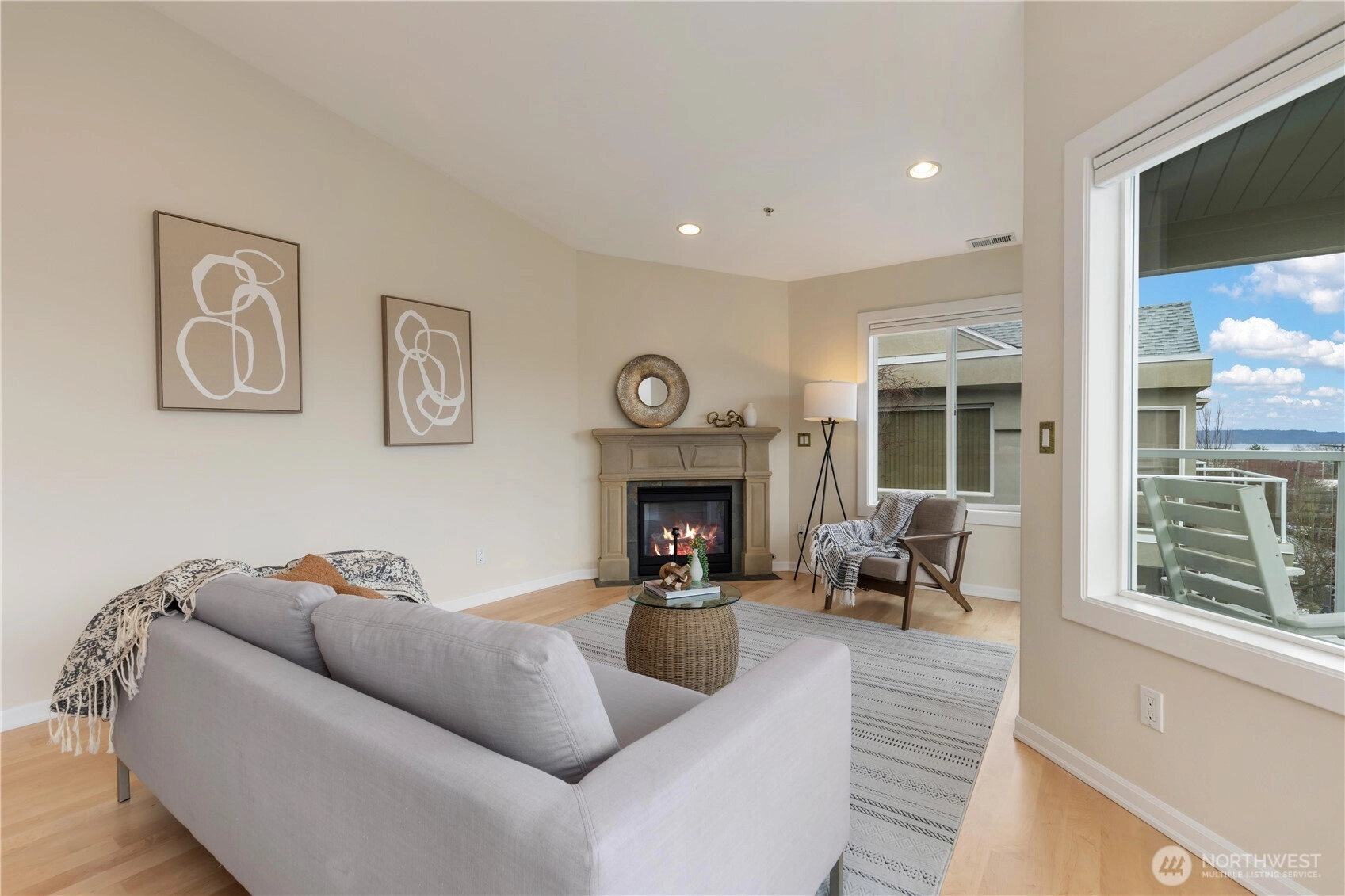 Incredible 2 bedroom view condo in the "Edmonds Bowl". Enjoy the bright light created by tall windows and the vaulted ceilings in this top floor unit. There are 2 balconies to enjoy sunsets over the sound. An open floor plan combines your kitchen, dining room and living for a fabulous entertaining area with a fireplace and a view. Your primary is en suite with a 3/4 bath. The storeroom is 8x8 and is fully finished. There are 2 dedicated parking spaces, one outside and one in the heated garage. Walkable to all things Edmonds. Make your next move to Edmonds!