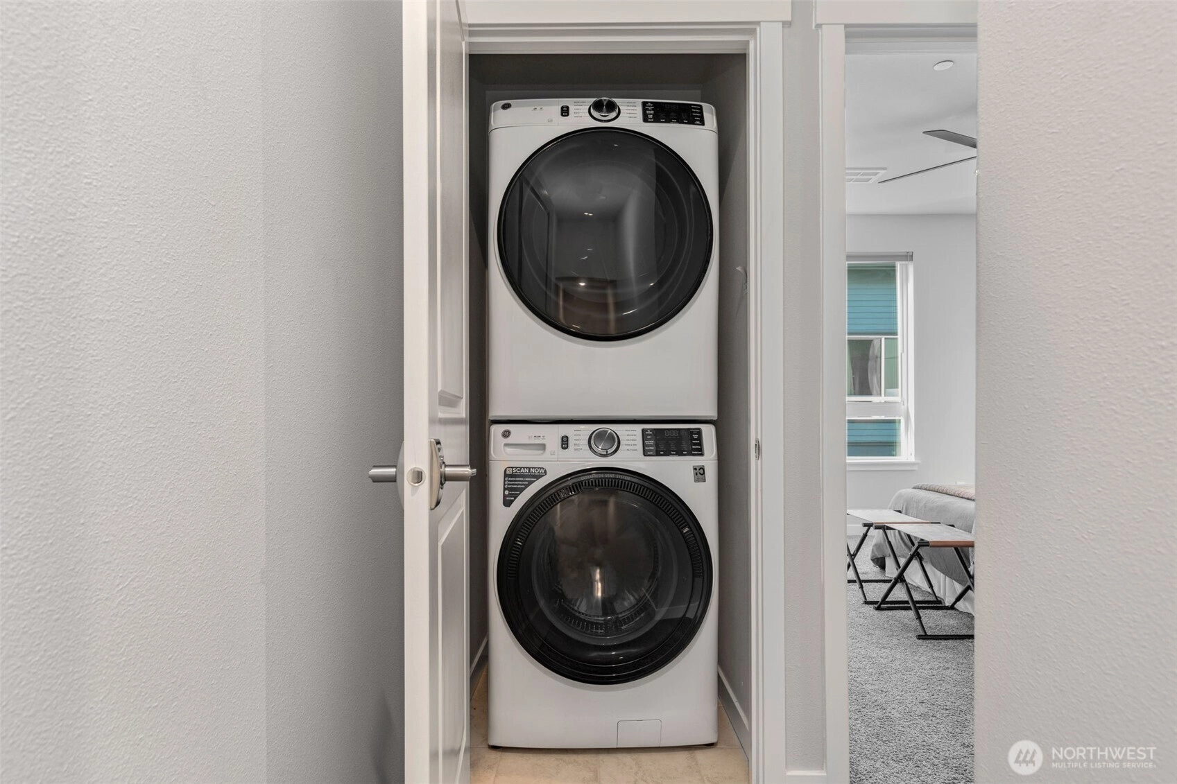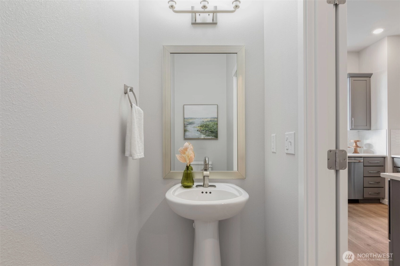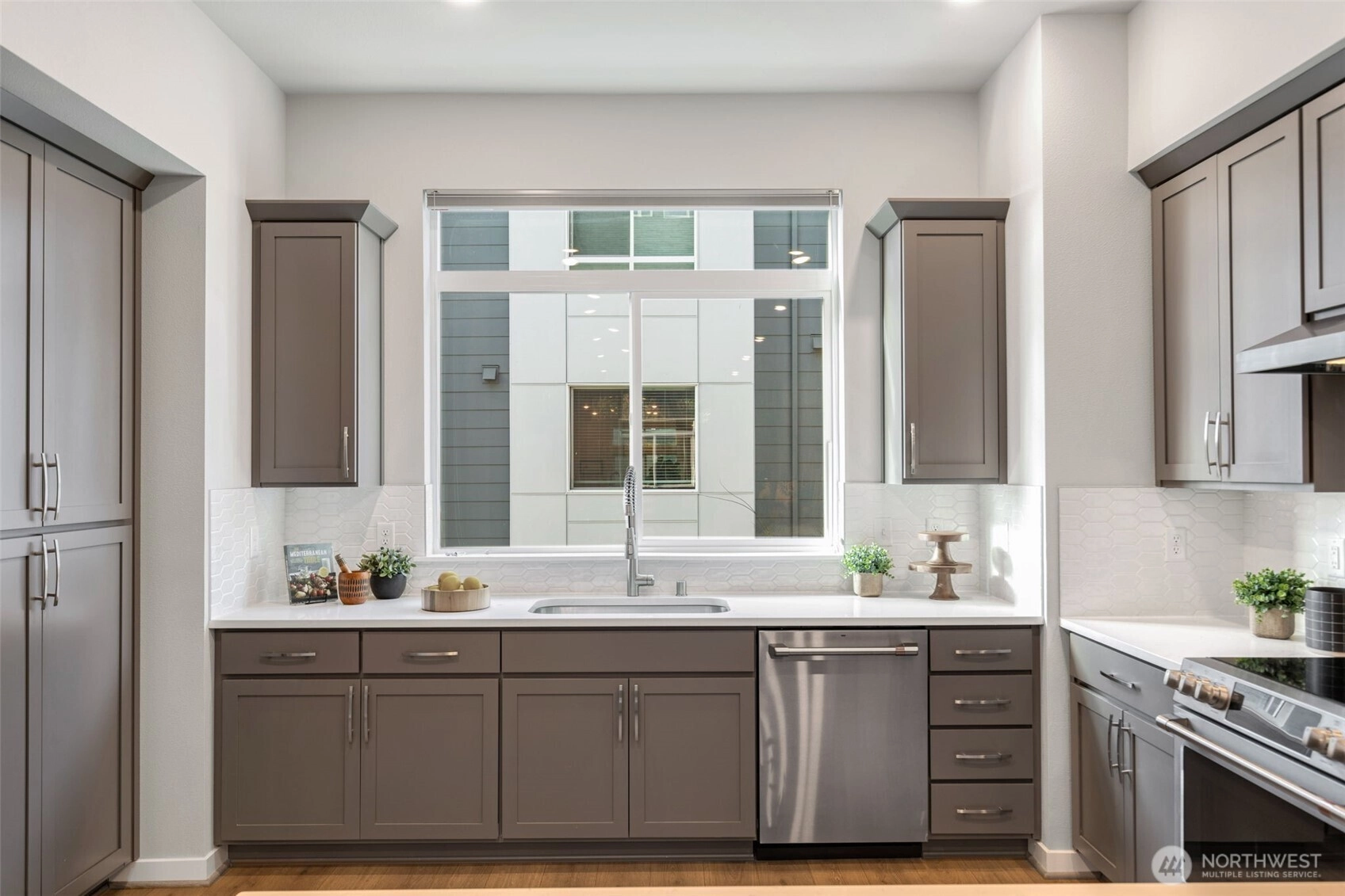 Welcome to elevated modern living in this beautifully crafted 3-bedroom, 2.25-bath townhouse where thoughtful design and everyday comfort come together seamlessly. Soaring ceilings and large windows create an airy open-concept main level, while luxury vinyl plank flooring and contemporary finishes create a warm, sophisticated ambiance. The seamless flow between the living, dining, and kitchen spaces makes both entertaining and daily living effortless. At the heart of the home, the stunning kitchen features quartz countertops, abundant cabinetry, stainless-steel appliances, and generous prep and pantry space—perfectly designed for gathering and gourmet inspiration alike. Upstairs, two spacious bedrooms with expansive windows and tall ceilings share a well-appointed full bath with dual vanities. The roomy top-floor primary suite offers a private sanctuary complete with an ensuite bath and dual closets. Just outside the primary, a versatile office or reading nook provides the ideal flex space. Step onto the rooftop deck overlooking a serene wooded backdrop—an inviting retreat for morning coffee or evening unwinding. The tandem two-car garage offers exceptional storage and flexibility, while EV charging adds modern convenience. Ideally located near downtown Bothell, the Burke-Gilman Trail, Lake Washington, and major commuter routes (522 and I-405), this home delivers refined, low-maintenance living in a prime setting.