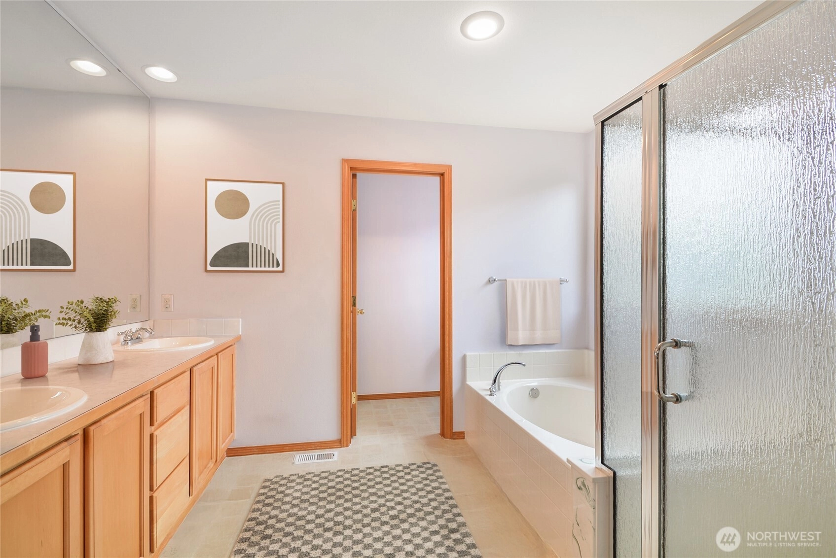 This beautiful, 5 bedroom, move-in-ready, one-owner home offers exceptional value in the desirable Mill Creek neighborhood! The open floor plan features a bright living room with LVP flooring, inviting gas fireplace, and vaulted ceilings that extend into the dining area. The chef’s kitchen is equipped with a Wolf oven/gas range, a newer refrigerator, trend stone counters, and abundant storage. Adjacent is an open family room featuring a gas fireplace. The main floor includes a well-sized bedroom, perfect for a home office. Upstairs, the spacious primary suite offers vaulted ceilings, ample natural light, and a bathroom with double sinks, a separate shower, a tub, and a large walk-in closet with an organizer. Three additional generous bedrooms are also upstairs; two include walk-in closets. Additional features include a 2-car garage with 273 sq. ft. of loft storage is amazing! The easy-care, fully fenced yard features a charming front porch that overlooks the pristine turf in the front, and a patio and deck in the back, which are great spaces to relax or entertain on sunny days. Recent updates include siding, roof, furnace, appliances, fencing, and flooring. Extra parking out front is perfect for guests. The home is located near highly-rated schools and is minutes away from shopping and dining at the Mill Creek Town Center, with easy access to I-5, Hwy 9, and I-405. This stunning home is priced to sell!