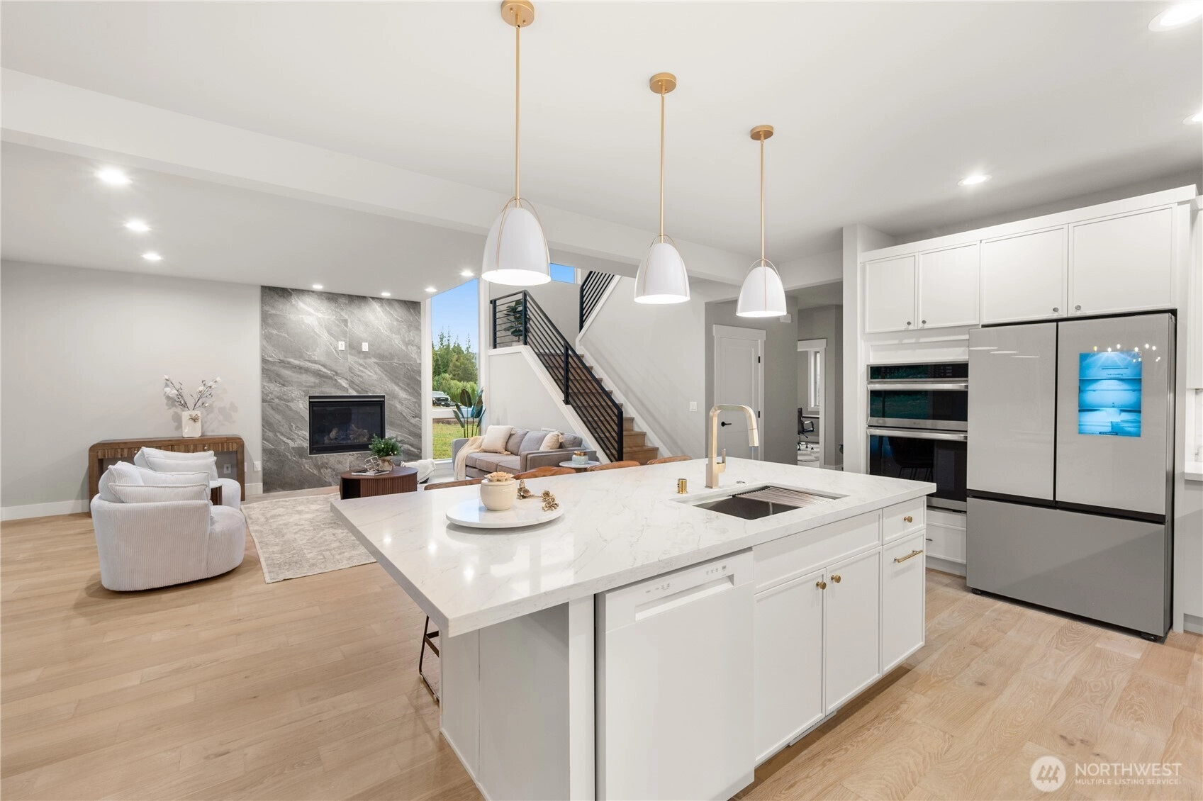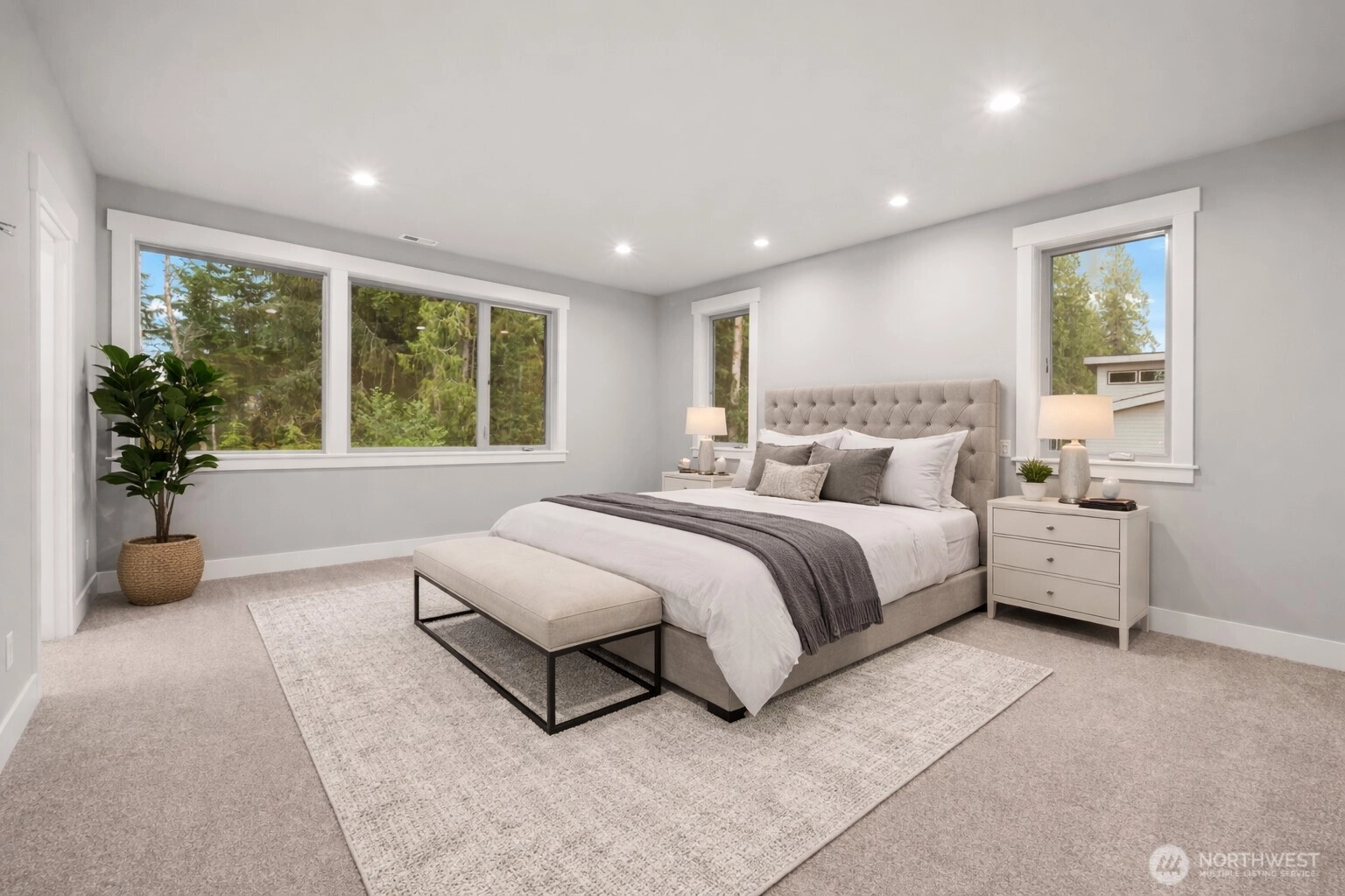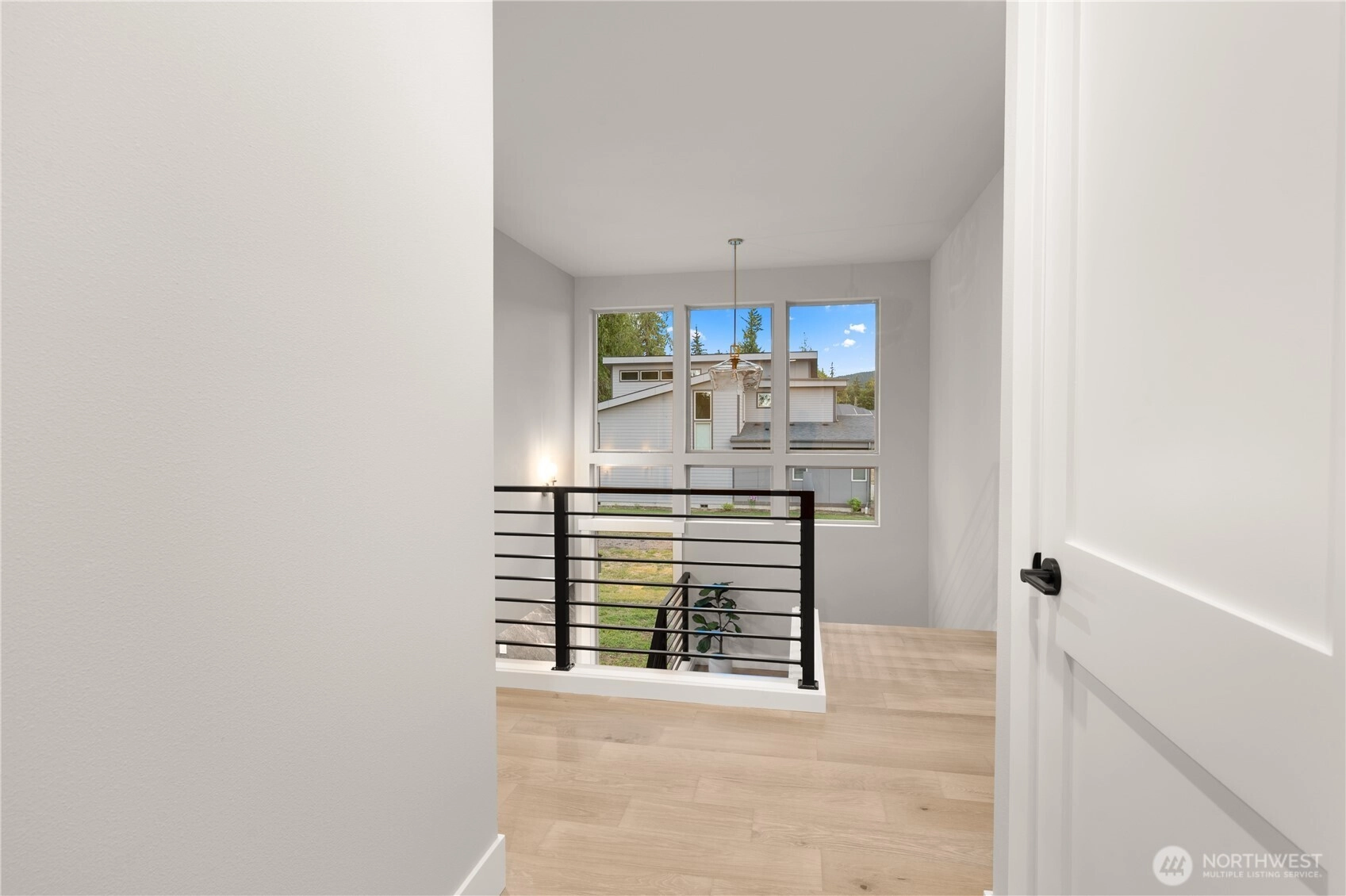 Nestled in private greenery with mountain views,this new build offers a blend of comfort and privacy.Spacious gourmet kitchen features 8-feet island, quartz countertops,elegant accent dining cabinetry with shelving and wine cooler,coffee nook built-in, premium smart appliances, modern lighting and fixtures.The bright great room boasts soaring floor-to-ceiling windows and modern gas fireplace.9 feet ceilings, closet systems and hardwood floors throughout.The luxurious primary suite with huge shower, freestanding tub and spacious walk-in closet.A second HUGE bedroom upstairs boasts office space.3rd bedroom includes walk-in closet and built-in make up table.Enjoy covered deck.Huge leveled lot with so much potential.