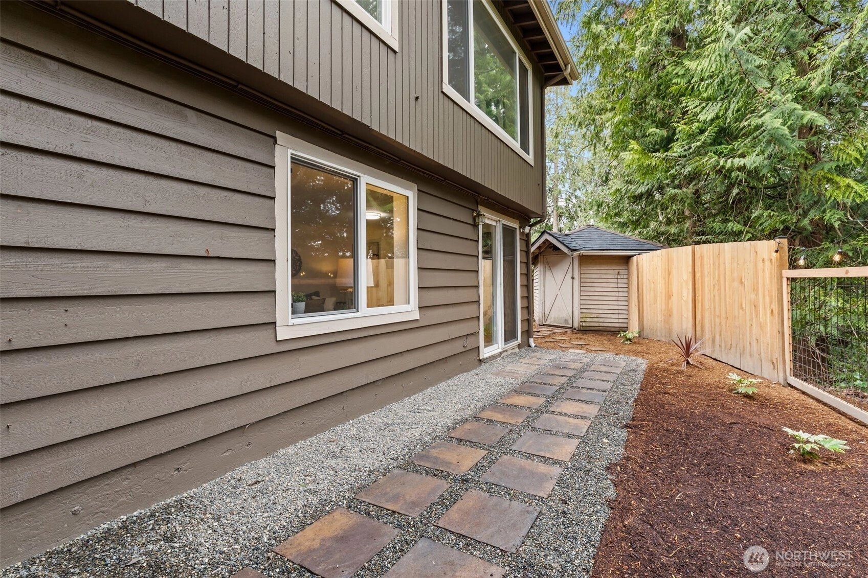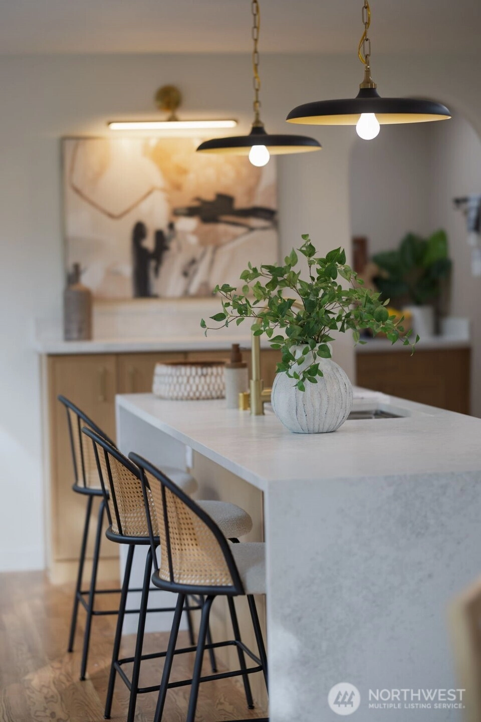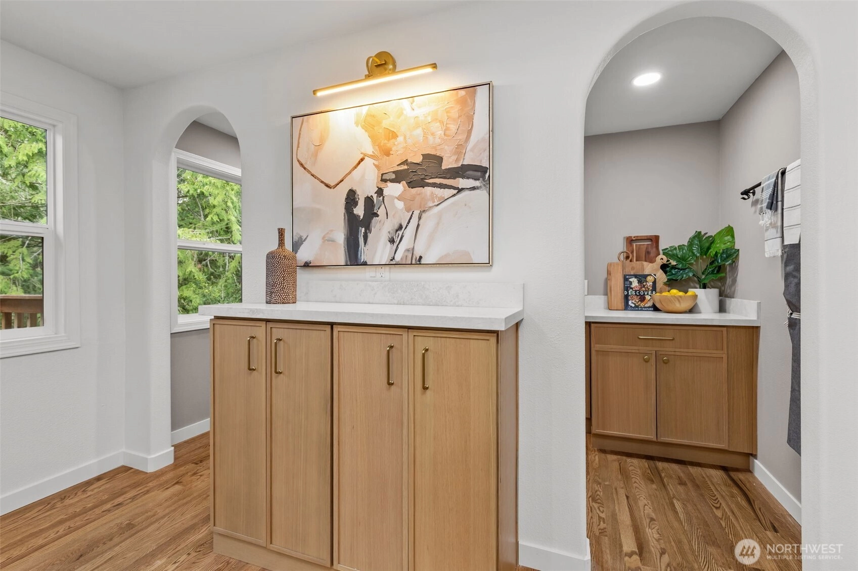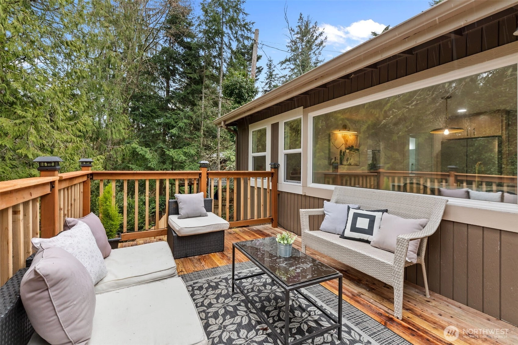 Nestled at the end of a quiet cul-de-sac, this warm and sophisticated Shoreline retreat blends elevated design with effortless livability. Perched on a private lot with woodland views, the home invites you to gather in the bespoke kitchen or unwind on the newly built BBQ-ready deck. Dramatic double-door entry with soaring ceilings sets the tone, opening to hardwood floors that flow throughout the main level. The kitchen is a true showpiece—anchored by a 9' honed quartz waterfall island and wrapped in wood cabinetry with clean, modern lines. Thoughtful mood and task lighting, custom vent hood, designer tile backsplash, and a dedicated beverage station elevate both form and function. A dreamy walk-through butler’s pantry with arched openings, extended cabinetry, generous counter space, wood floors, and a sunny window adds charm and practicality. The spacious living/dining areas continue the airy feel with hardwood floors and abundant windows framing lush greenery. The main-level primary suite offers comfort and privacy, complete w/ ensuite bath featuring a floating vanity and custom tilework. Two addl' bedrooms and a large bathroom w/ skylights complete the main floor. Downstairs, an extended family room/flex space opens to the yard, accompanied by a spacious fourth bedroom, full bathroom, and ample storage. Outside, enjoy refreshed landscaping and new fence. Modern refinement meets everyday comfort in this exquisite space—minutes from parks, dining, and shopping. Welcome home!