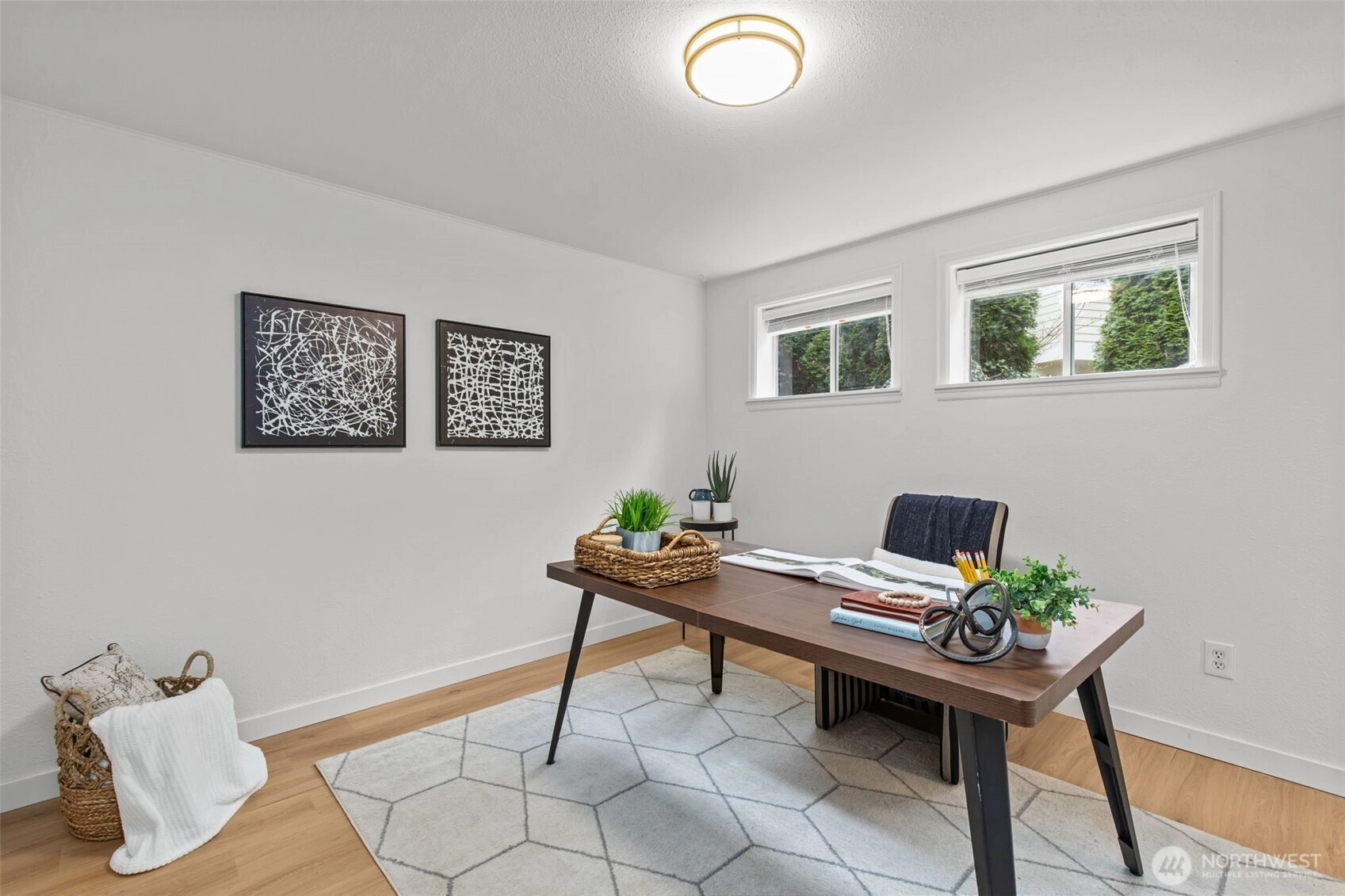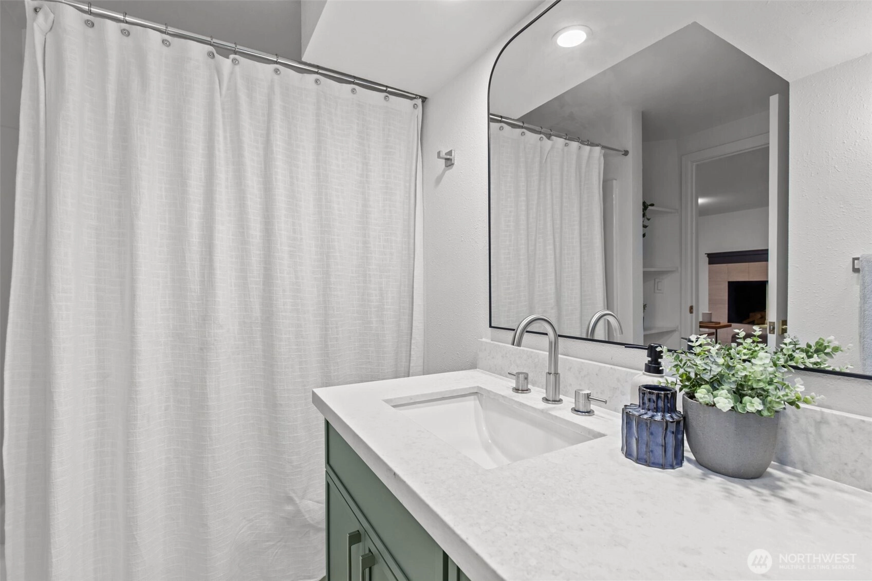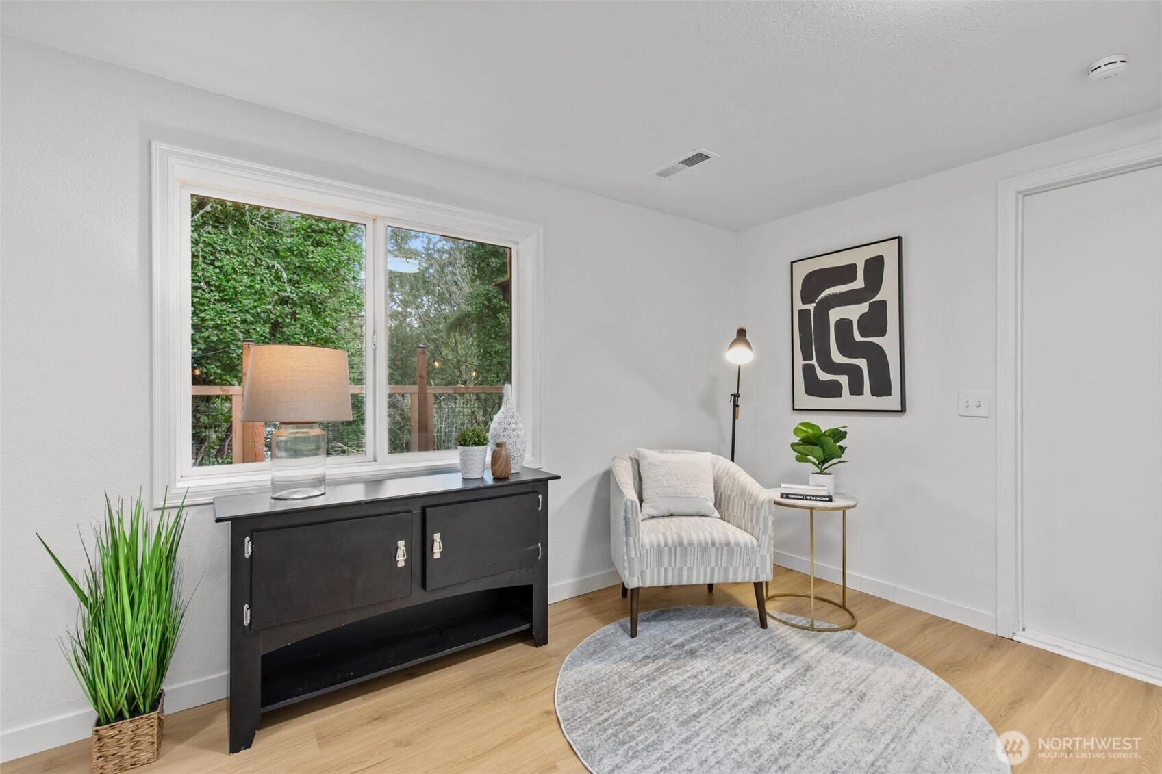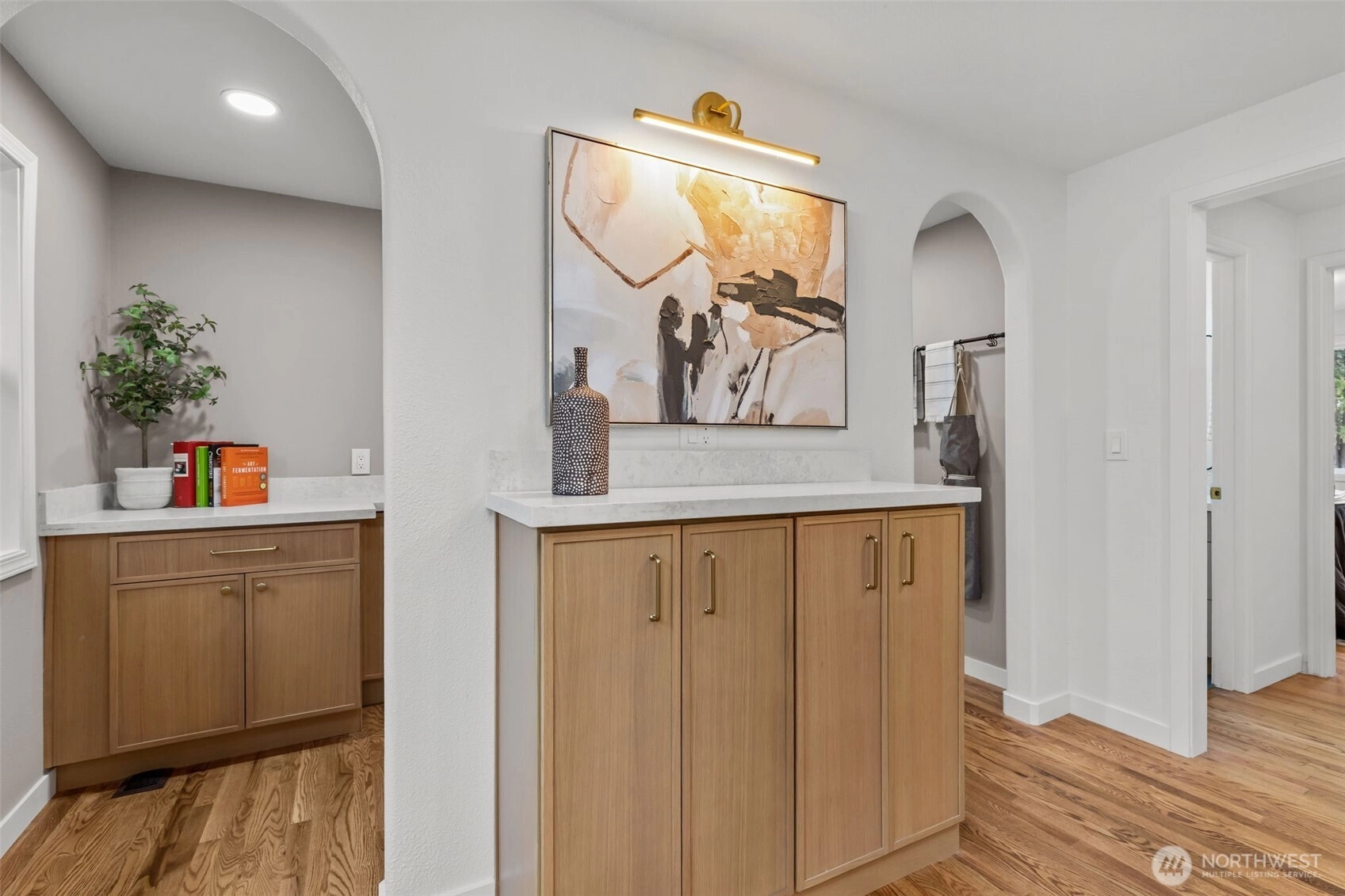 Nestled at the end of a quiet cul-de-sac, this warm and sophisticated Shoreline retreat blends elevated design with effortless livability. Perched on a private lot with woodland views, the home invites you to gather in the bespoke kitchen or unwind on the newly built BBQ-ready deck. Dramatic double-door entry with soaring ceilings sets the tone, opening to hardwood floors that flow throughout the main level. The kitchen is a true showpiece—anchored by a 9' honed quartz waterfall island and wrapped in wood cabinetry with clean, modern lines. Thoughtful mood and task lighting, custom vent hood, designer tile backsplash, and a dedicated beverage station elevate both form and function. A dreamy walk-through butler’s pantry with arched openings, extended cabinetry, generous counter space, wood floors, and a sunny window adds charm and practicality. The spacious living/dining areas continue the airy feel with hardwood floors and abundant windows framing lush greenery. The main-level primary suite offers comfort and privacy, complete w/ ensuite bath featuring a floating vanity and custom tilework. Two addl' bedrooms and a large bathroom w/ skylights complete the main floor. Downstairs, an extended family room/flex space opens to the yard, accompanied by a spacious fourth bedroom, full bathroom, and ample storage. Outside, enjoy refreshed landscaping and new fence. Modern refinement meets everyday comfort in this exquisite space—minutes from parks, dining, and shopping. Welcome home!