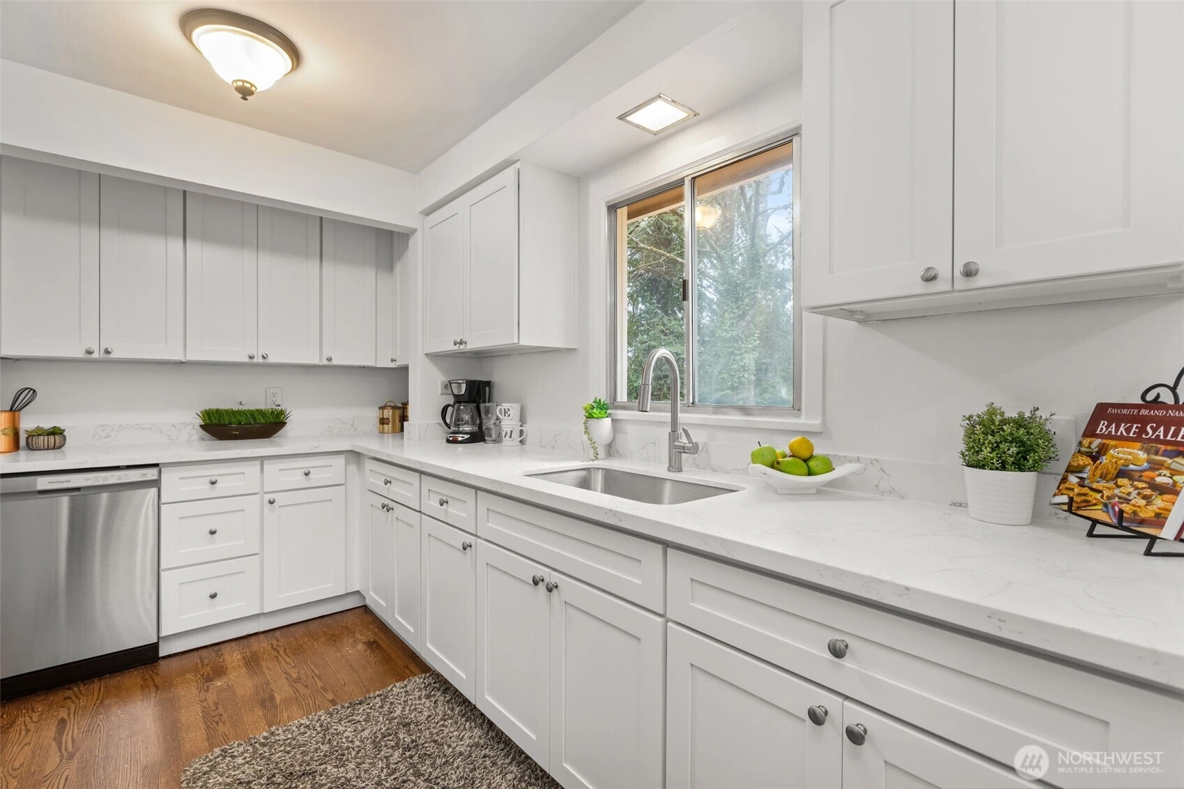 Beautifully updated 3-bedroom home tucked at the end of a quiet cul-de-sac just minutes to town and freeway access. Refinished original hardwoods run throughout the main living areas, complemented by LVP in the spacious bonus living area, offering flexible space for media, office, or play. The kitchen has been fully refreshed with brand new cabinets, countertops, and appliances, paired with all-new interior paint for a crisp, move-in ready feel. Thoughtful layout with convenient 1/2 bath access off the primary suite. Step outside to a large, private backyard with deck and peek-a-boo views of Kitsap Lake. Enjoy the peaceful and established neighborhood with privacy, yet close to everyday amenities.