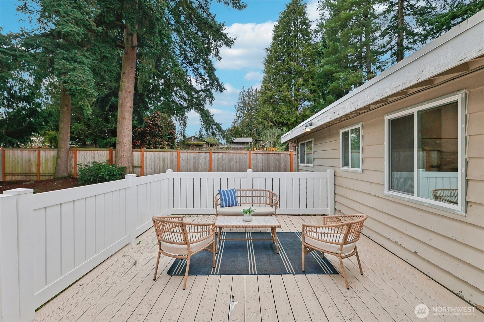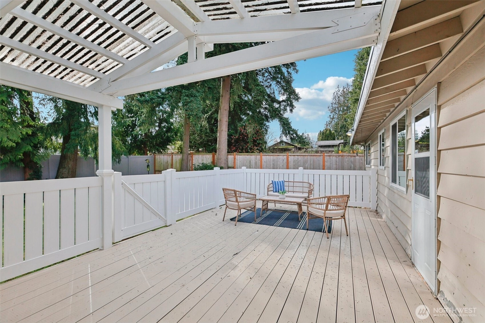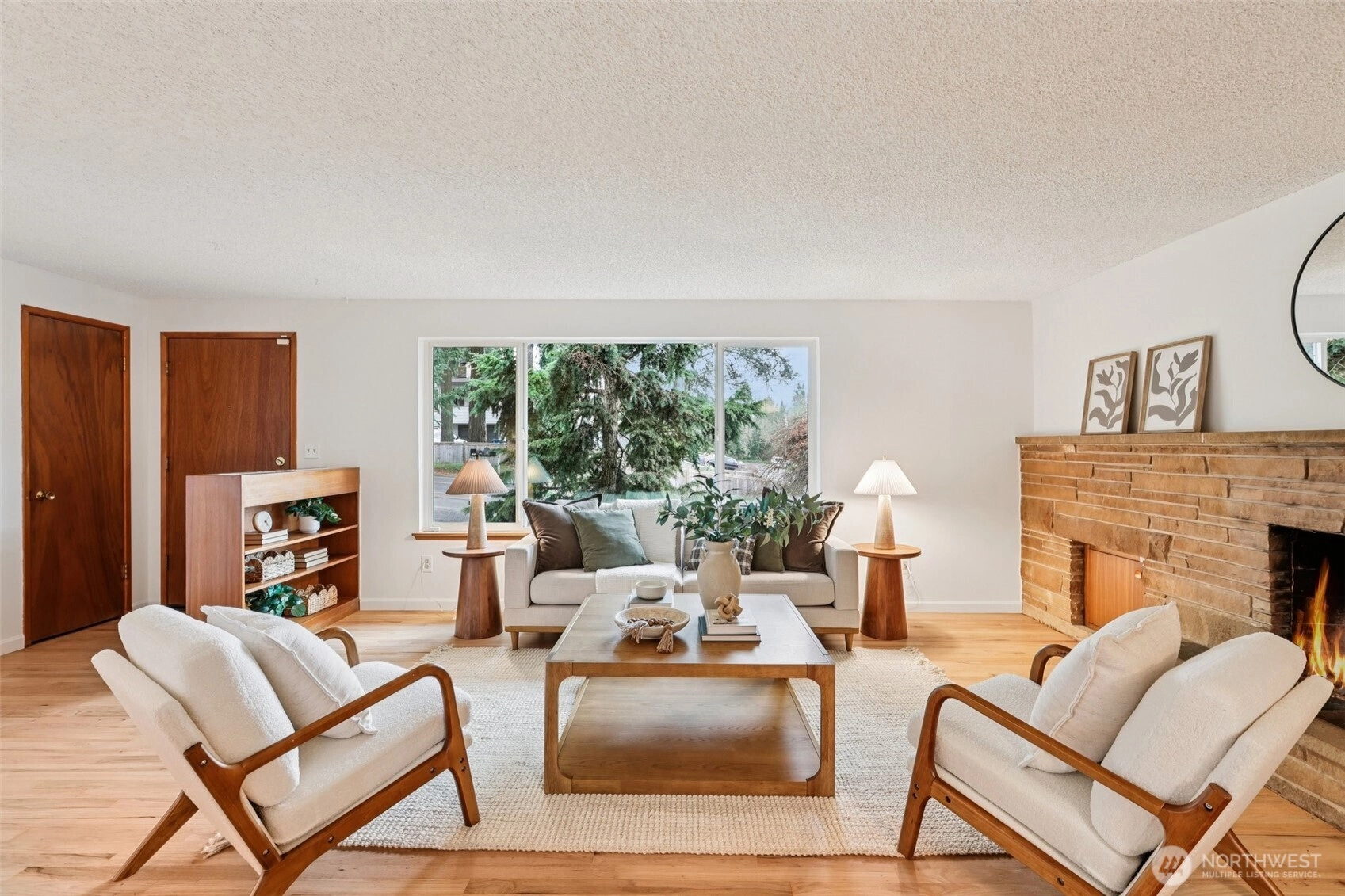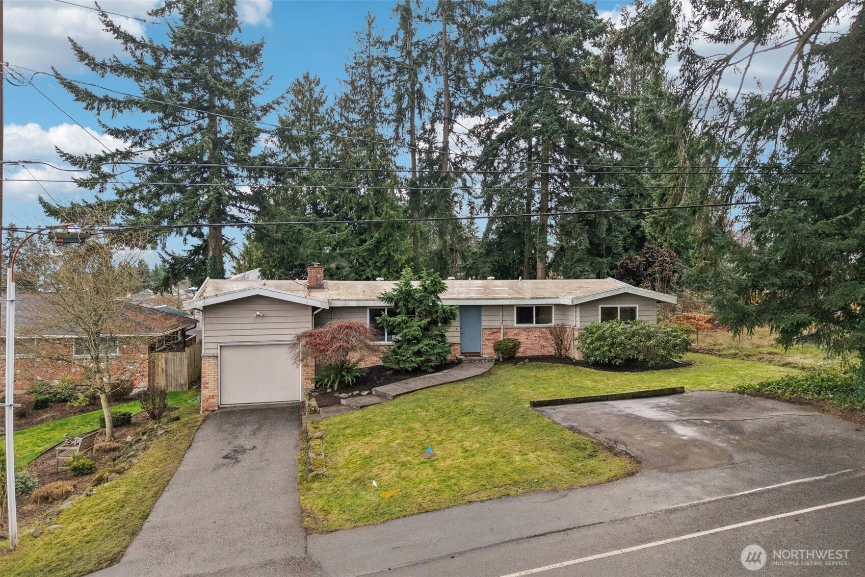 This Mid-Century home showcases the design and charm you'll adore! Inside the original hardwood floors are freshly redone enhancing the classic brick fireplace and large windows for maximum natural light. Hardwood floors continue through the living room, dining room, and main bedrooms. An attached family room offers additional gathering space or media room opening through glass doors to a private covered deck and fenced backyard, ideal for indoor-outdoor living and entertaining. Enjoy year around comfort with a wood burning fireplace and a heat pump with air conditioning. This home also offers a roomy dining area, an eat-in kitchen, and charming mid-century built-ins and details. Laundry room with 3/4 bathroom. Park in the garage or use additional paved parking spaces in the front. Enjoy easy one-level living in a beloved Edmonds location close to parks, great schools, downtown Edmonds, the waterfront, and convenient commuter access. Seller has pre-inspected. Welcome home!
