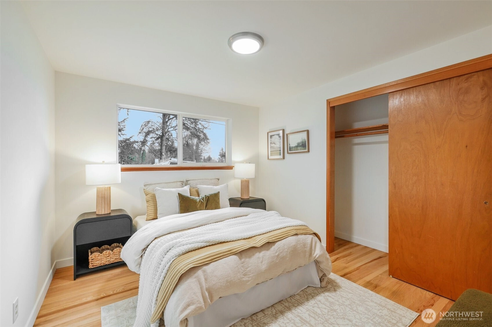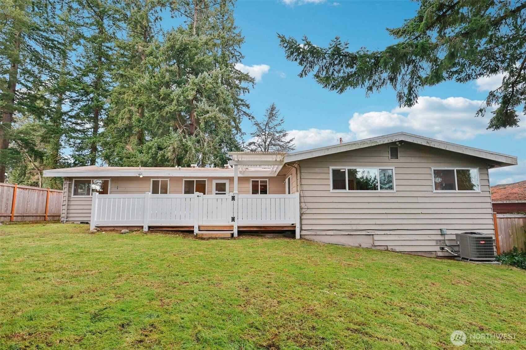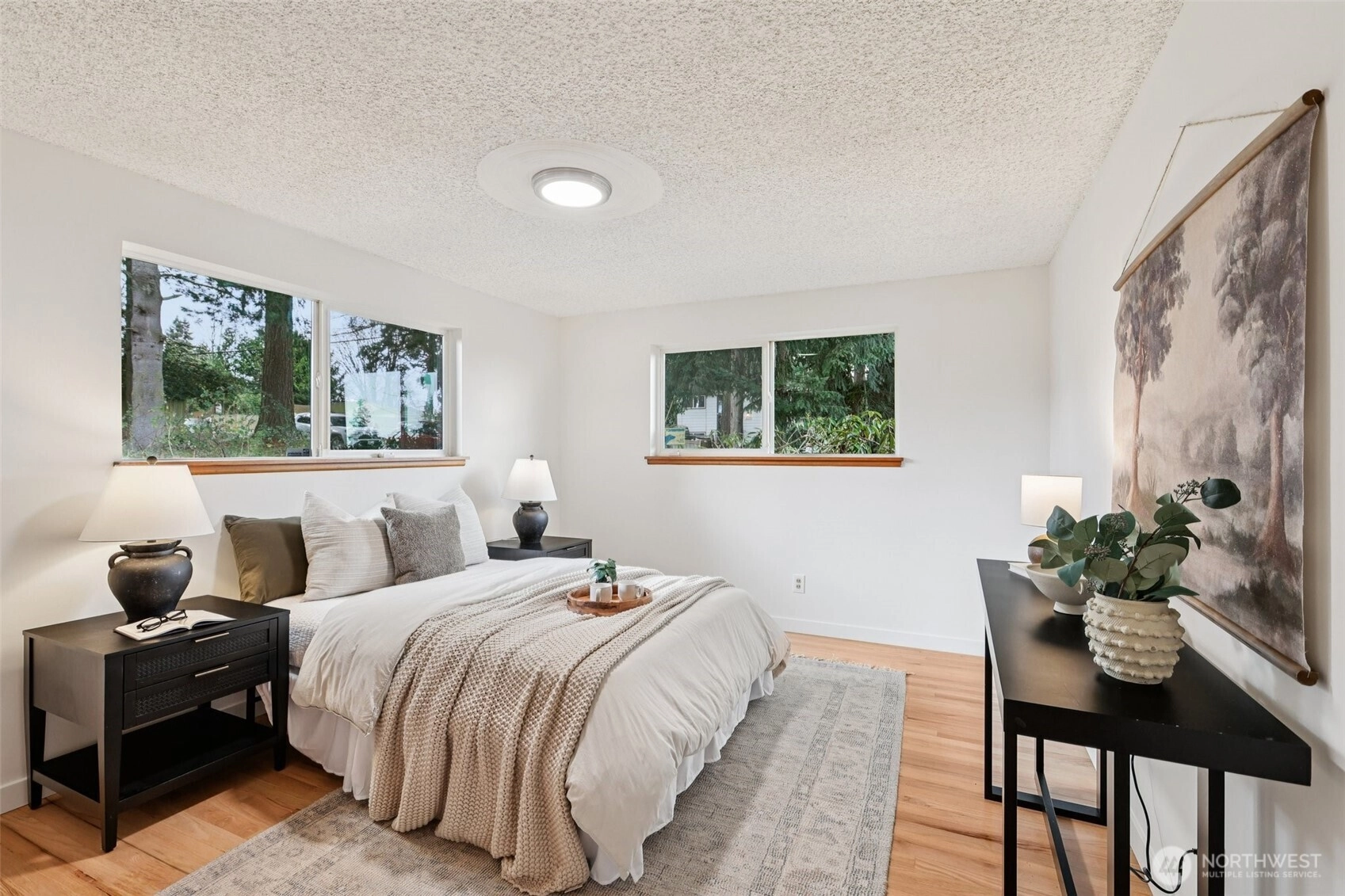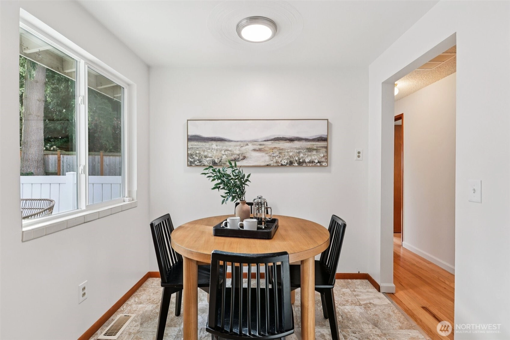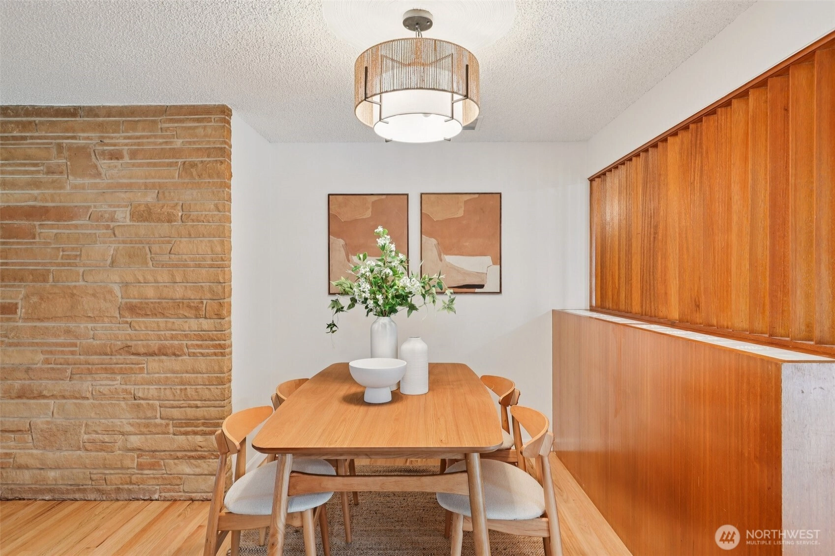 This Mid-Century home showcases the design and charm you'll adore! Inside the original hardwood floors are freshly redone enhancing the classic brick fireplace and large windows for maximum natural light. Hardwood floors continue through the living room, dining room, and main bedrooms. An attached family room offers additional gathering space or media room opening through glass doors to a private covered deck and fenced backyard, ideal for indoor-outdoor living and entertaining. Enjoy year around comfort with a wood burning fireplace and a heat pump with air conditioning. This home also offers a roomy dining area, an eat-in kitchen, and charming mid-century built-ins and details. Laundry room with 3/4 bathroom. Park in the garage or use additional paved parking spaces in the front. Enjoy easy one-level living in a beloved Edmonds location close to parks, great schools, downtown Edmonds, the waterfront, and convenient commuter access. Seller has pre-inspected. Welcome home!