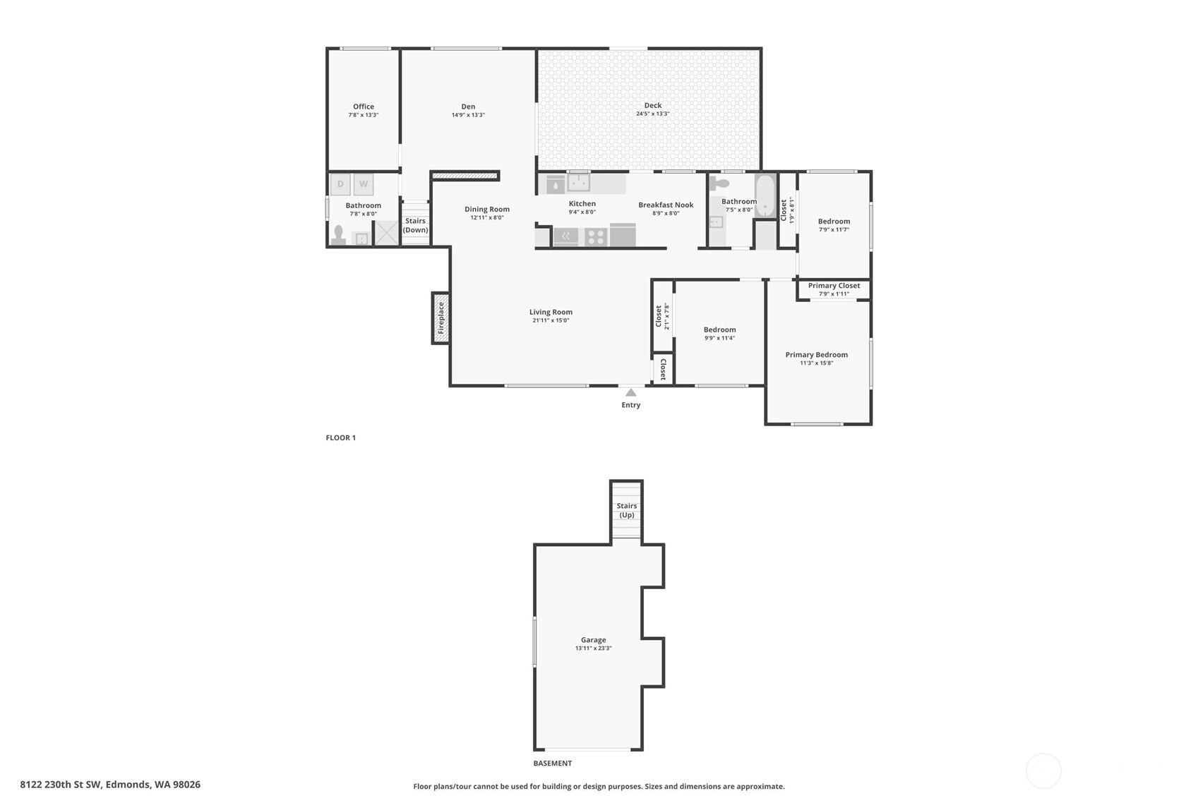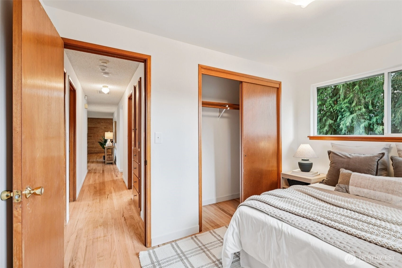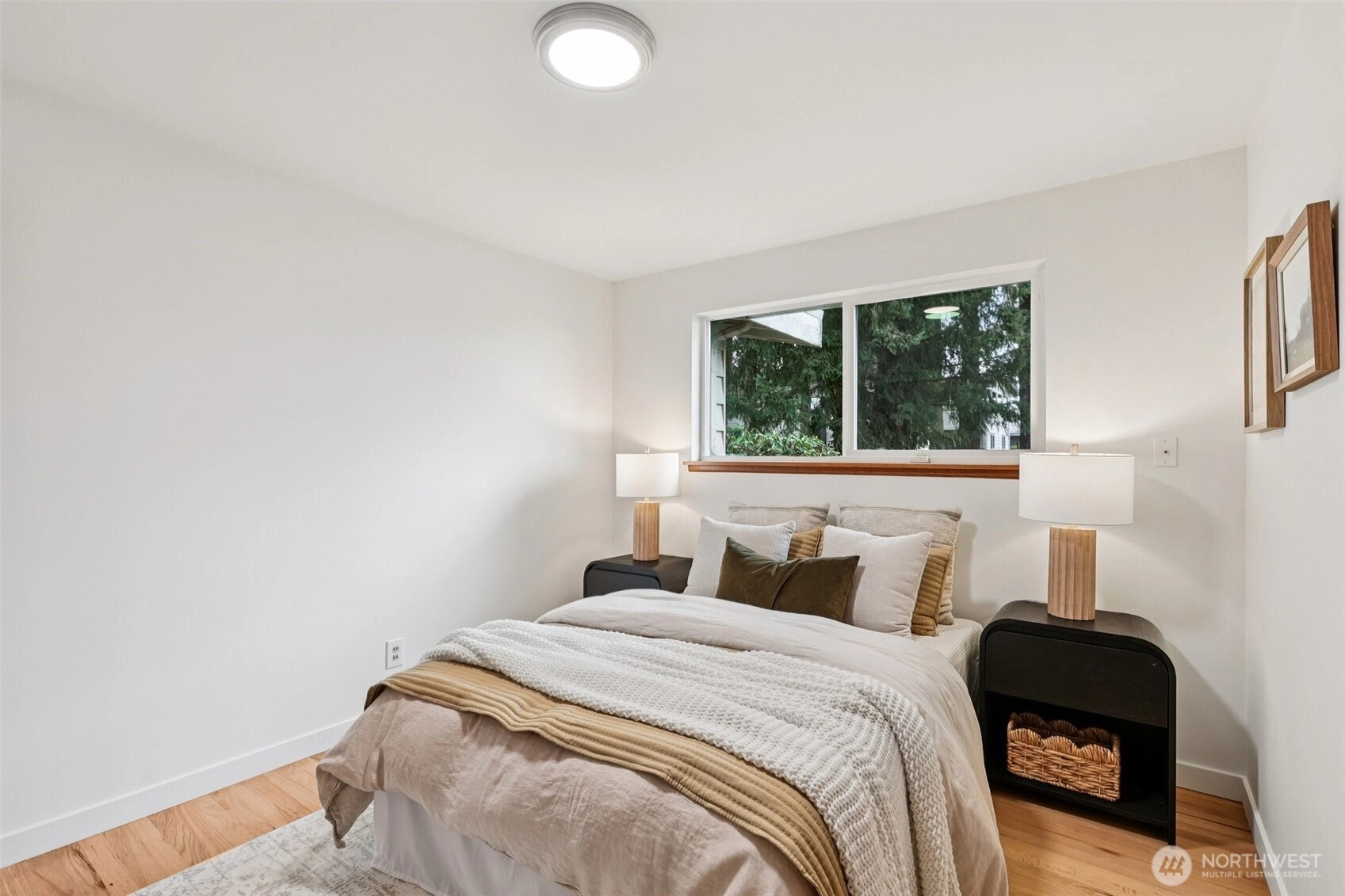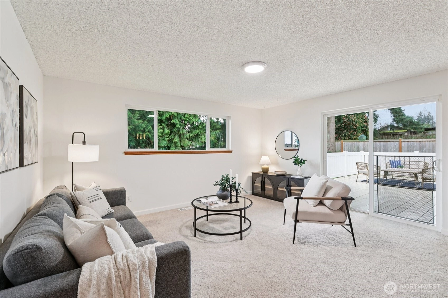 This Mid-Century home showcases the design and charm you'll adore! Inside the original hardwood floors are freshly redone enhancing the classic brick fireplace and large windows for maximum natural light. Hardwood floors continue through the living room, dining room, and main bedrooms. An attached family room offers additional gathering space or media room opening through glass doors to a private covered deck and fenced backyard, ideal for indoor-outdoor living and entertaining. Enjoy year around comfort with a wood burning fireplace and a heat pump with air conditioning. This home also offers a roomy dining area, an eat-in kitchen, and charming mid-century built-ins and details. Laundry room with 3/4 bathroom. Park in the garage or use additional paved parking spaces in the front. Enjoy easy one-level living in a beloved Edmonds location close to parks, great schools, downtown Edmonds, the waterfront, and convenient commuter access. Seller has pre-inspected. Welcome home!