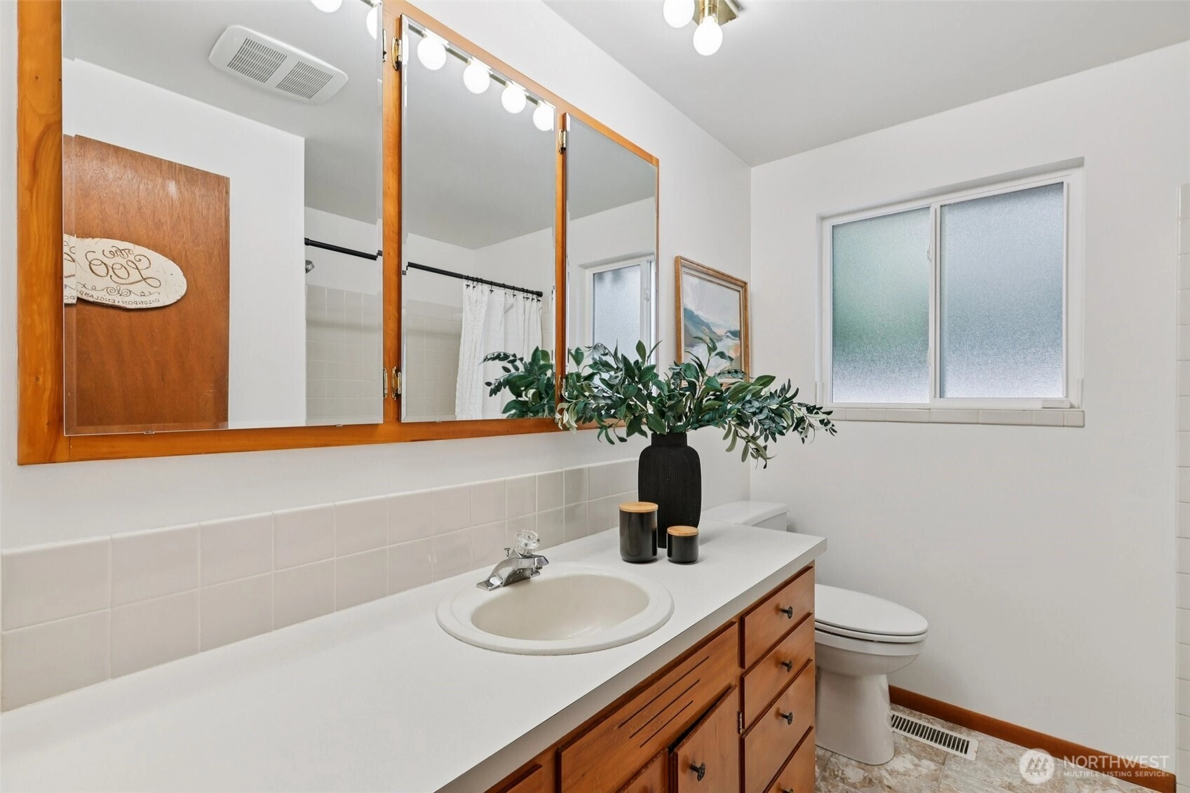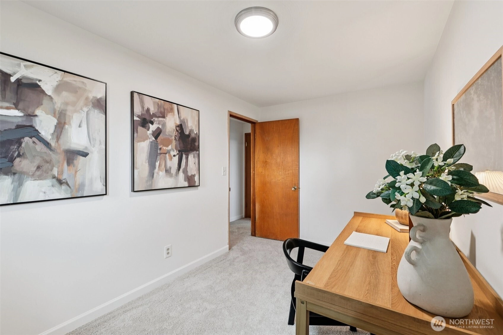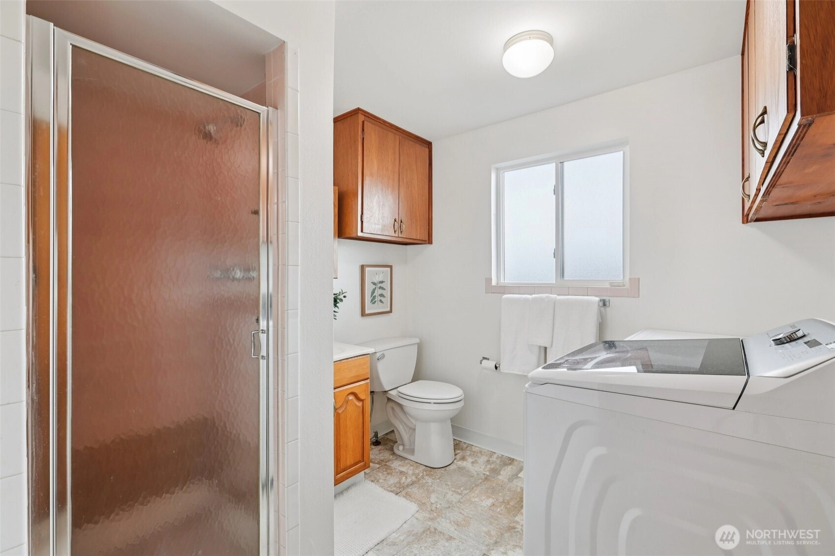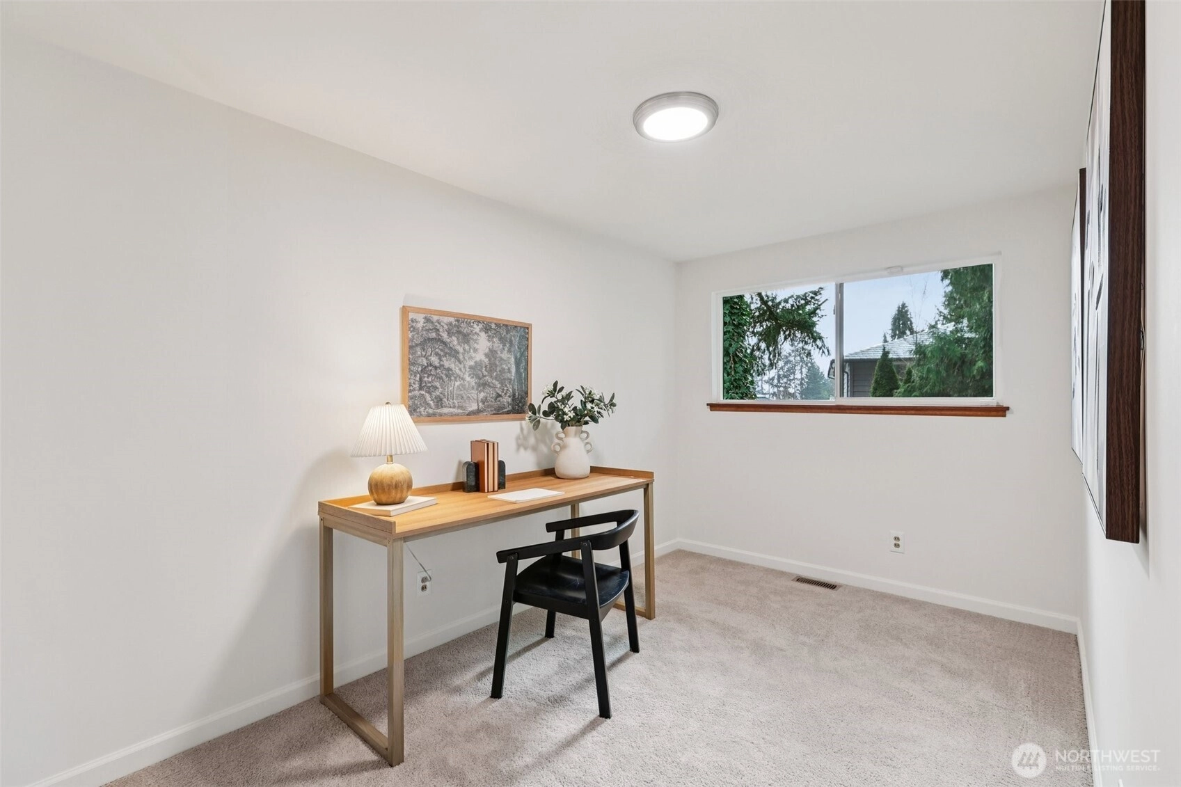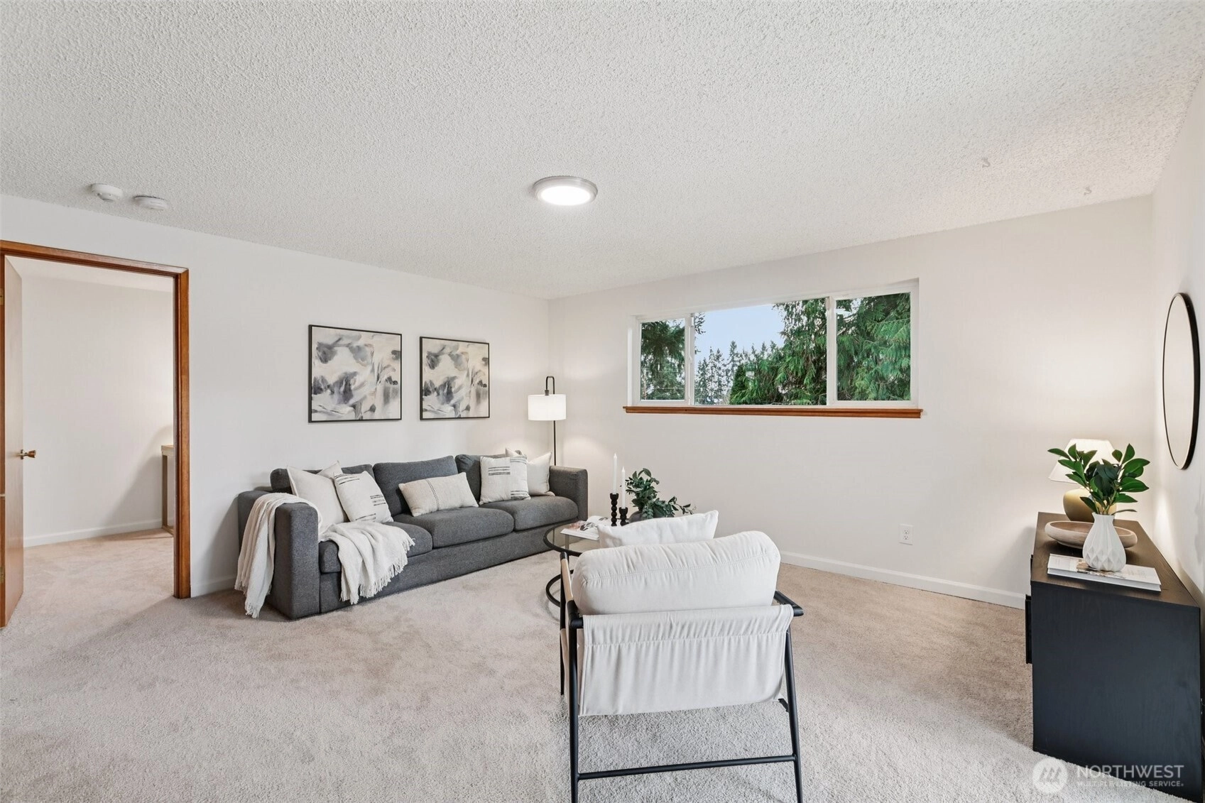 This Mid-Century home showcases the design and charm you'll adore! Inside the original hardwood floors are freshly redone enhancing the classic brick fireplace and large windows for maximum natural light. Hardwood floors continue through the living room, dining room, and main bedrooms. An attached family room offers additional gathering space or media room opening through glass doors to a private covered deck and fenced backyard, ideal for indoor-outdoor living and entertaining. Enjoy year around comfort with a wood burning fireplace and a heat pump with air conditioning. This home also offers a roomy dining area, an eat-in kitchen, and charming mid-century built-ins and details. Laundry room with 3/4 bathroom. Park in the garage or use additional paved parking spaces in the front. Enjoy easy one-level living in a beloved Edmonds location close to parks, great schools, downtown Edmonds, the waterfront, and convenient commuter access. Seller has pre-inspected. Welcome home!