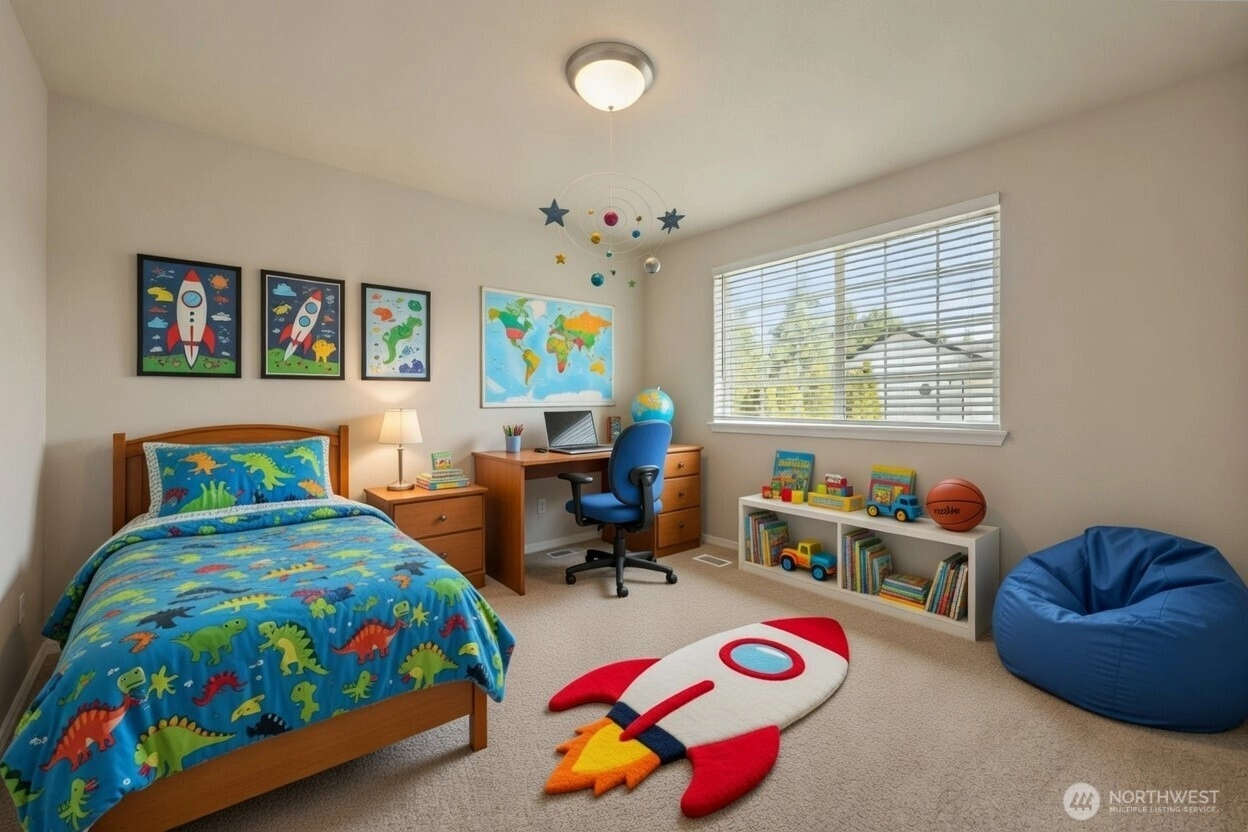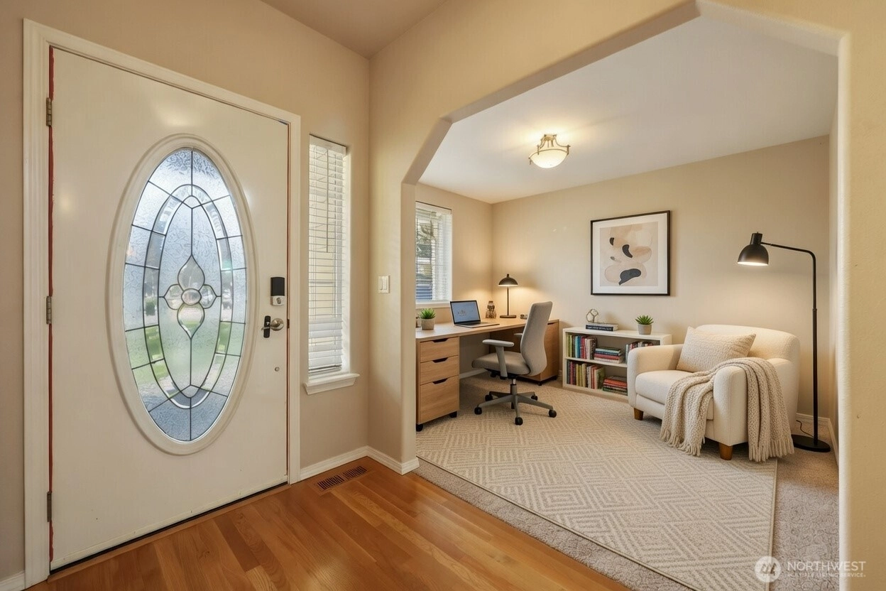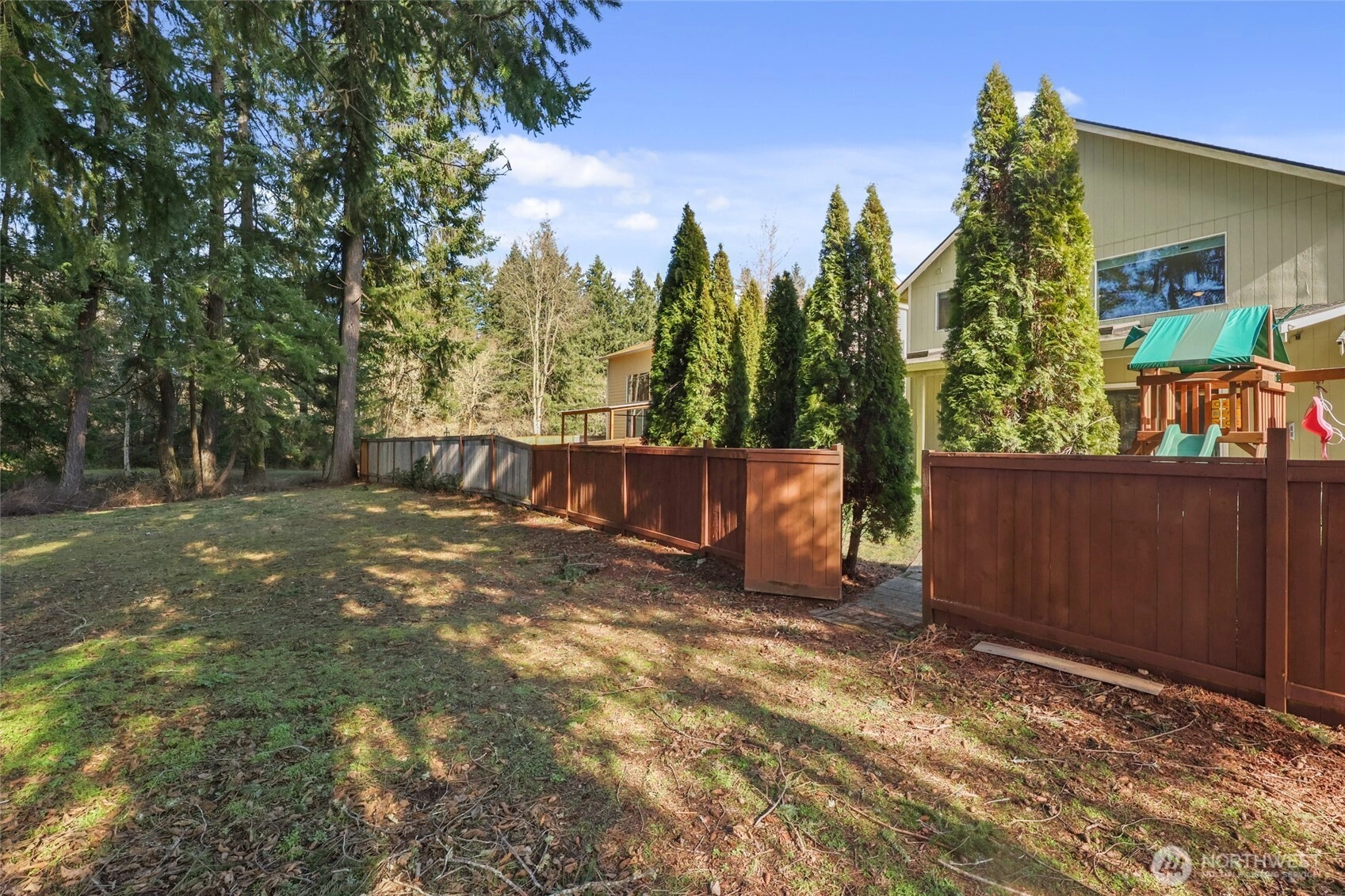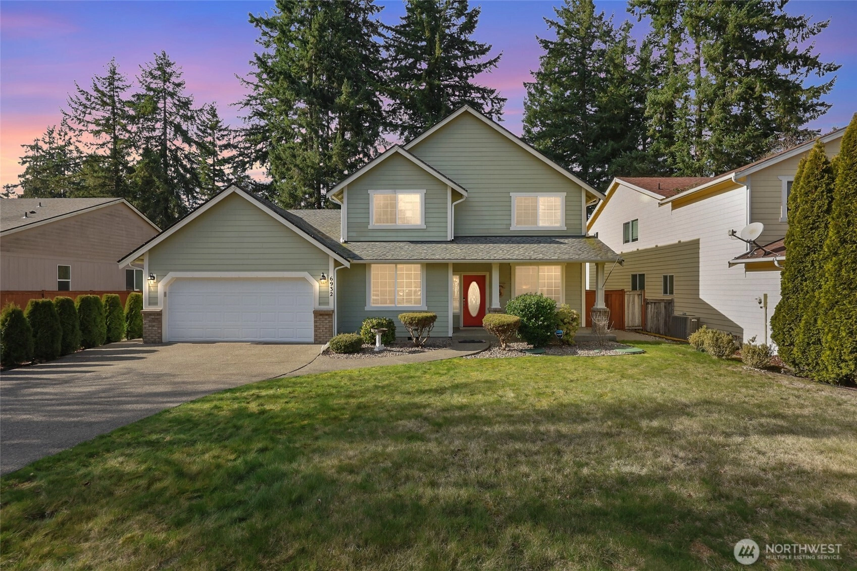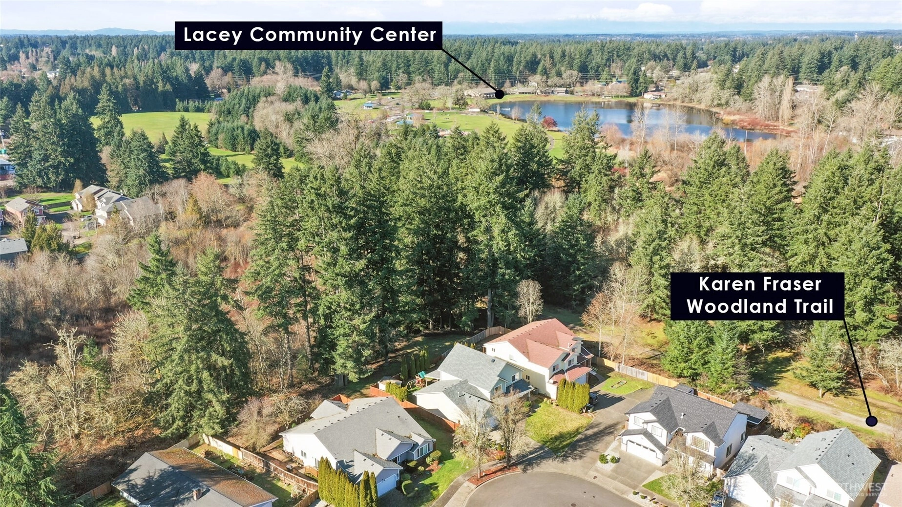 Rare hidden GEM in the heart of Lacey’s coveted Woodland Creek Estates—this stunning end-of-CUL-DE-SAC sanctuary offers refined elegance backing directly to lush HOA GREENBELT with exclusive private back-gate access to the Woodland Creek Community Park and the Karen Frazier TRAIL. A tranquil bird sanctuary! Spanning over 2,384 sq ft of immaculate living, this exquisite 4-bedroom + flex room features a grand GREAT ROOM with a soaring CATHEDRAL ceiling, dramatic walls of windows pouring in natural lights, a warm GAS FIREPLACE, rich HARDWOOD, and an elegant wooden railing overlooks the space below, adding architectural charm. TILE floors grace both bathrooms & laundry room (no vinyl) & are complemented by new carpet. FORMAL DINING showcases a sophisticated TRAY CEILING, while a chef’s kitchen impresses with custom cabinetry, gleaming GRANITE countertops, breakfast bar, STAINLESS STEEL appliances, PANTRY, and BUTLER’s PANTRY. The MAIN-FLOOR PRIMARY suite, a true spa-inspired 5-piece bath with a SOAKING TUB, new sinks, and walk-in closets with wooden shelves. A fully fenced, low-maintenance backyard of unmatched privacy, expansive covered patio with gas BBQ hookup complete with a wooden children’s PLAY STRUCTURE for endless joy. New roof (2023), A/C, 4 ceiling fans, HOA maintains the front-yard, close shopping, schools, parks, I-5 & JBLM. Pre-inspection available. An extraordinary home offers a rare opportunity to embrace serenity, sophistication, & an exceptional lifestyle.
