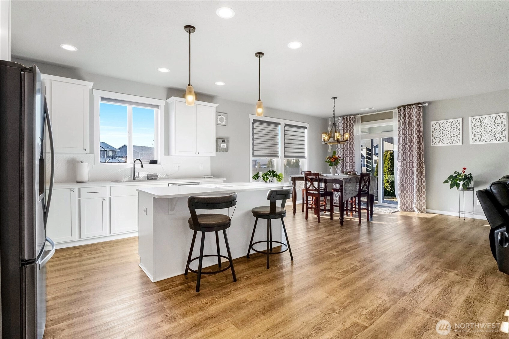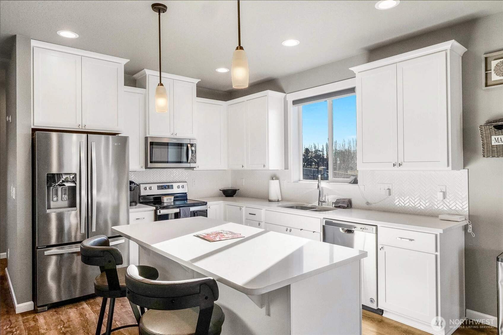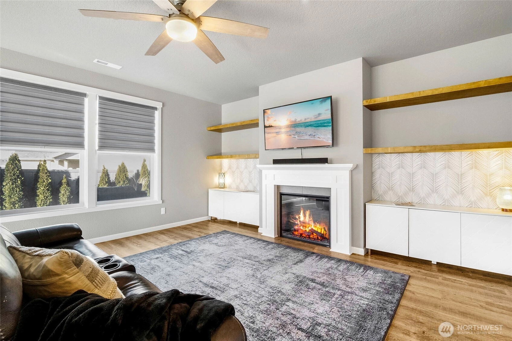 Built in 2020 and impeccably maintained, this stylish modern home sits on a desirable corner lot in a fabulous neighborhood just steps from a 5-star golf course with clubhouse and restaurant. Offering 2,372 sq ft, this 4 bedroom, 2.5 bath home features a versatile den/flex space perfect for a home office or bonus room. The bright kitchen showcases quartz countertops, on-trend white cabinetry, stainless appliances, under-cabinet lighting and is open to the living space with LVP flooring and a cozy electric fireplace. The spacious primary suite includes a luxurious 5-piece en suite bath and generous closet space. Enjoy outdoor living on the covered back patio overlooking the fully fenced yard with UGS. Custom blinds throughout, washer & dryer included. An expansive 5-car garage with epoxy floor provide both style and function for the mechanic, car restoration, artist, toys, boat, workshop or home gym. Close to Blue Heron Park for recreation and water sports with easy I-90 access—this home truly offers the perfect blend of comfort, convenience and lifestyle.