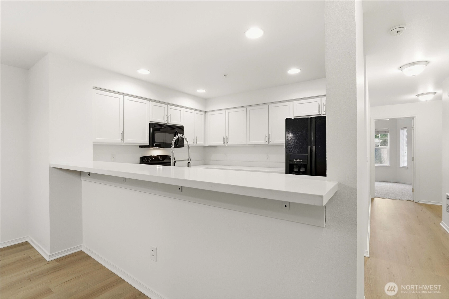 The Perfect Blend of Style & Space: Updated End Unit with 3 Parking Spots! Experience your own slice of top-floor serenity at Shoreside Condominiums! This beautifully updated end unit near Silver Lake offers the perfect blend of modern style and effortless living. Step inside to find fresh paint, new luxury vinyl plank flooring, and plush new carpet throughout. The bright kitchen shines with quartz countertops, a stainless steel sink, and sleek black appliances, while the living room invites you to cozy up by the gas fireplace or step through the sliders onto your large private deck. The primary suite feels like a true retreat with its soaring vaulted ceilings, private 3/4 bath, and spacious closet. You'll love the convenience of the main bath and the included full-size washer and dryer. This home is as practical as it is pretty, featuring 2” blinds, three dedicated parking spaces (including one tandem), and a low-maintenance building with vinyl siding and a roof replaced in 2020. With water and sewer included in the HOA dues and easy access to I-5 and Boeing, this turn-key gem is ready for its next chapter. Mortgage savings may be available for buyers of this listing.