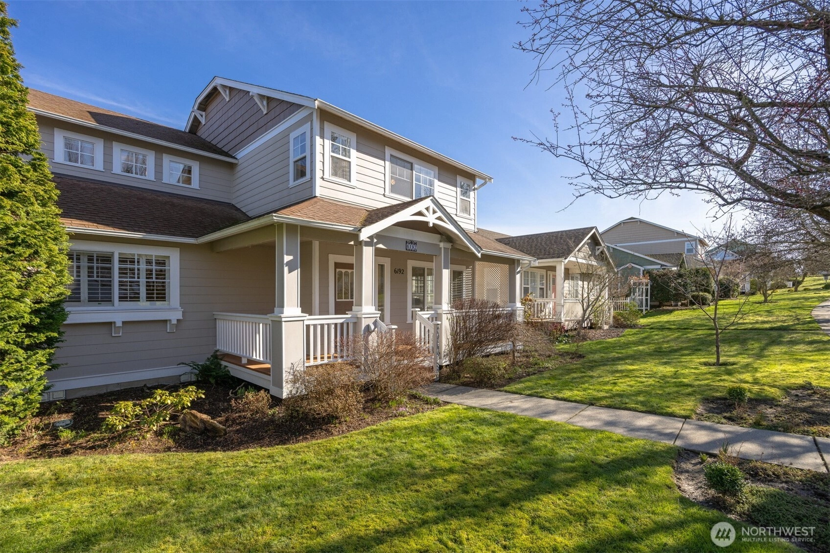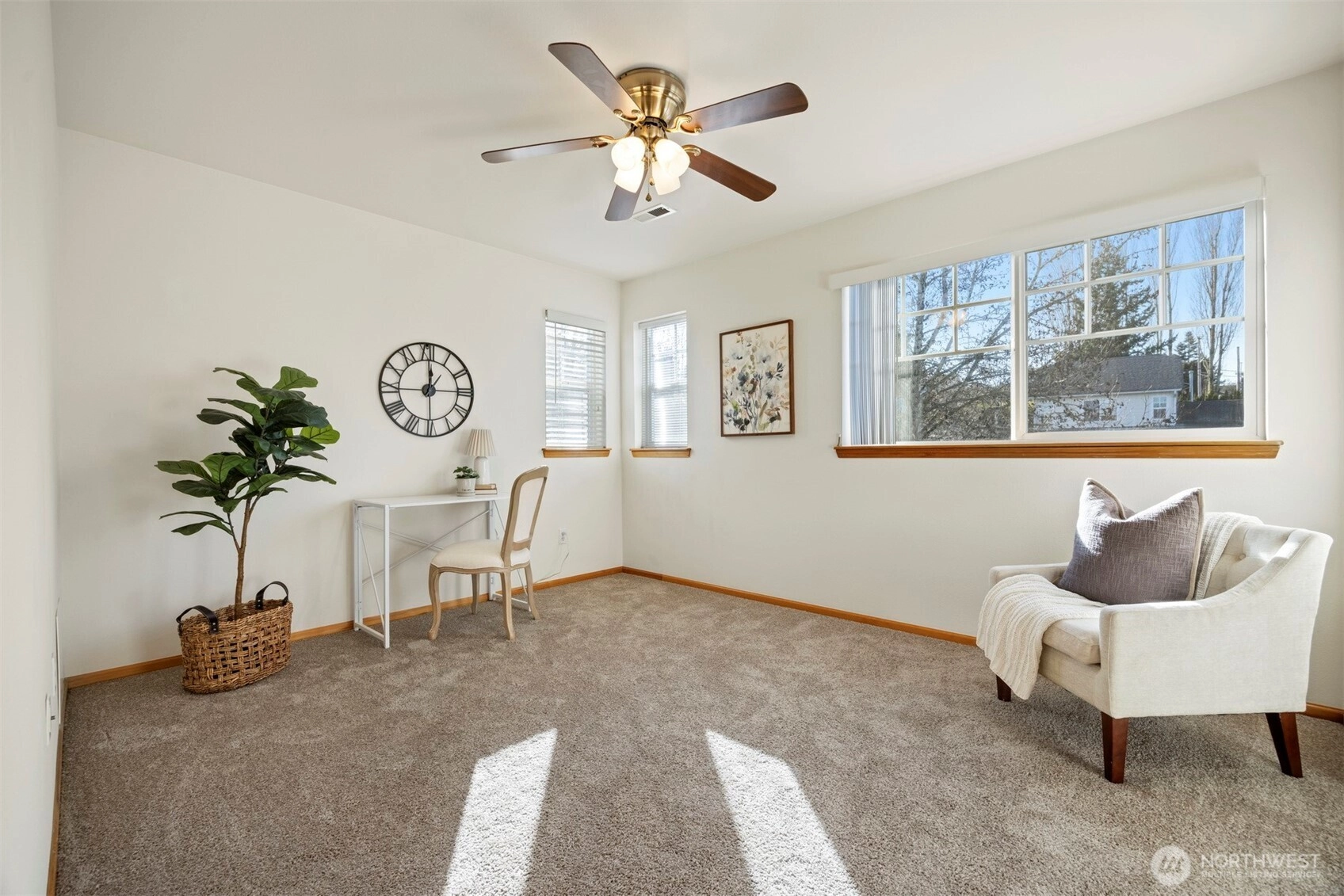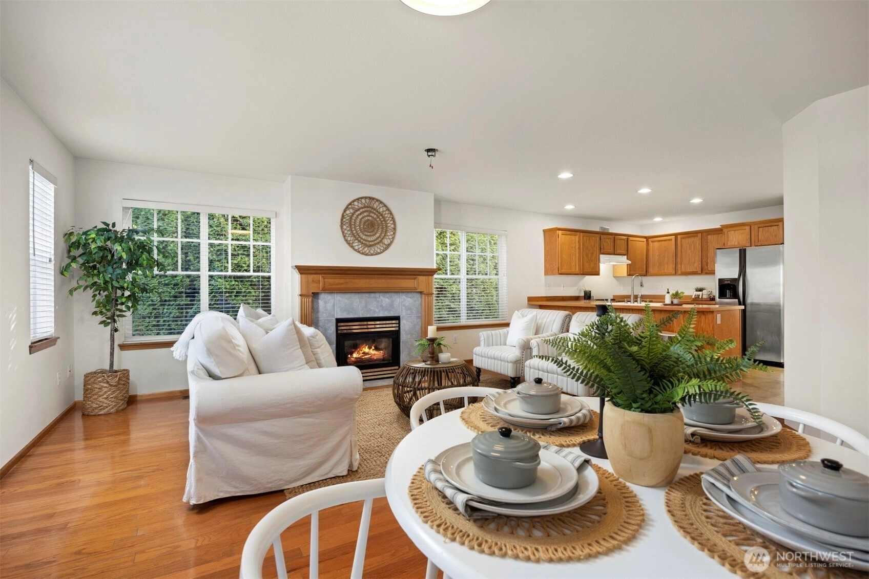 Set in a quiet neighborhood near parks, schools, and downtown Ferndale, this charming 4-bed / 2.25-bath home offers peace, comfort, and space-- all in a great location at an excellent price! Built for main-floor living, you'll be greeted by a cozy front room that leads to a kitchen with bar seating, stainless steel appliances, and connection to living + dining areas. Large living and dining room feature gas fireplace, a cute powder room, lots of natural light, and opens out to the fenced backyard with patio that's great for entertaining. Main floor also features a spacious primary bedroom with walk-in closet and 3/4 en-suite bathroom! Upstairs you'll find 3 good-sized guest beds (2 of which have walk-ins), a full bath, and huge bonus room with built-ins + a closet of its own. Home has been very well maintained, has brand new carpet throughout, and provides plenty of storage. All this plus a covered front porch and an attached 2-car garage with EV charging, alley access, and lots of shelving. Come see!