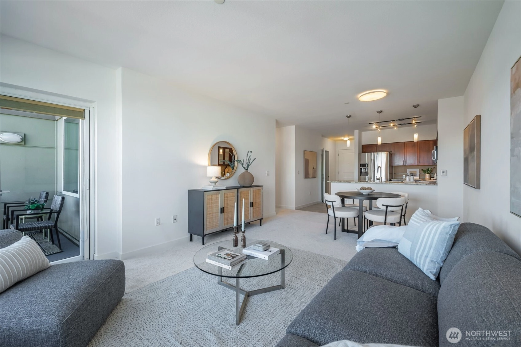 Perched atop Canal Station, this rare east-facing top-floor residence offers an elevated perspective on Ballard living. Bathed in radiant morning light, the home’s walls of windows frame sweeping urban vistas of Phinney Ridge, the iconic Ballard Bridge, and the Queen Anne skyline — with a coveted peek-a-boo glimpse of Mount Rainier on clear days. The expansive open-concept design blends kitchen, dining, and living spaces into one seamless environment ideal for both refined entertaining and relaxed daily living. A timeless kitchen anchors the space with classic finishes, abundant cabinetry, and a rare oversized walk-in pantry — a standout feature seldom found in condominium living. In-unit laundry adds everyday convenience. Step onto the private view balcony to enjoy crisp morning air and watch the city come to life below. The spacious primary suite serves as a serene retreat, complete with a walk-in closet and an elegant ensuite ¾ bath. A bright second bedroom sits adjacent to a full bathroom, offering flexibility for guests, work-from-home needs, or creative space. Three parking spaces — an exceptional offering in Ballard — and an extra-large storage unit provide unmatched convenience and value. Elevated, light-filled, and rare in both layout and amenities, this top-floor residence captures the very best of Canal Station living.