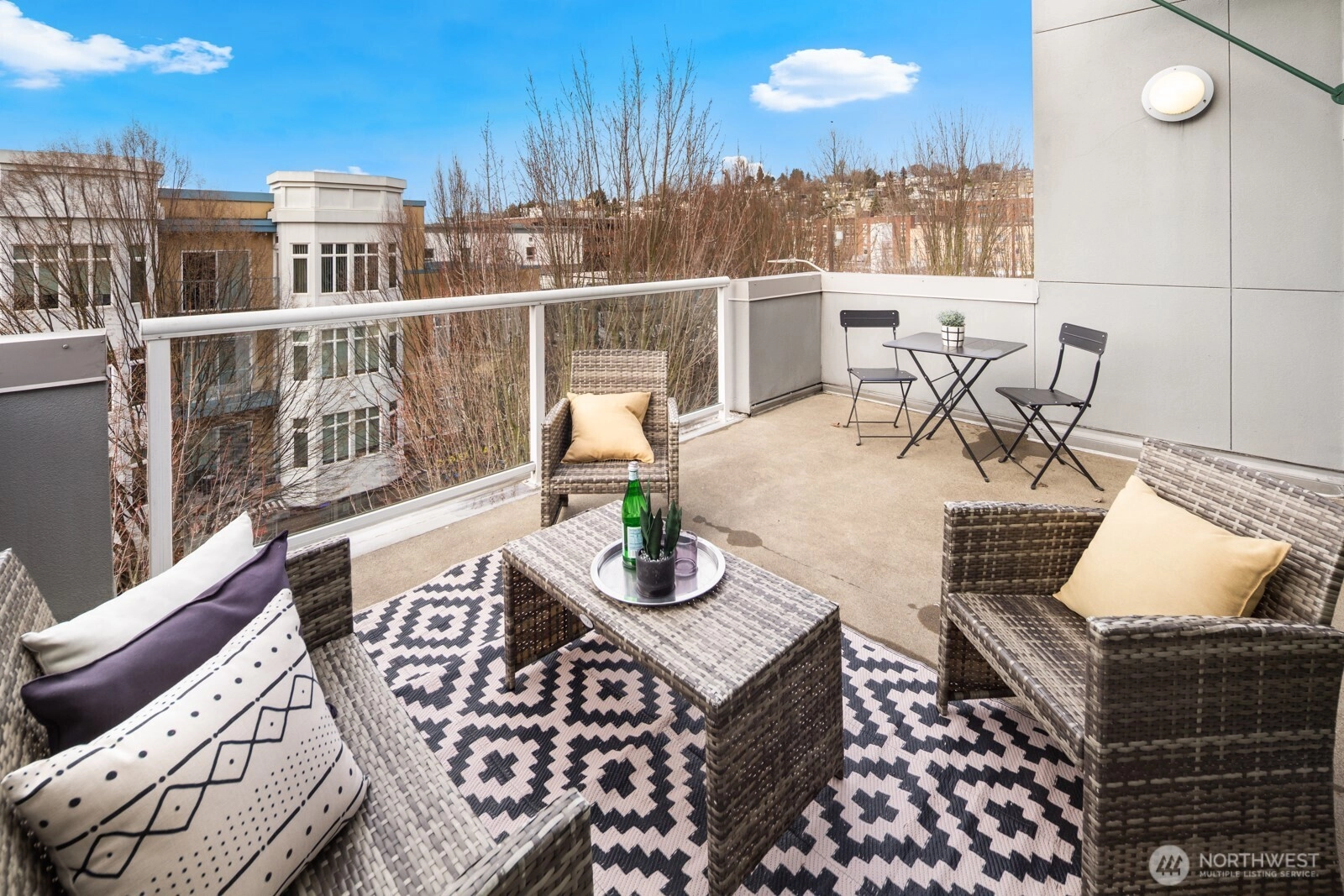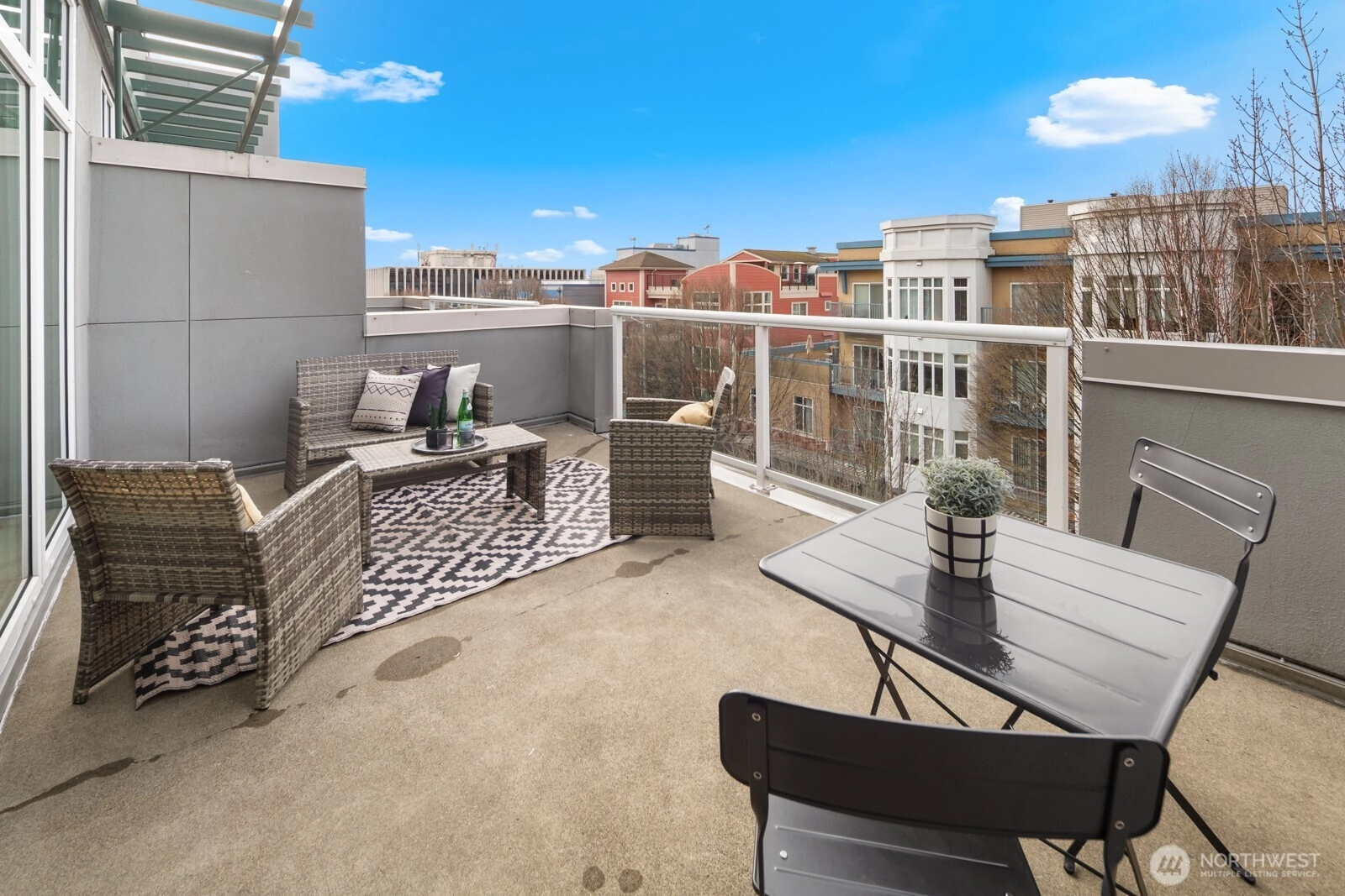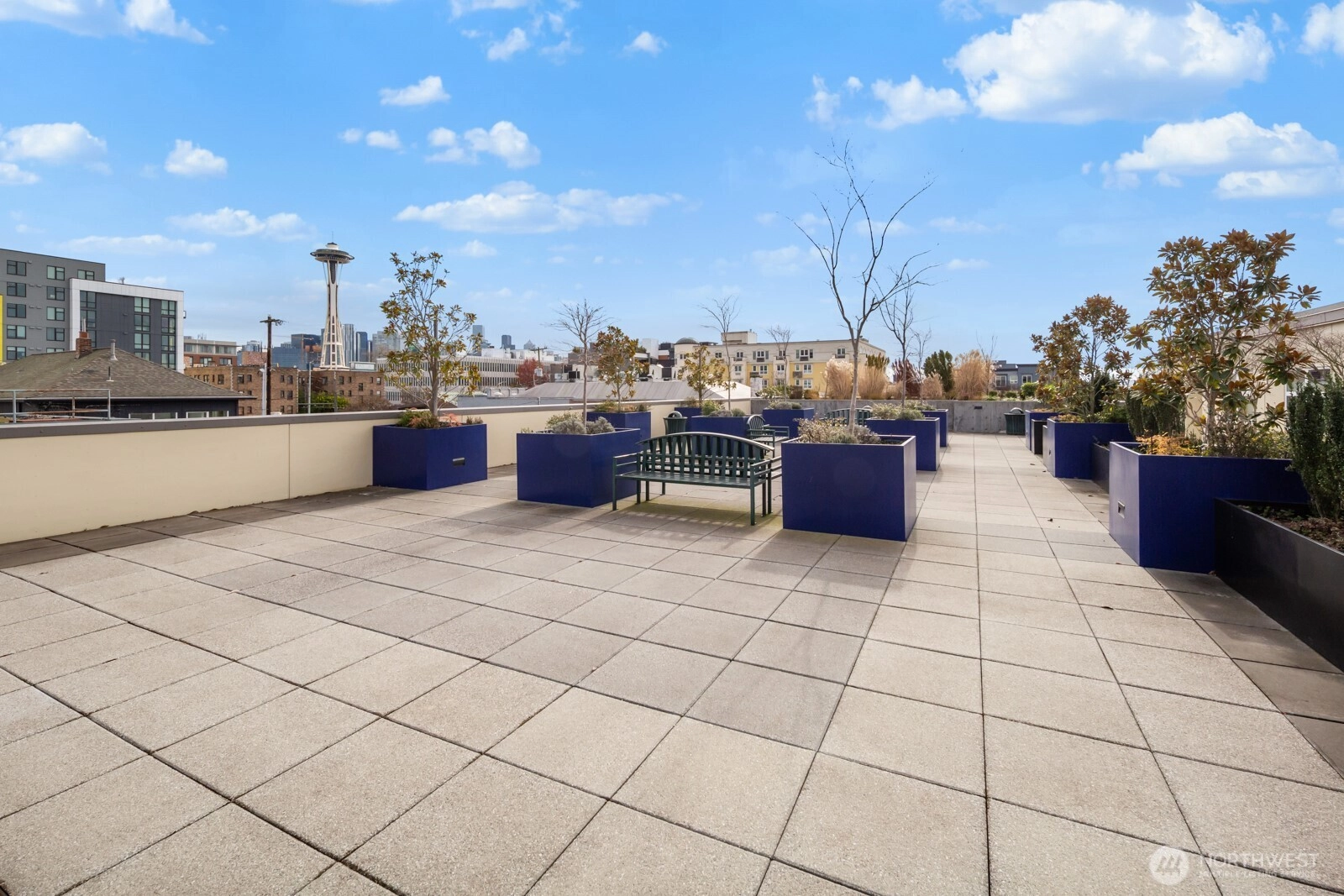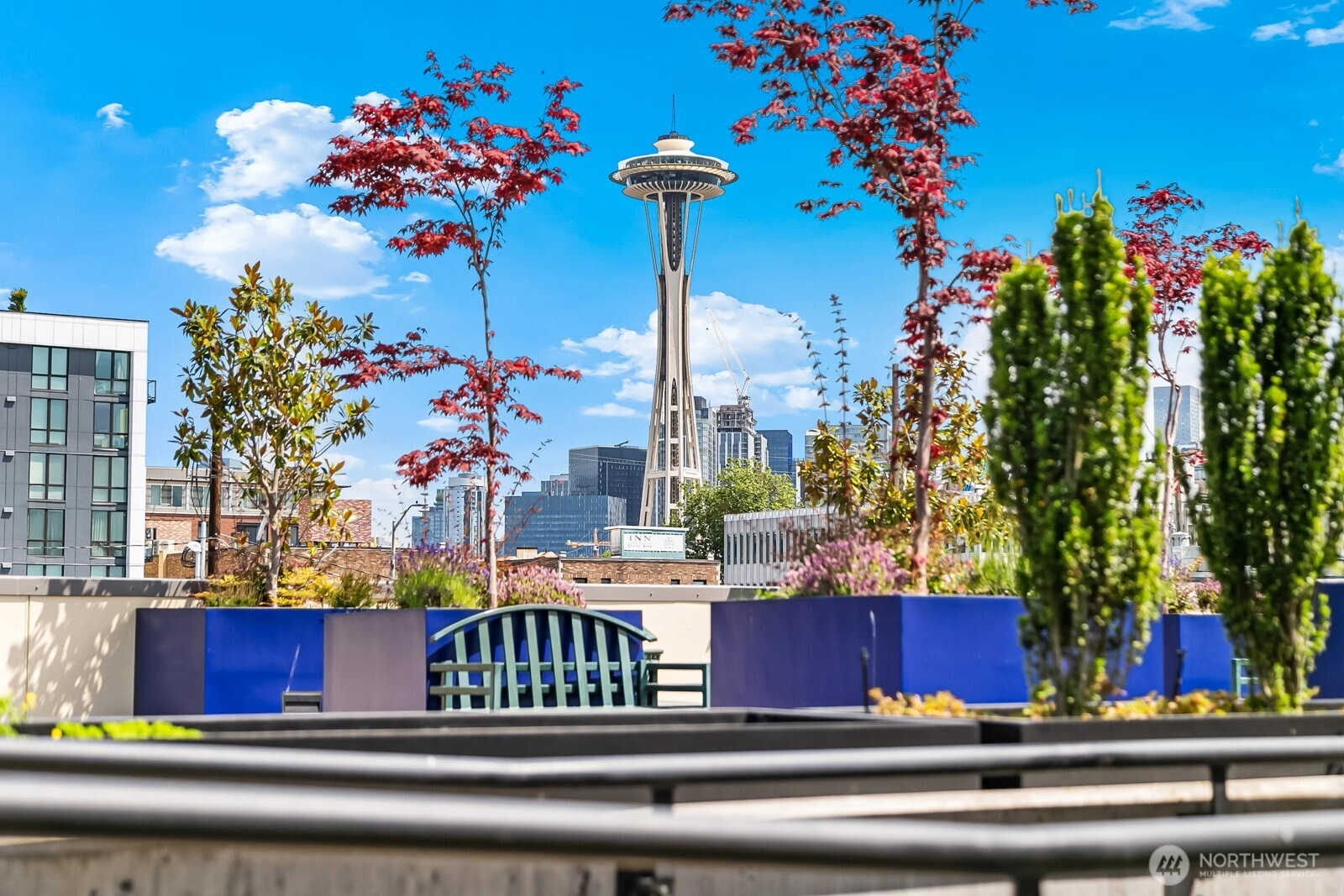 Flooded with natural light, this AMAZING top floor condo is the ultimate in-city retreat and unlike anything else you've seen. Enjoy views of Space Needle at your front door. Step inside to soaring ceilings, floor-to-ceiling glass, bamboo floors, and one of the most spacious 2/2 floor-plans around with over 1,400 sf on one level. You'll love the spacious living and dining, gas fireplace, real laundry room, island kitchen with gas cooking + endless storage. Stay cool all summer with CENTRAL AC! Retreat to a huge primary suite offering private bath + walk-in closet. The second bedroom is also large and features walk-in closet and view of Space Needle. The outdoor spaces make this condo truly special. The living room flows outdoors to a private deck with western exposure for afternoon sunshine, BBQ's, and brilliant sunsets. In addition, the unit has direct access (right outside front door) to a HUGE common rooftop deck with city views that feels like your own back yard. Very cool! Tribeca is a sought-after building with strong reserves, NO RENTAL CAP, and perfect location in the heart of vibrant Queen Anne close to incredible restaurants, cafes, shopping, events, public transportation, and more. Stroll to Kraken games and concerts at Climate Pledge. Easy access to the Seattle waterfront, downtown, and SLU. Oh, the condo includes 2 parking spots (next to each other) in secure garage. Opportunity knocks!