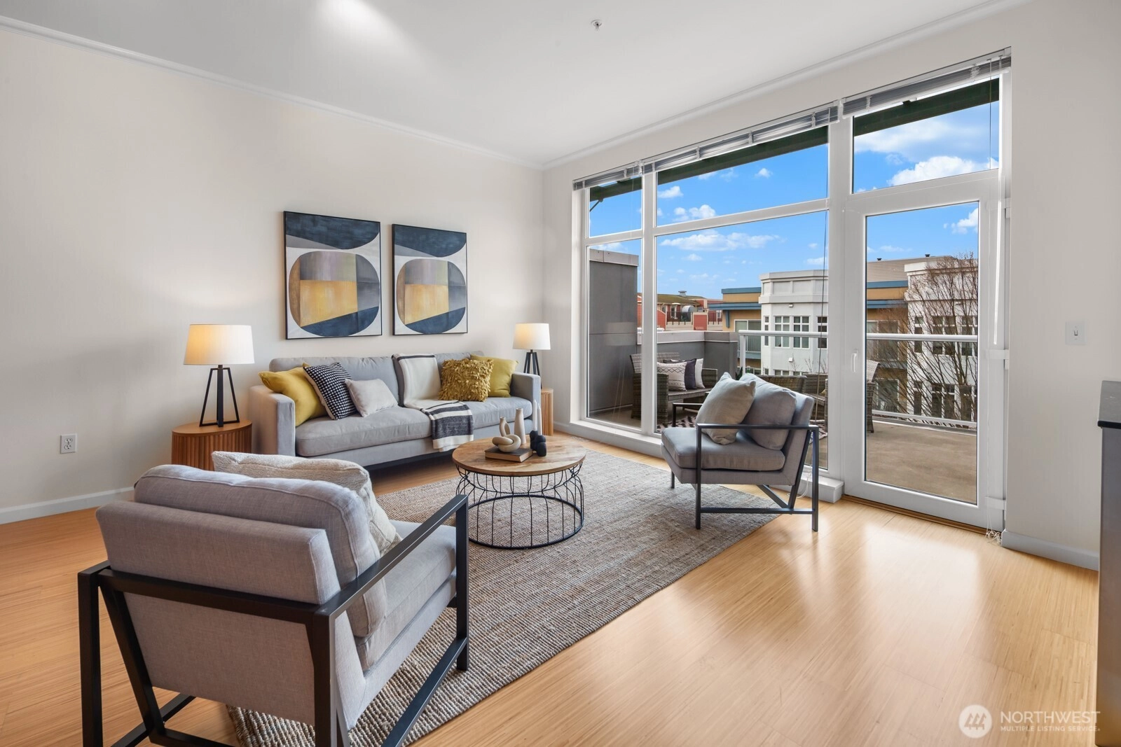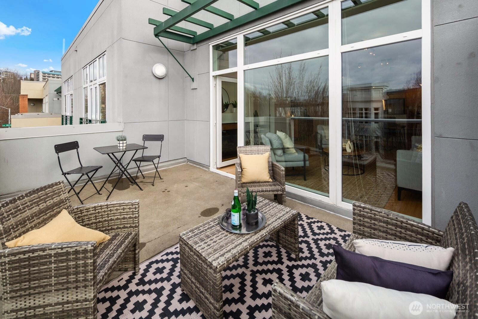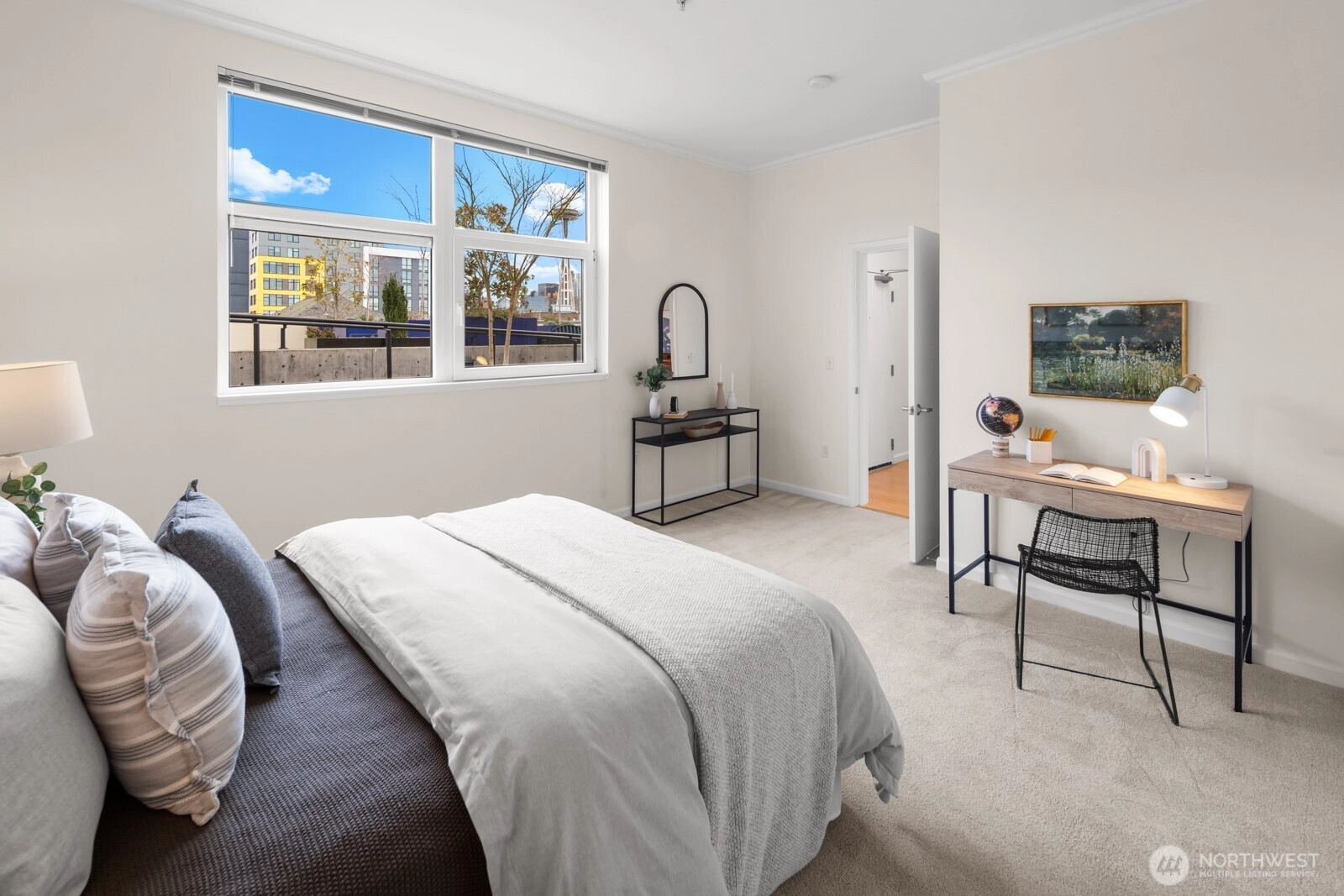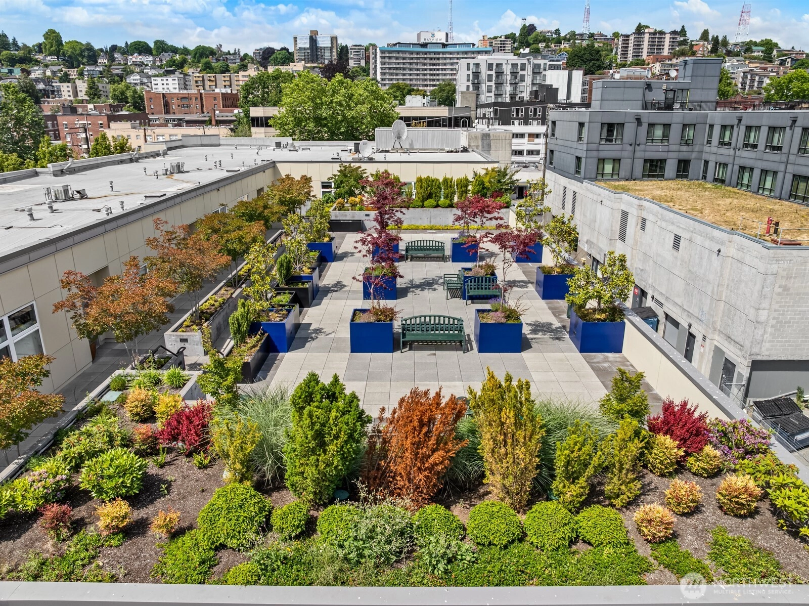 Flooded with natural light, this AMAZING top floor condo is the ultimate in-city retreat and unlike anything else you've seen. Enjoy views of Space Needle at your front door. Step inside to soaring ceilings, floor-to-ceiling glass, bamboo floors, and one of the most spacious 2/2 floor-plans around with over 1,400 sf on one level. You'll love the spacious living and dining, gas fireplace, real laundry room, island kitchen with gas cooking + endless storage. Stay cool all summer with CENTRAL AC! Retreat to a huge primary suite offering private bath + walk-in closet. The second bedroom is also large and features walk-in closet and view of Space Needle. The outdoor spaces make this condo truly special. The living room flows outdoors to a private deck with western exposure for afternoon sunshine, BBQ's, and brilliant sunsets. In addition, the unit has direct access (right outside front door) to a HUGE common rooftop deck with city views that feels like your own back yard. Very cool! Tribeca is a sought-after building with strong reserves, NO RENTAL CAP, and perfect location in the heart of vibrant Queen Anne close to incredible restaurants, cafes, shopping, events, public transportation, and more. Stroll to Kraken games and concerts at Climate Pledge. Easy access to the Seattle waterfront, downtown, and SLU. Oh, the condo includes 2 parking spots (next to each other) in secure garage. Opportunity knocks!