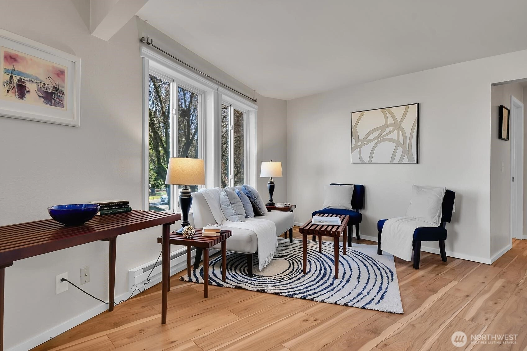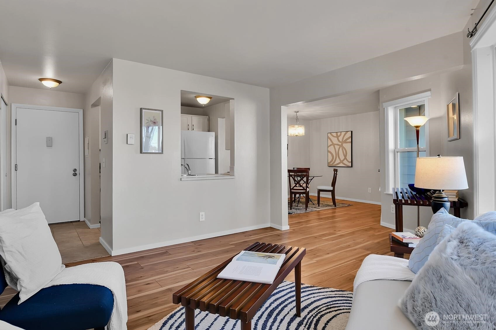 Great 1 bedroom condo close to transportation, shopping, parks, Seattle Pacific University, bike trails, waterfront, plus more! New laminate wood floors throughout. Nice floor plan. Updated bath. New stove, newer refrigerator. New large capacity hot water heater. Walk-in closet. In unit washer/dryer. 2 spacious decks! Off street parking. Low HOA Dues. Territorial view to Queen Anne hill. Pets are Ok!