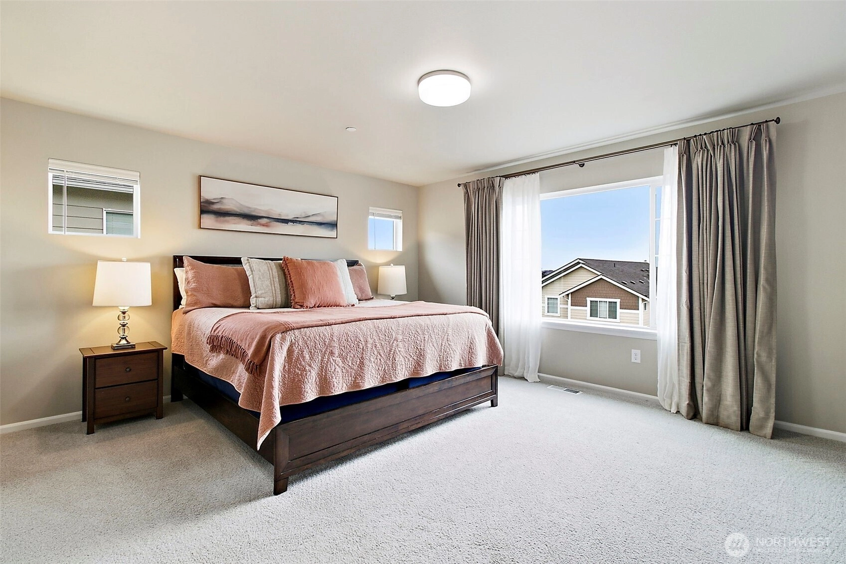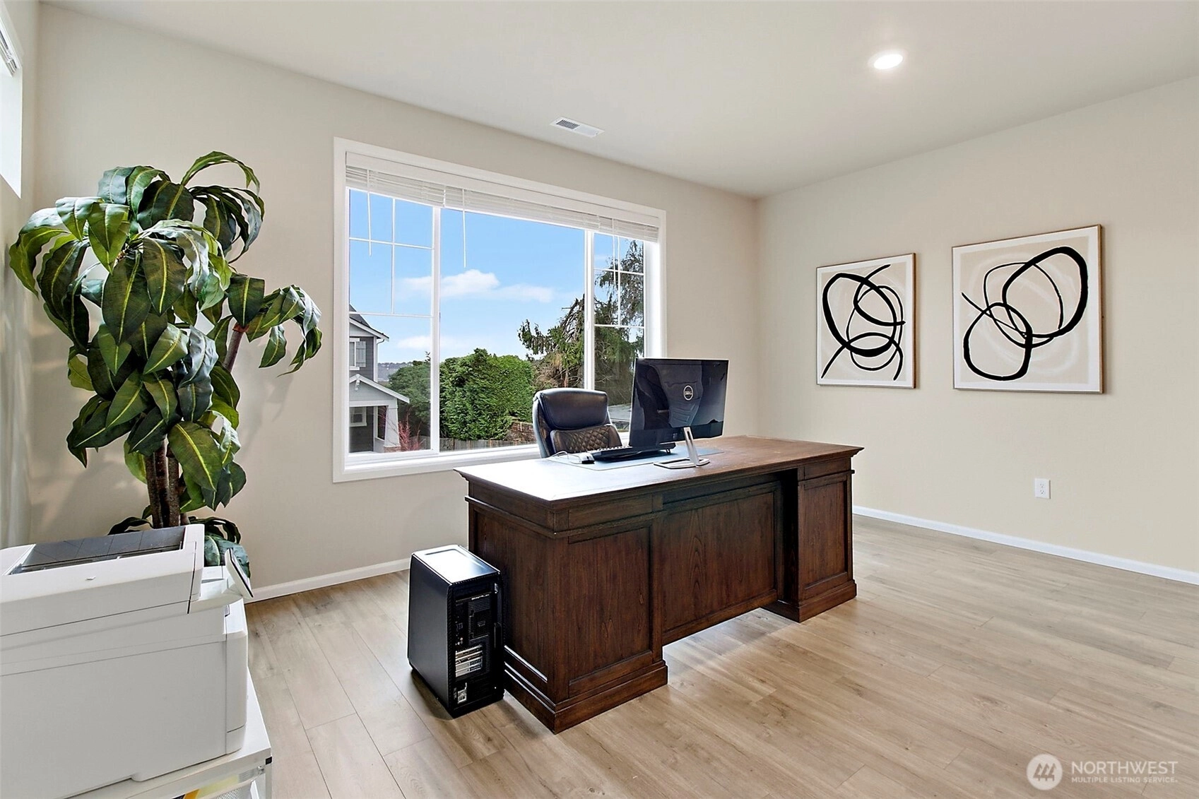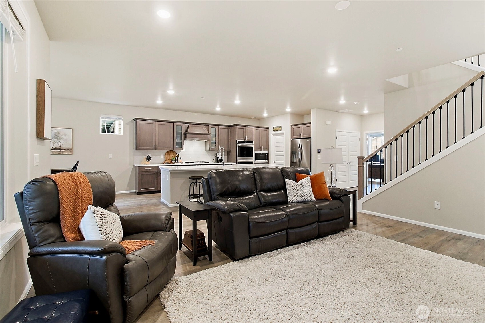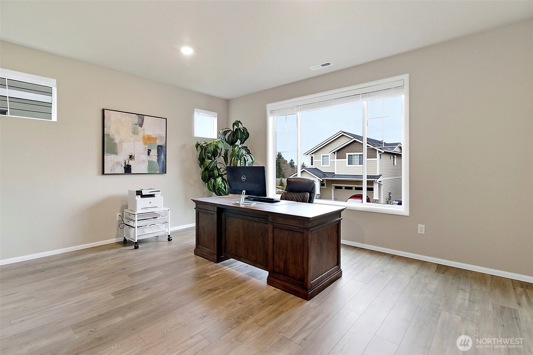 Experience elevated luxury living in this better-than-new 4-bedroom, 2.5-bath Lennar home in the highly desirable Oberon community. This stunning three-story residence offers refined design, thoughtful functionality & exceptional craftsmanship throughout. The open great-room floor plan features elegant sight lines & abundant natural light, creating a seamless flow ideal for both entertaining & everyday living. At the heart of the home is the chef-inspired kitchen, showcasing gleaming quartz countertops, an oversized island, double ovens, walk-in pantry, & all appliances included. Designer details abound with white millwork, 5-panel doors & sophisticated finishes at every turn. A private main-floor office provides the perfect work-from-home retreat. The great room off the kitchen boasts a cozy gas fireplace. The dining area opens to entertainment-sized covered patio with electric SunSaver screen, extending your living space year-round, plus a fully fenced yard for added privacy. Upstairs, unwind in the luxurious primary suite, complemented by three additional spacious bedrooms & generous bonus loft—ideal for media, play, or relaxation. Large two-car garage with additional driveway parking adds convenience. Located in newer community with large neighborhood park & excellent commuter access to freeways, SeaTac Airport, major retail, & business hubs, this exceptional home offers the perfect blend of luxury, comfort, & location. ***Check out AWESOME VIDEO in virtual tour link.
