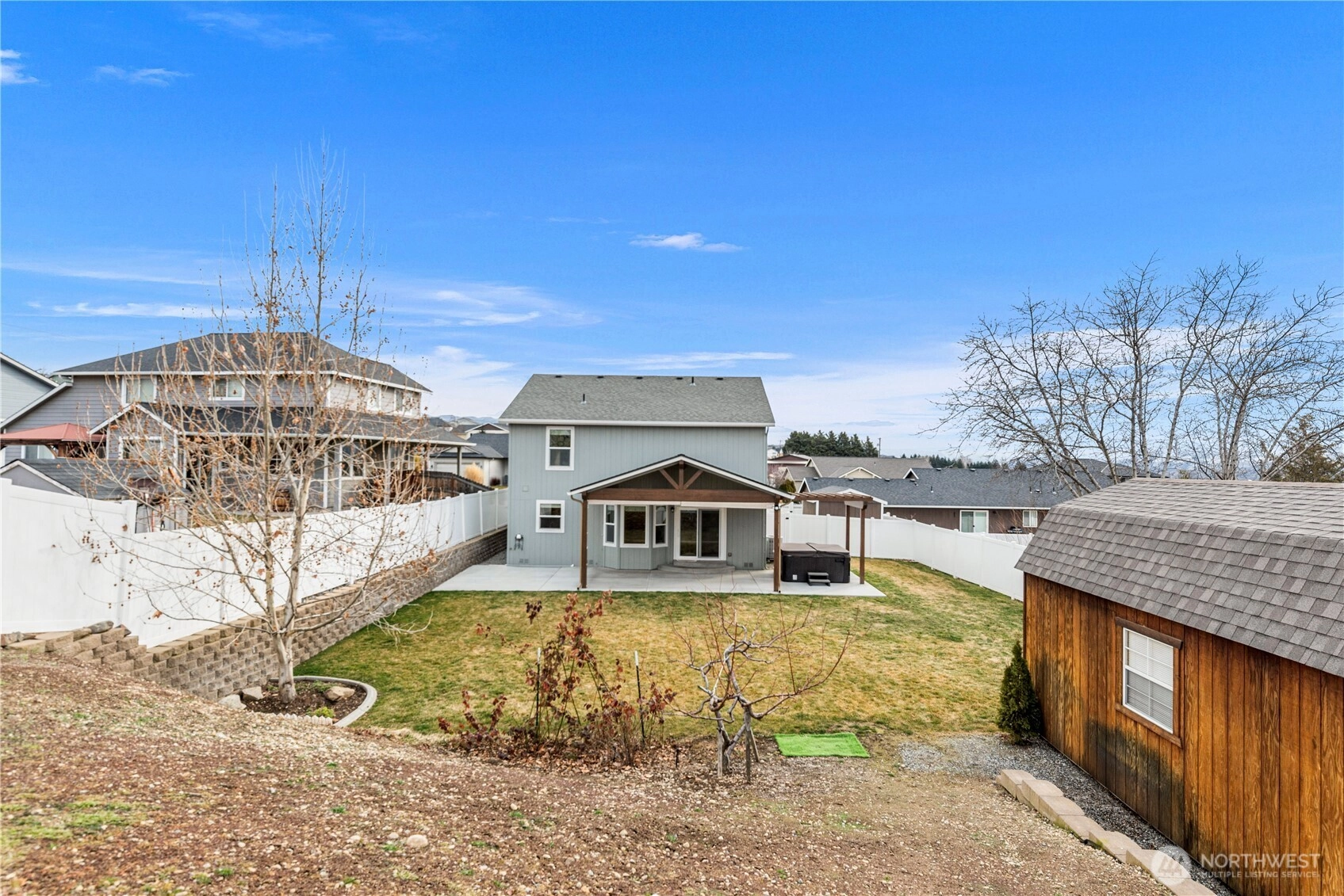 Tucked at the end of a quiet, private cul-de-sac in East Wenatchee, this two-story home offers the space and setting you’ve been waiting for. Inside, every room feels generously sized, creating a comfortable atmosphere throughout. The main level features durable and stylish LVP flooring, a large living room that flows seamlessly into the dining nook, and an open-concept kitchen. With granite countertops, tile backsplash, and abundant cabinetry, the kitchen blends style and function—perfect for everyday living or entertaining. Upstairs, you’ll find three spacious bedrooms, including an impressive primary suite designed to be your personal retreat. Wake up to beautiful mountain views, enjoy a large walk-in closet, and unwind in the en-suite bath featuring dual vanities and a soaking tub. A full guest bathroom is conveniently located upstairs, while a powder room on the main floor adds practicality for guests. Step outside to a backyard that truly delivers the wow factor. The cathedral-style covered patio with sun shades creates an inviting outdoor living space ideal for relaxing or hosting gatherings. The yard is fully fenced and includes irrigation water, plus a peach tree known for producing incredibly sweet, delicious fruit each season. A powered outbuilding offers space for a small shop or hobbies, and power is already available for a future hot tub. A two-car attached garage completes this East Wenatchee gem.