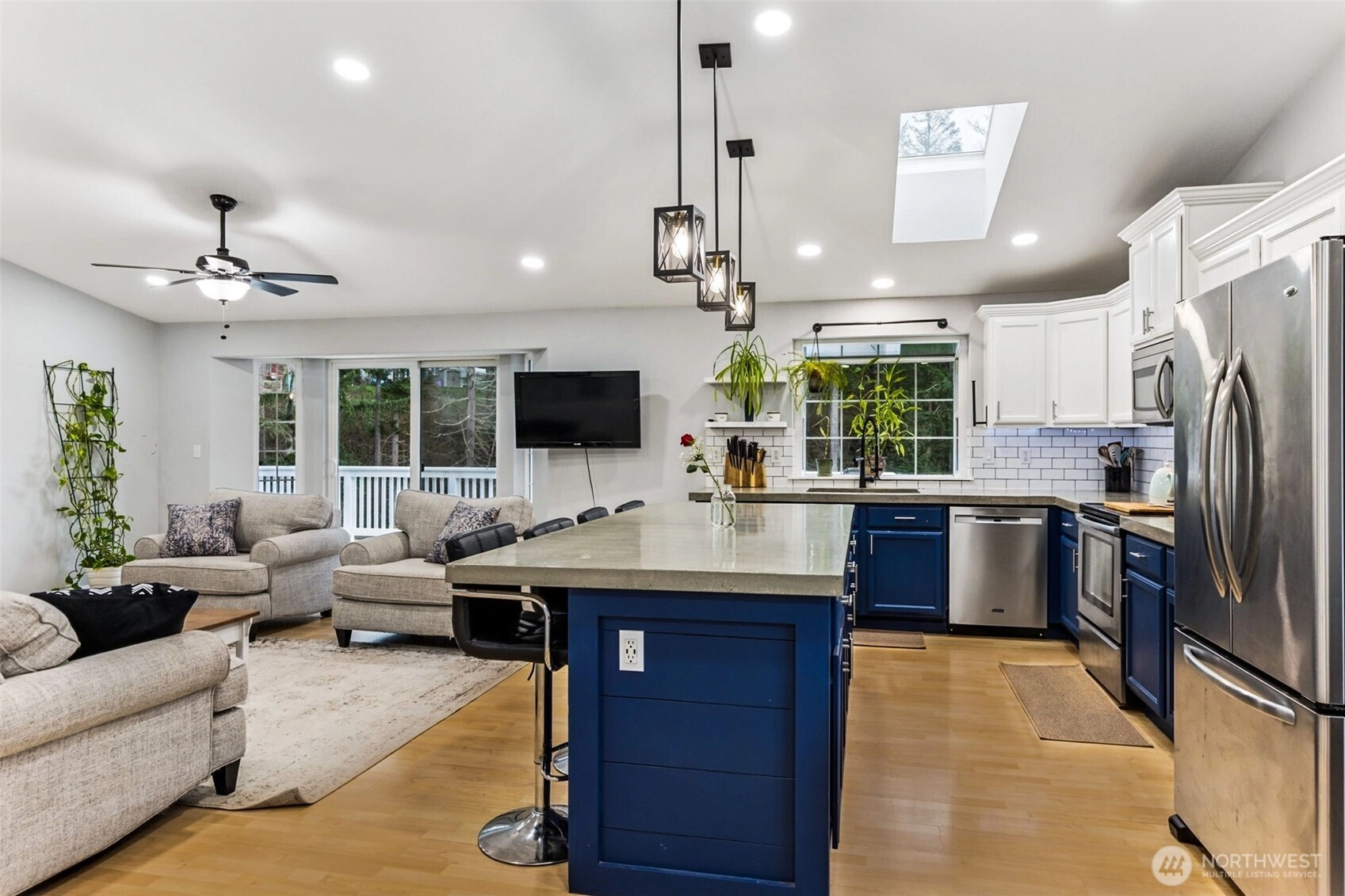Beautifully updated 4-bedroom home on a private, oversized lot surrounded by mature evergreens. This light-filled residence features an open-concept main living area with vaulted ceilings, recessed lighting, and seamless flow between the living room, dining area, and stunning kitchen. The kitchen is a true centerpiece, offering a large statement island with seating, rich blue cabinetry, white uppers, stainless steel appliances, subway tile backsplash, skylight, and abundant counter space — perfect for entertaining and everyday living. Sliding doors open to an expansive deck overlooking the peaceful backyard, creating ideal indoor-outdoor living. The upper level includes multiple bedrooms, including a spacious primary suite with deck access and nearby bath. Downstairs, the fully finished lower level provides a generous bonus/family room with cozy wood stove, built-ins, and additional flexible space for media, hobbies, or guests, as well as, a spacious secondary primary bedroom and bathroom including a luxurious soaking tub. A dedicated laundry room with stylish finishes adds convenience. Outside, enjoy a large yard with room to garden, play, or relax in a serene natural setting. Attached garage and ample driveway parking complete the package. Walking distance to the park/playground. A perfect blend of modern updates, functional layout, and privacy — this home offers comfort, space, and versatility in a beautiful setting.