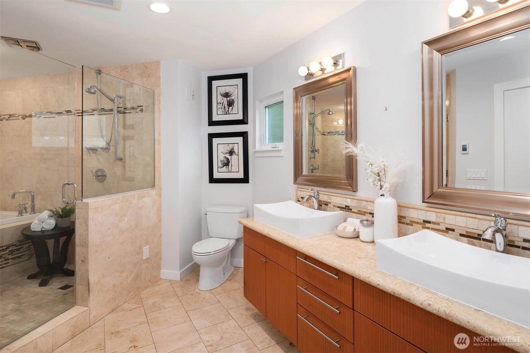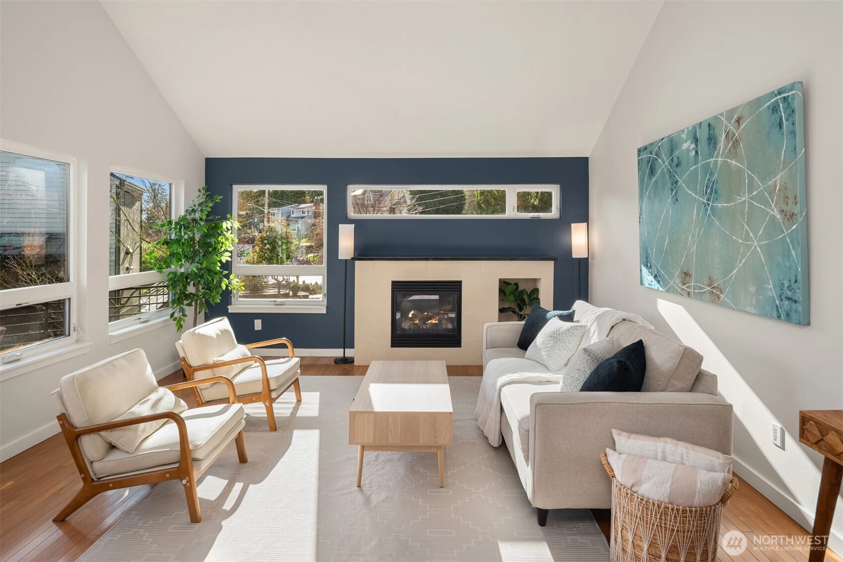 Welcome home to this beautifully appointed 4 bedroom, 2.5 bathroom residence offering elevated city living in Northeast Seattle. Vaulted ceilings and expansive windows create an airy feel, while the open concept main level flows seamlessly between the living, dining, and kitchen spaces, ideal for both everyday living and entertaining.The stylish kitchen features granite and concrete counters, stainless steel appliances, a wet bar, and a walk in pantry with utility space. Just off the kitchen, a spacious deck invites effortless indoor outdoor gatherings. Upstairs, the primary suite feels like a private retreat with a soaking tub, rain shower, and walk in closet. The lower level features three additional bedrooms, providing flexibility for guests to have a home office, or art room, along with a cozy bonus room that opens to a large patio, private yard, and salt water hot tub. The rooftop deck truly sets this home apart, complete with its own mini wet bar and gas BBQ hookup, perfect for sunset evenings and territorial views. Fresh paint and new carpet make this home move in ready. Located just minutes to Magnuson Park and University Village, with easy access to dining, shopping, recreation, and commuter routes, this is comfort and convenience at its finest.