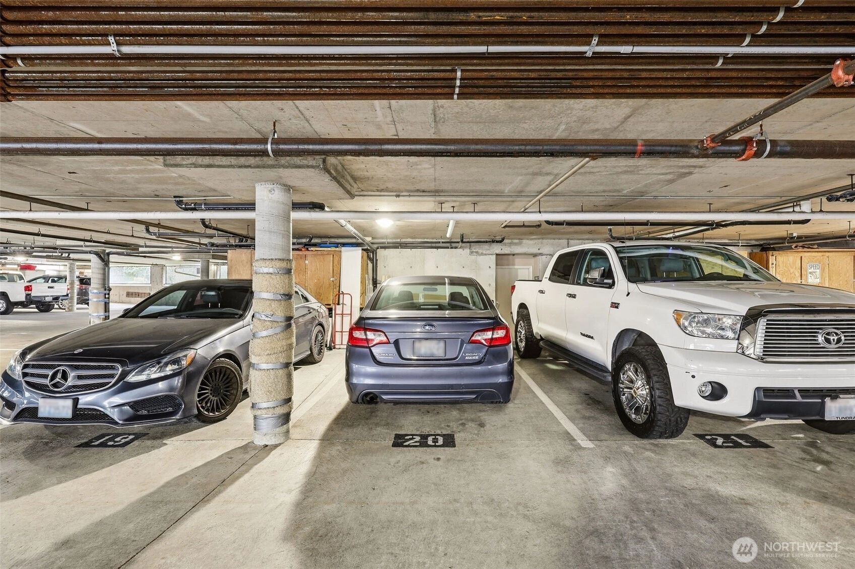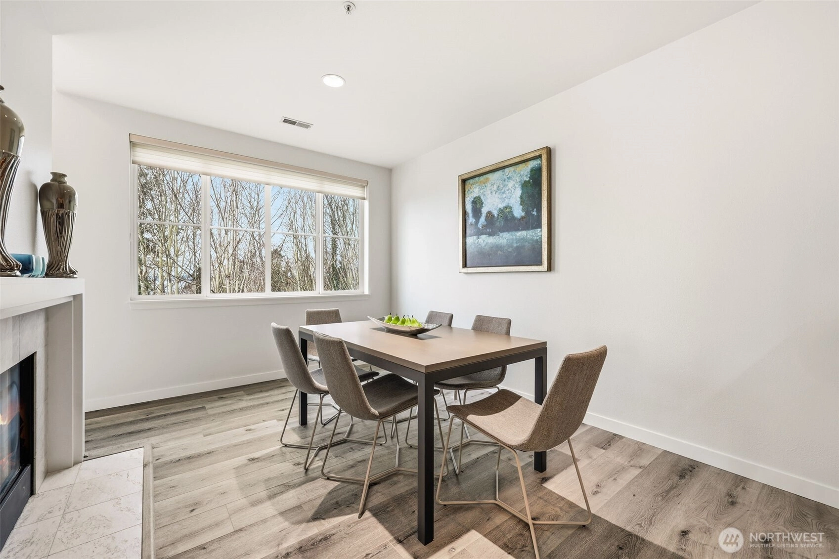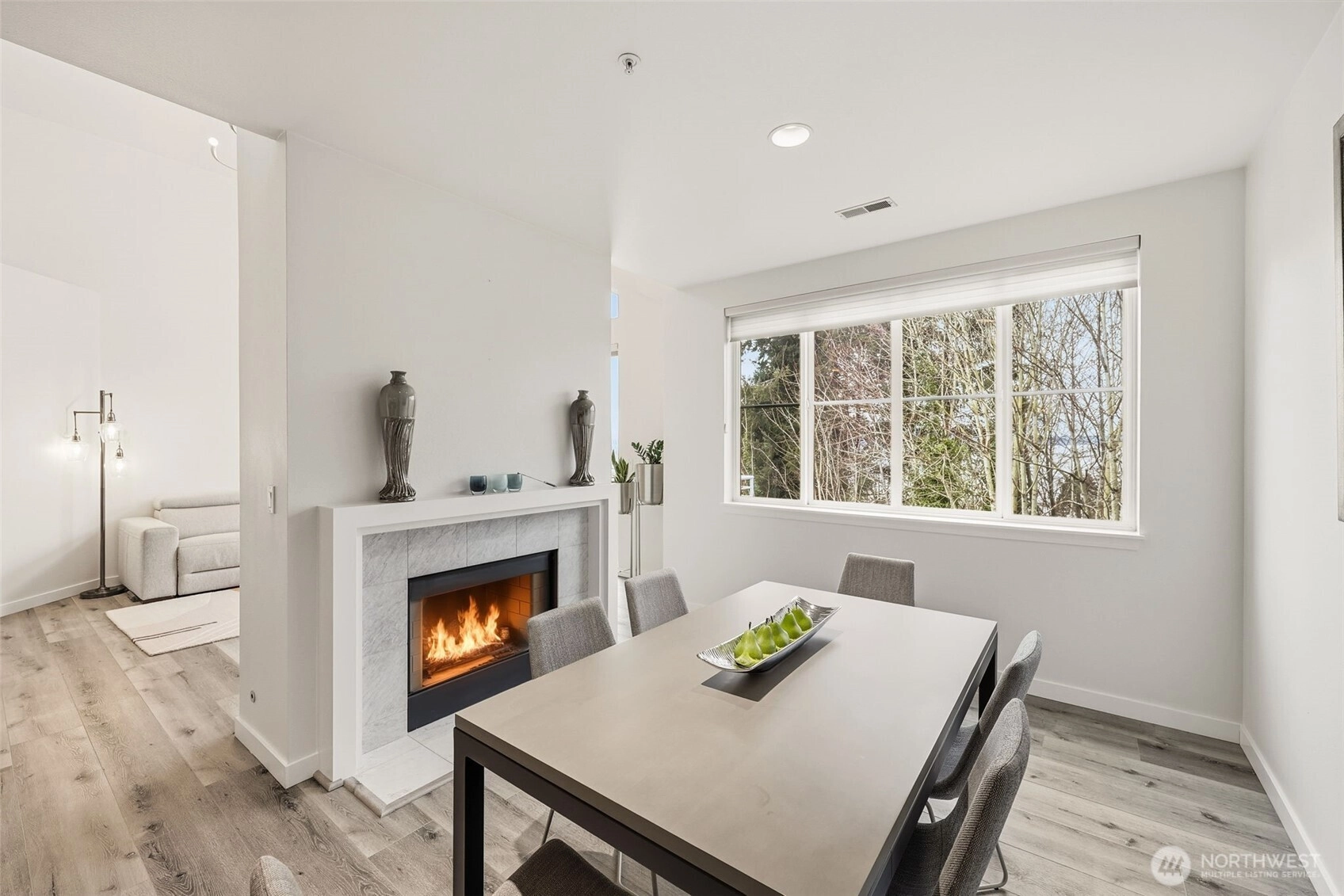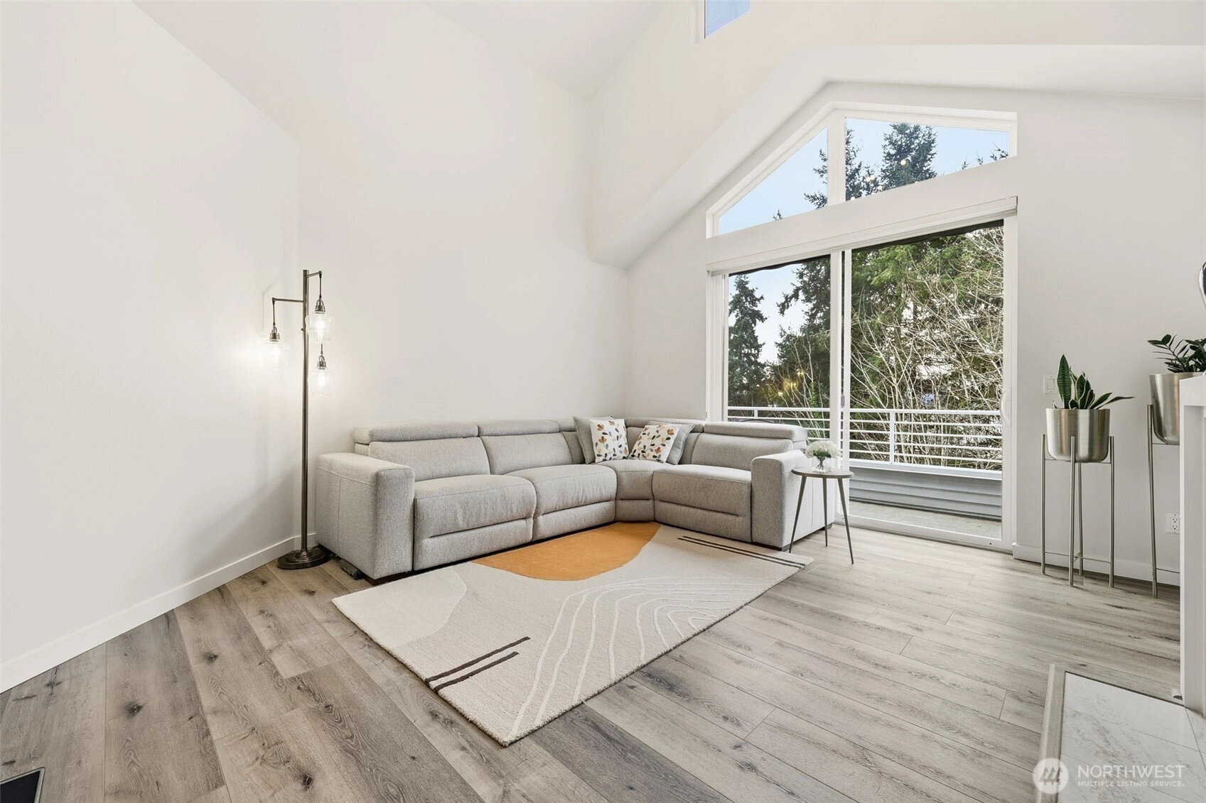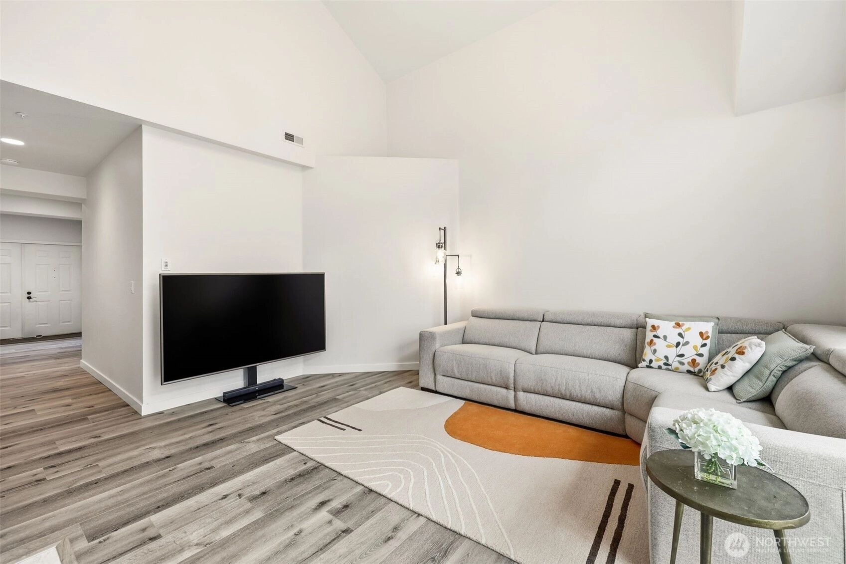 Experience the rare intersection of panoramic serenity and modern sophistication in this premier top-floor corner unit. Positioned to capture partial Puget Sound views and lush canopy vistas, this residence offers a level of privacy and light seldom found in urban living. Every detail has been curated to provide a move-in-ready sanctuary optimized for a refined lifestyle. The open-concept living area features dramatic vaulted ceilings that create an airy, expansive atmosphere. A brand-new modern chandelier serves as the focal point, casting a glow over the sophisticated interior. Two new glass doors lead to your private balcony, bridging the gap between the living room and coastal air. High-end updates include new HOA-approved Luxury Vinyl Plank (LVP) flooring throughout, ensuring a quiet-zone environment. This high-performance home includes 2 dedicated secured parking spaces, elevator access, and a gas fireplace. Managed with excellence, the building features secured entry and a prime location within the Windward community. This is a strategic asset for those who value privacy, serenity, and coastal convenience. Situated in the heart of Des Moines desirable waterfront corridor, you are minutes from the regions best lifestyle assets.