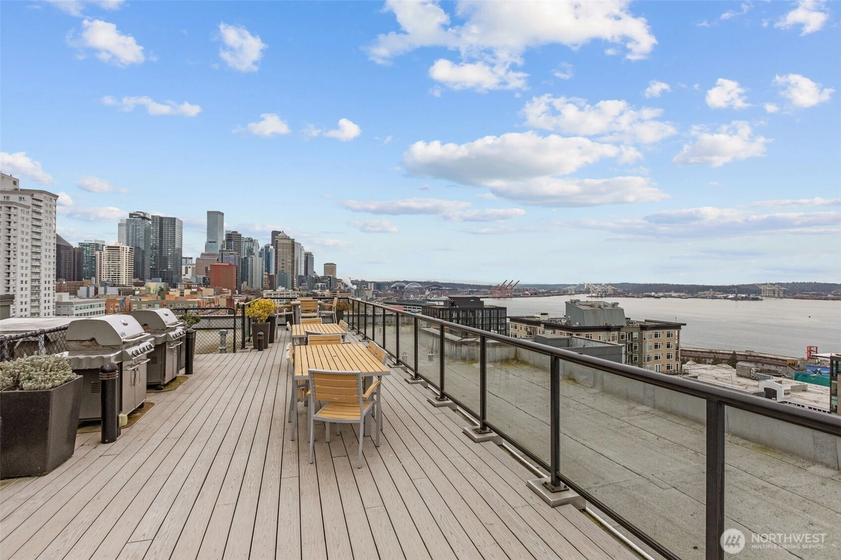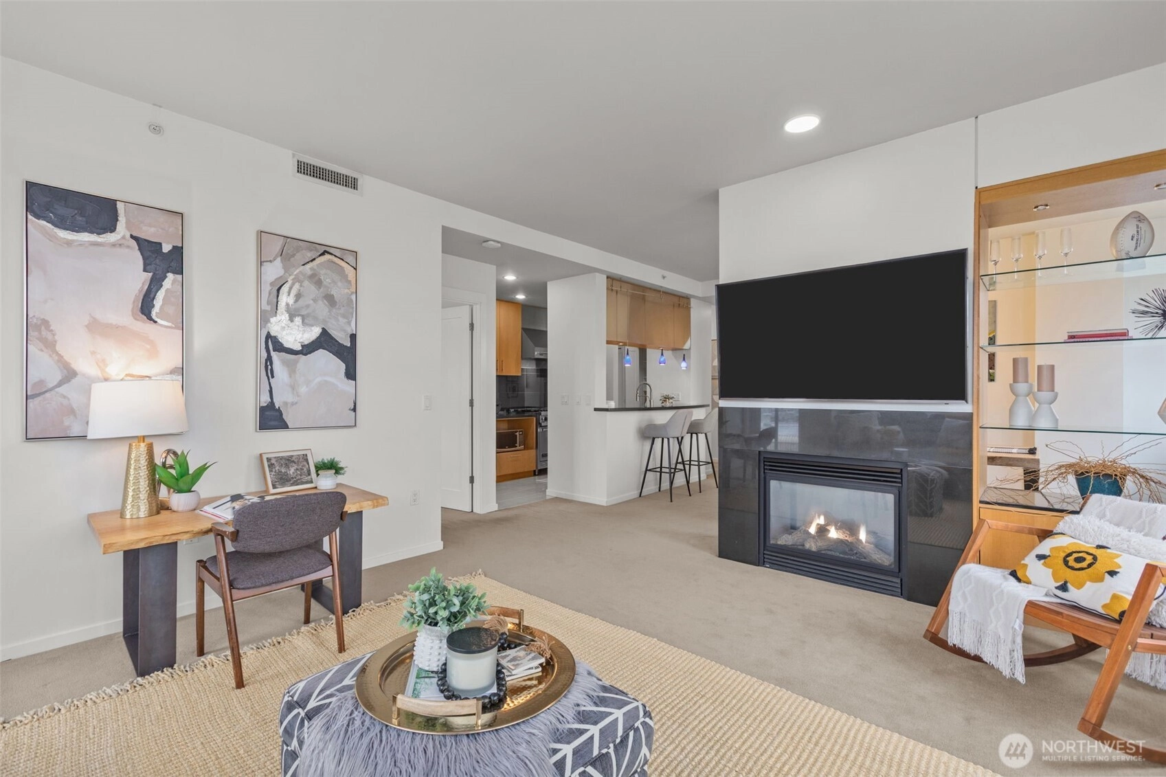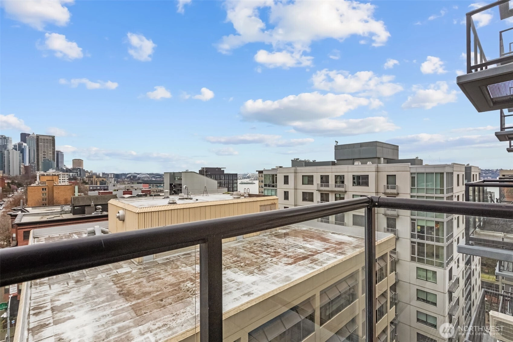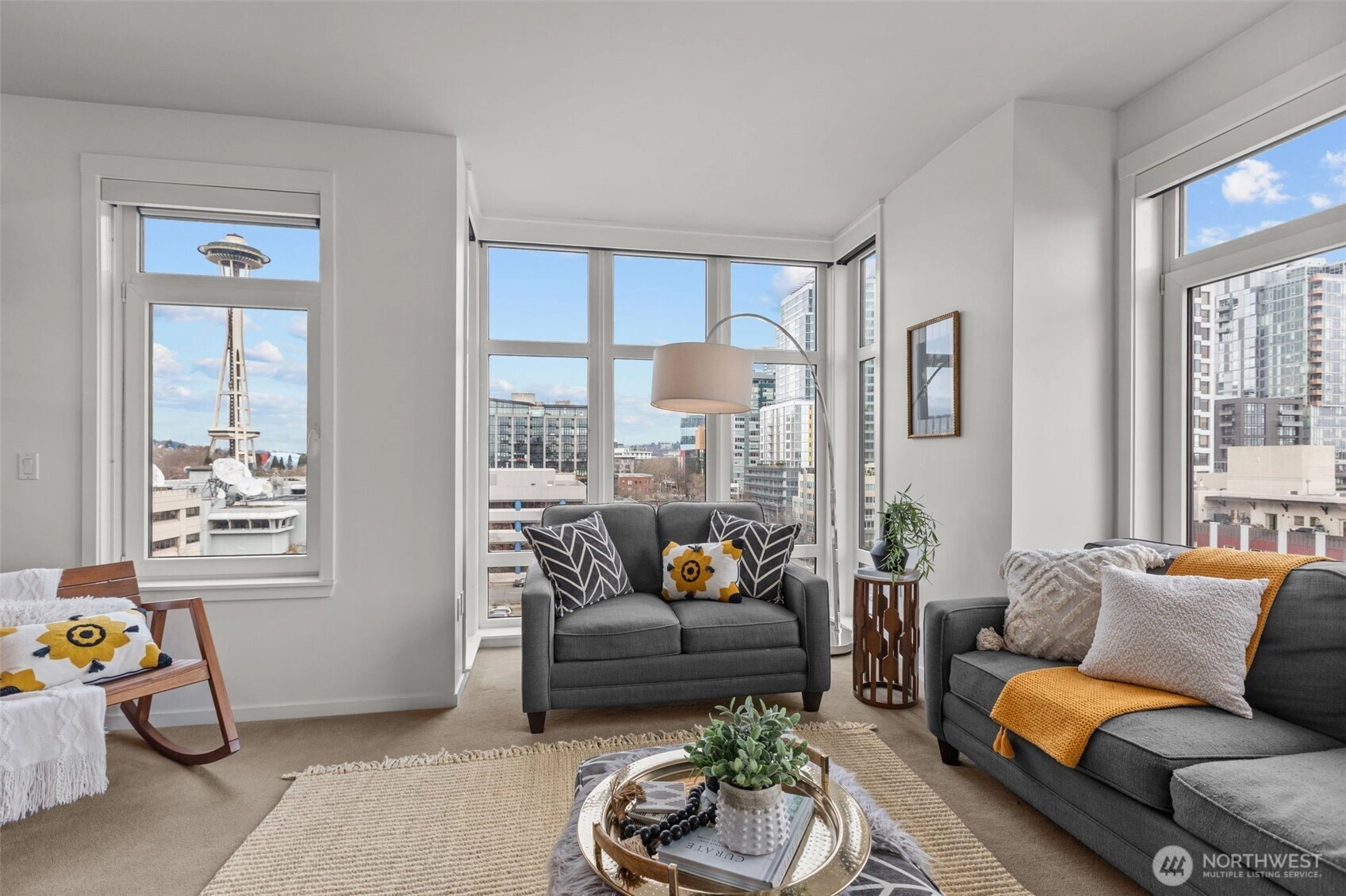 Own Iconic Space Needle views from this 10th-floor, 2-bedroom residence in sought-after Avenue One. Ideally located within walking distance to downtown, and the new waterfront park, this home offers the best of city living while providing a peaceful retreat from the street below. The open-concept layout is filled with natural light and features a gourmet kitchen with Viking gas range, stainless steel appliances, and slab granite countertops. Open concept living space, ideal for entertaining. The primary suite includes California Closets, while the second bedroom offers flexibility with a Murphy bed and built-in desk. Additional features include central A/C, in-unit laundry, storage, and 2 secure parking spaces. Full-service building amenities include concierge, club room, fitness center, guest suite, and a rooftop deck with panoramic city and water views.