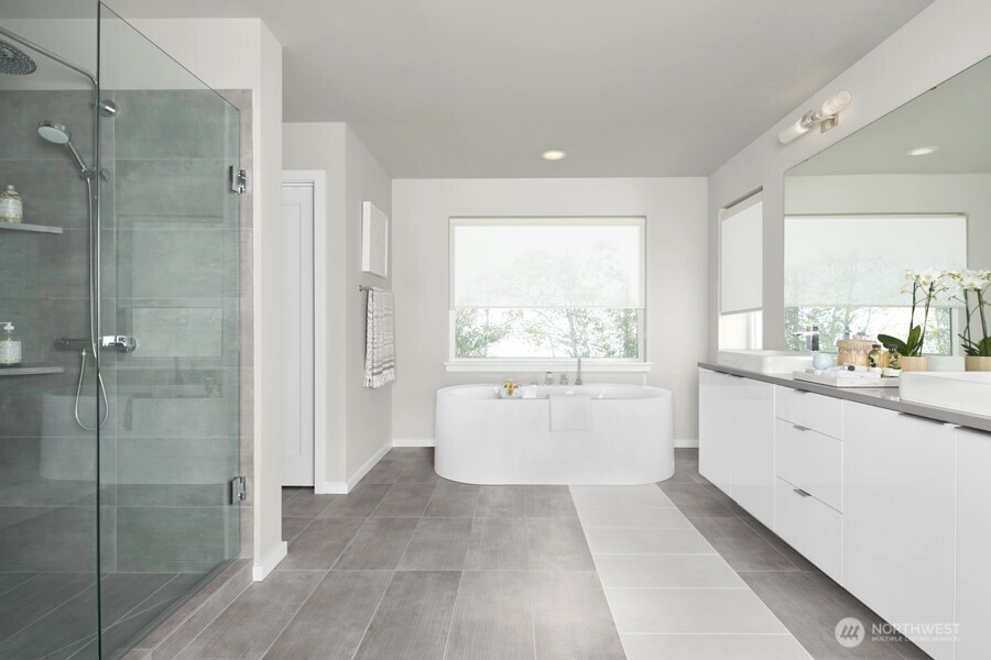 The Maple V5 at Eaglemont Community with MainVue Homes in Monroe is a luxury three-story home featuring a 3-car garage and a double-story Foyer on the lower floor. A Home Office at the front of the home offers direct access to an expansive covered deck, seamlessly connected via wall-height sliding glass doors. At the heart of the home, the centralized Gourmet Kitchen boasts a 3cm Quartz-capped island, a Grand Butler’s Pantry, and an additional walk-in pantry for extra storage. The Multi-Purpose Room on the main floor provides flexible living space with access to the Signature Outdoor Room. The Grand Suite is a private retreat with a double-door entry, a spacious dressing room, a free-standing tub, dual vanities, and a frameless shower.