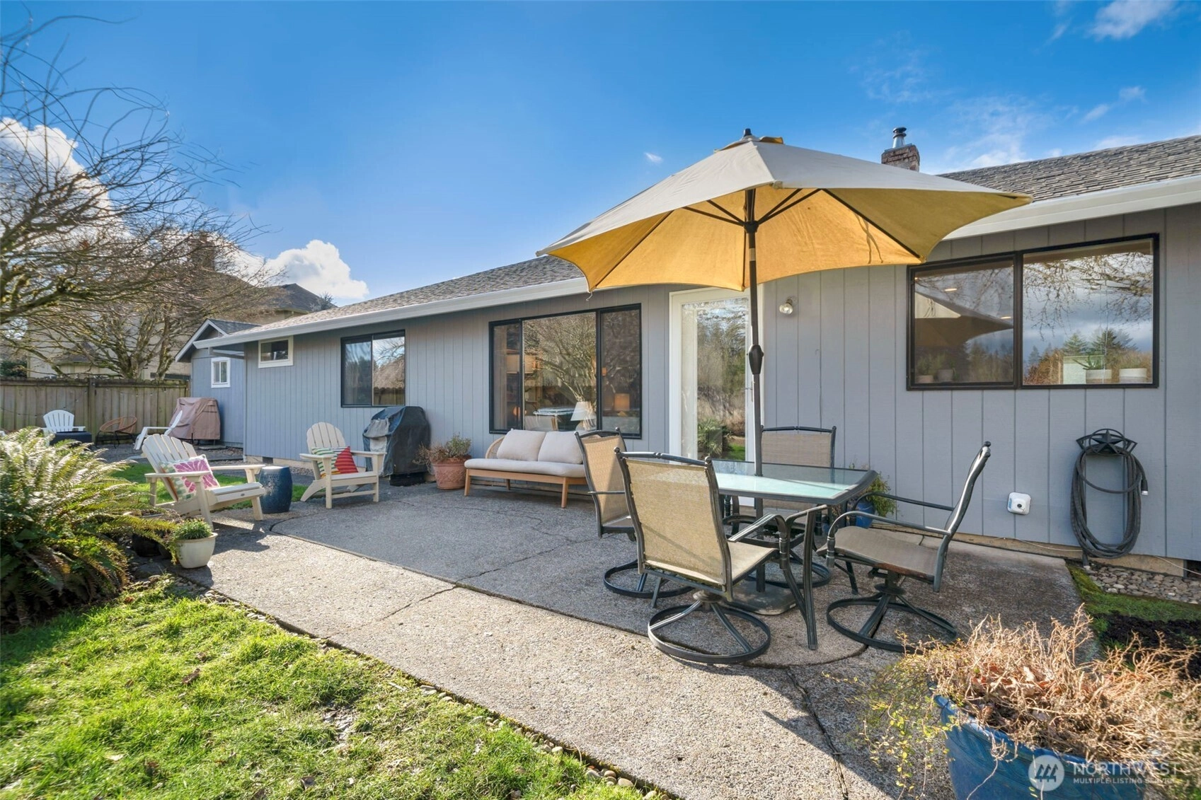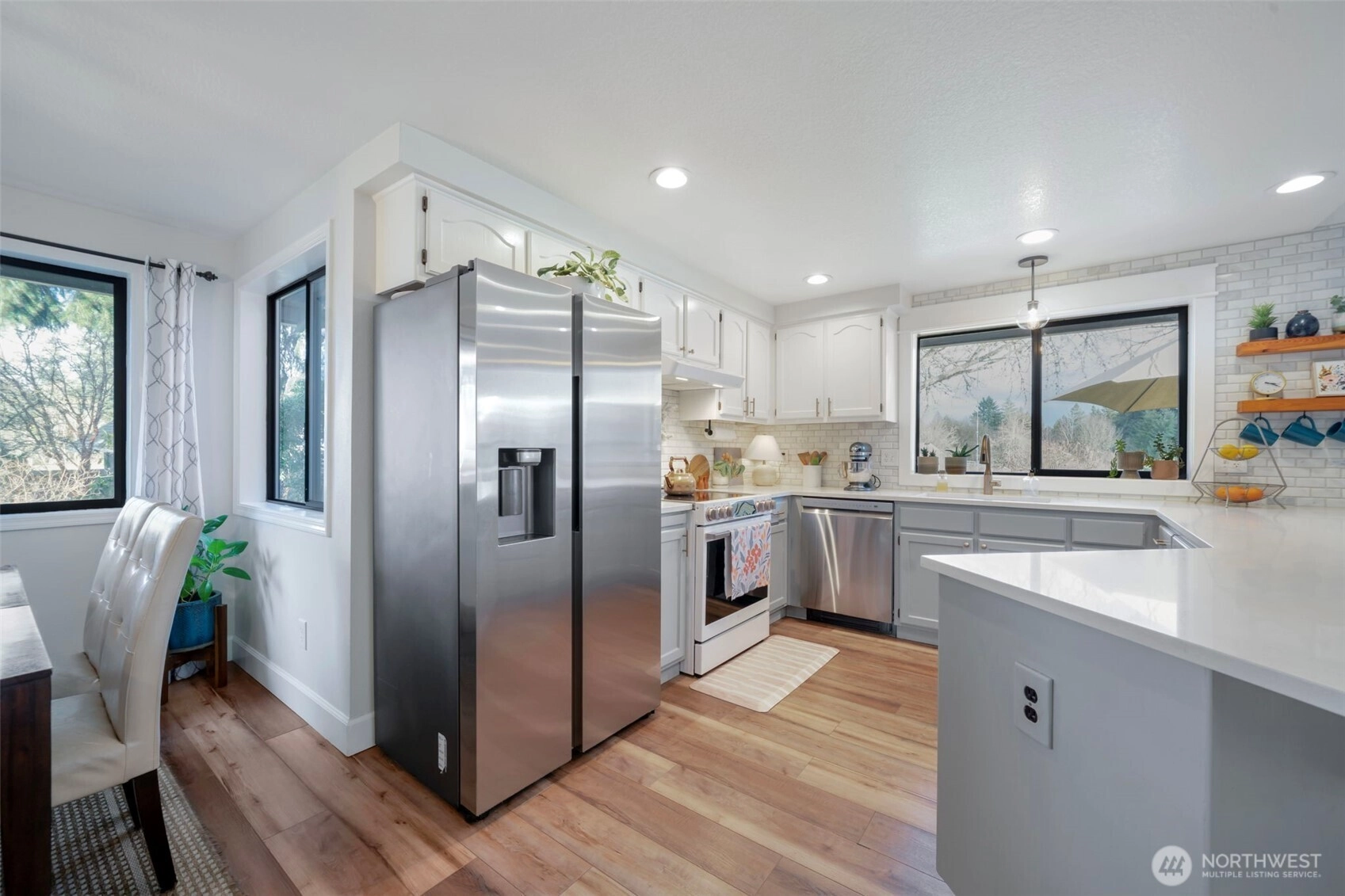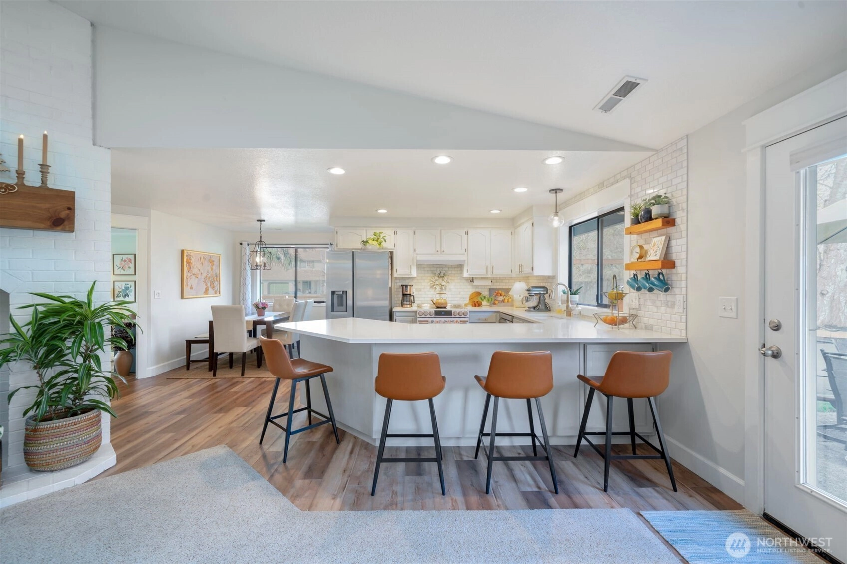 Tucked away at the end of a quiet dead-end street in Ridgefield, this secluded corner-lot retreat offers the perfect blend of privacy, comfort, and refined style. From the moment you arrive, manicured landscaping and undeniable curb appeal set the tone for what awaits inside. This beautifully maintained single-level home features 3 bedrooms, 2 full baths, and a spacious 2-car garage, thoughtfully designed for effortless living.Step inside to discover lvp floors flowing through open-concept living areas, where vaulted ceilings in the great room create an airy, light-filled ambiance. The kitchen is a true showpiece, highlighted by striking two-tone cabinetry—crisp white uppers paired with sophisticated grey lowers—complemented by white quartz countertops and sleek stainless steel appliances. An inviting eating bar and charming breakfast nook make everyday living and entertaining seamless.The private primary suite offers a full en-suite bath for your own tranquil escape. Outside, the oversized patio overlooks a large, level, fully fenced backyard—ideal for gatherings, play, or peaceful evenings under the open sky. Rarely does a home combine such seclusion, thoughtful design, and modern elegance in one exceptional setting.