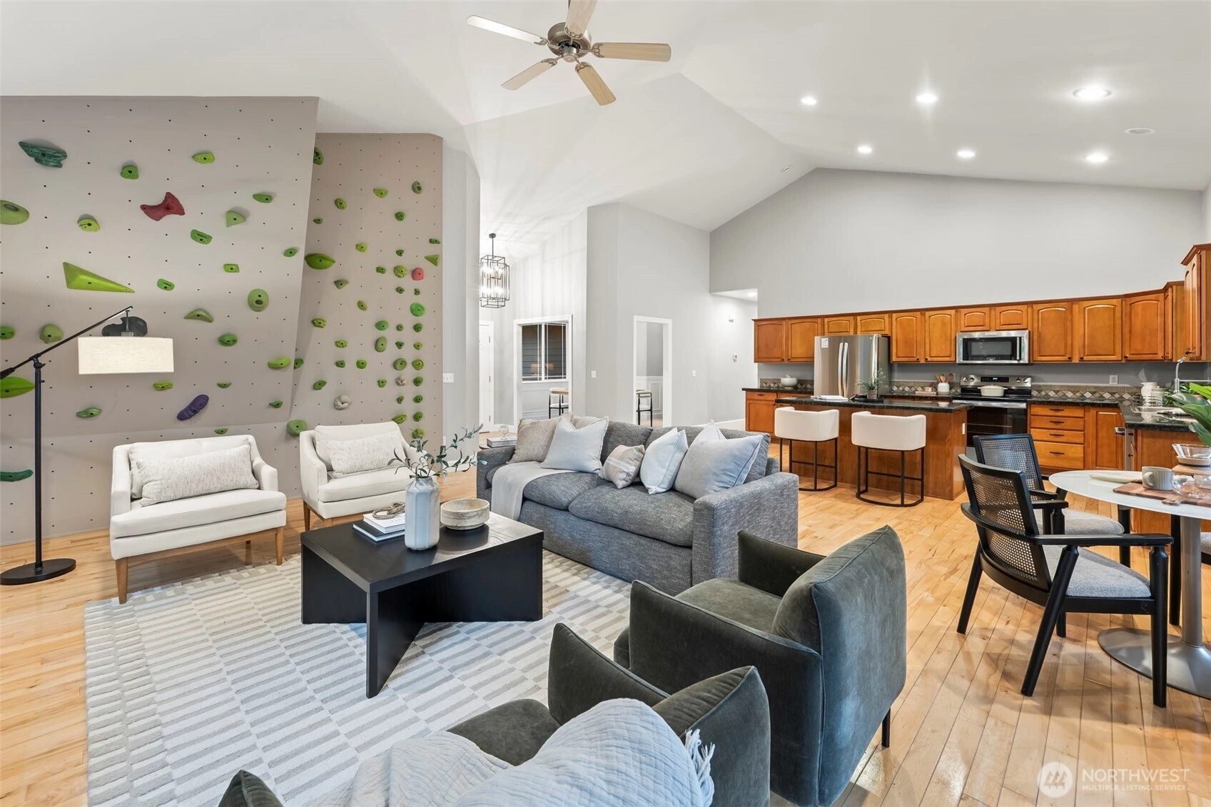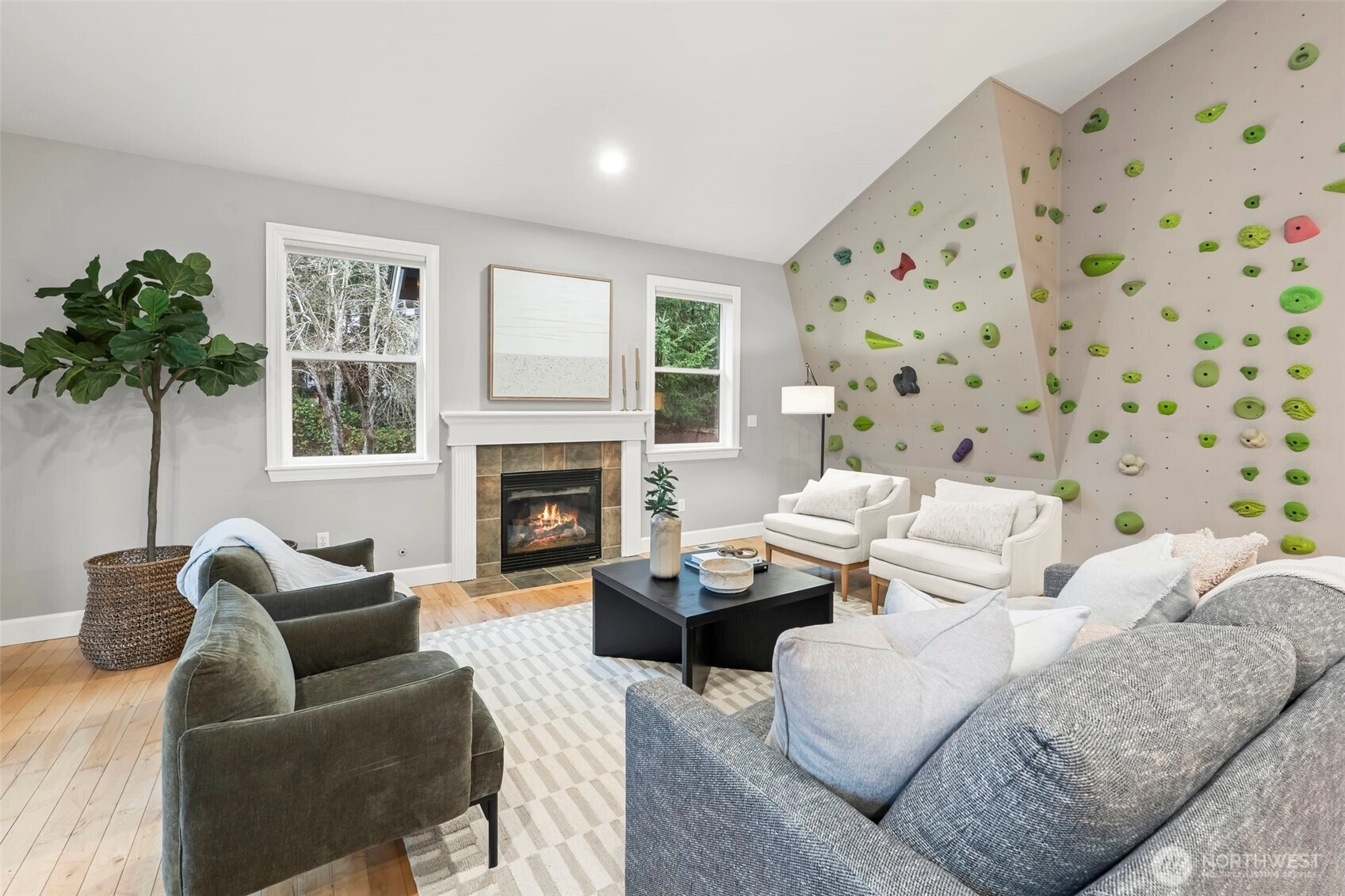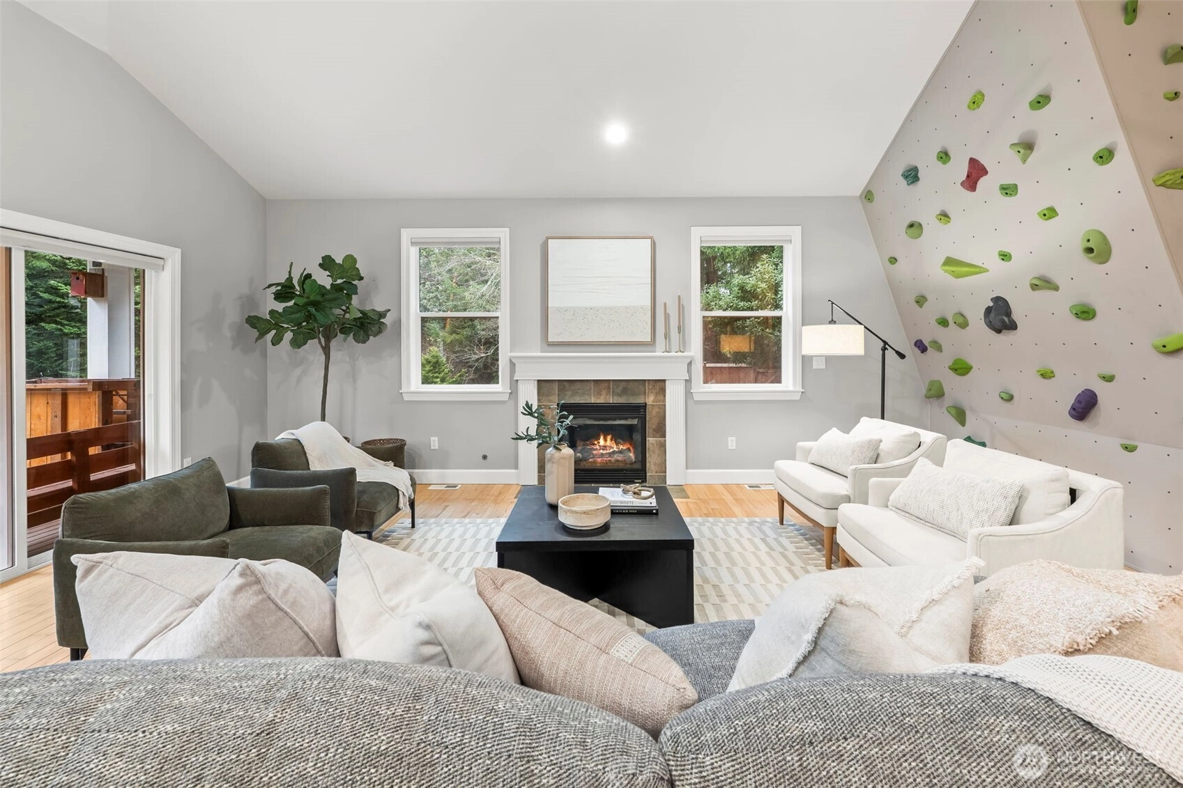 Welcome to this charming Fox Island home, perfectly designed for comfortable living. Set on a beautiful, spacious lot, the large backyard offers endless room to play and gather. Enjoy peek-a-boo Sound views from the deck, while inside, tall vaulted ceilings and a cozy gas fireplace create an inviting living space for movie nights and everyday moments. The open-concept layout keeps everyone connected, and a fun indoor rock wall to keep everyone entertained. The lower level includes a bonus room complete with wiring for projector and HDMI. Additional private studio space—ideal for a home office, or creative area. Fully fenced yard with plenty of space, plus a 2-car attached garage wired for an electric car. Experience the close-knit Fox Island lifestyle just minutes to Bella Bella Beach, Zog’s Pub, and local favorites—where memories are made at home and beyond.